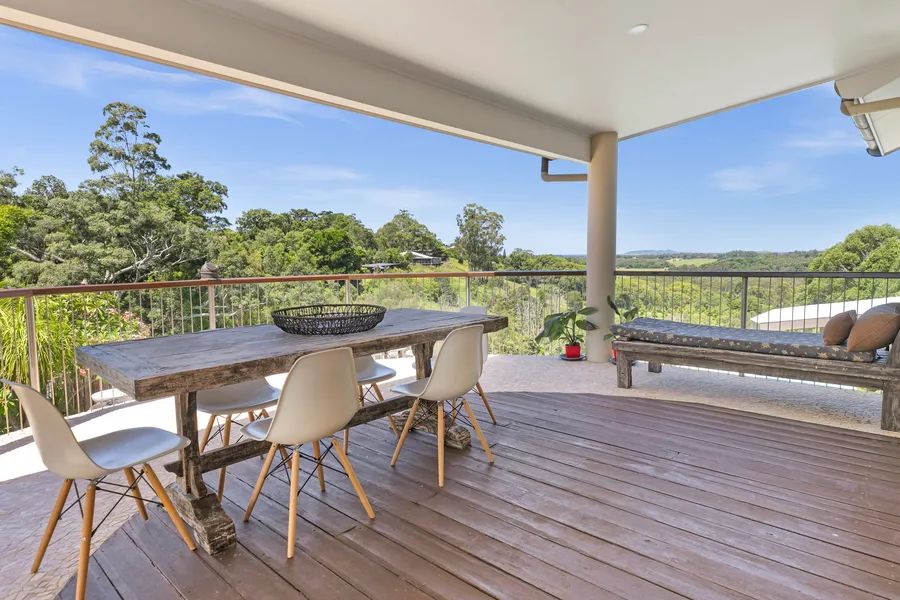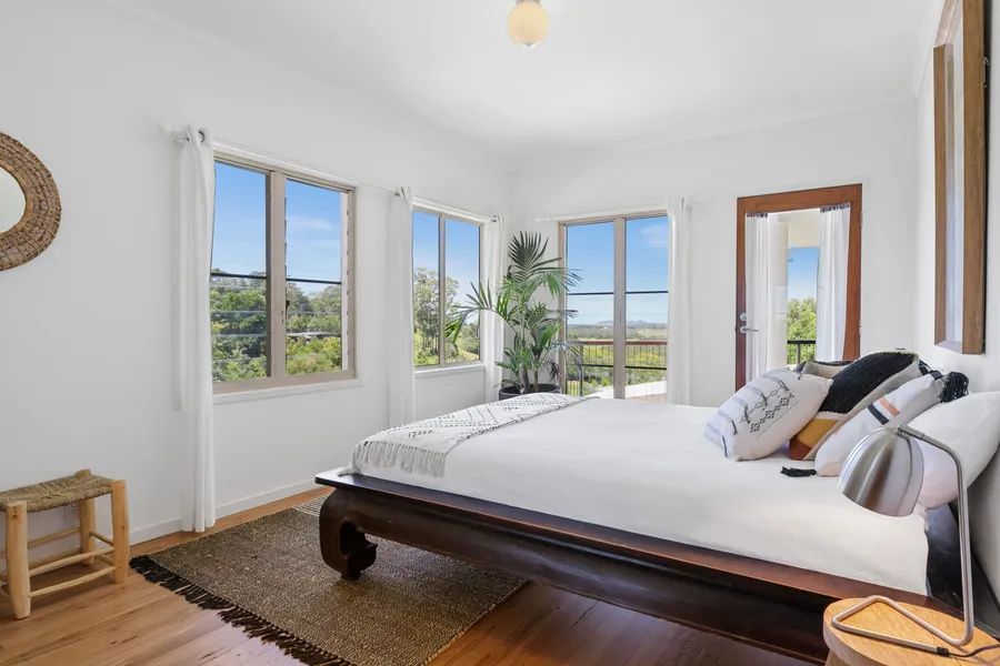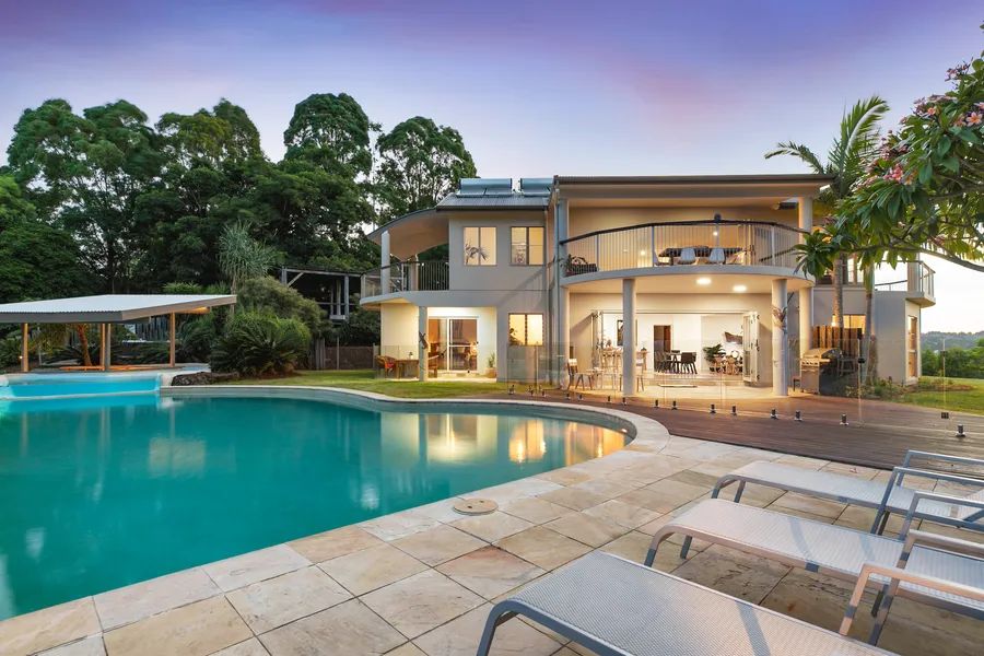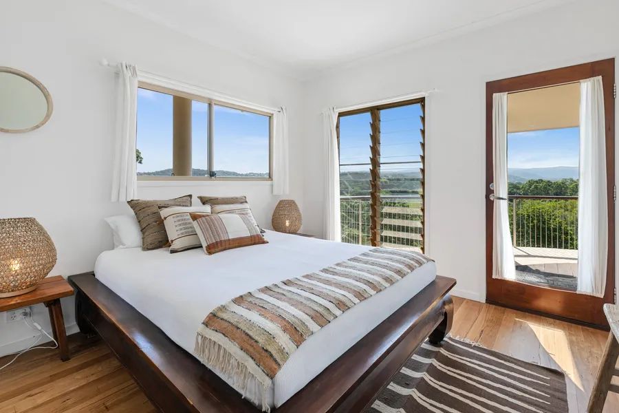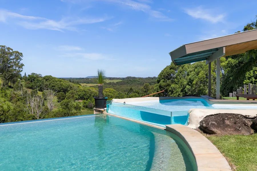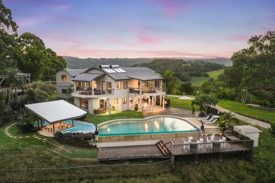A master built home, this 3.91HA (10 acre) property captures magnificent mountain views to the Nightcap Ranges, including Mount Warning, and ocean and lighthouse views to Byron Bay coastline and Julian Rocks.