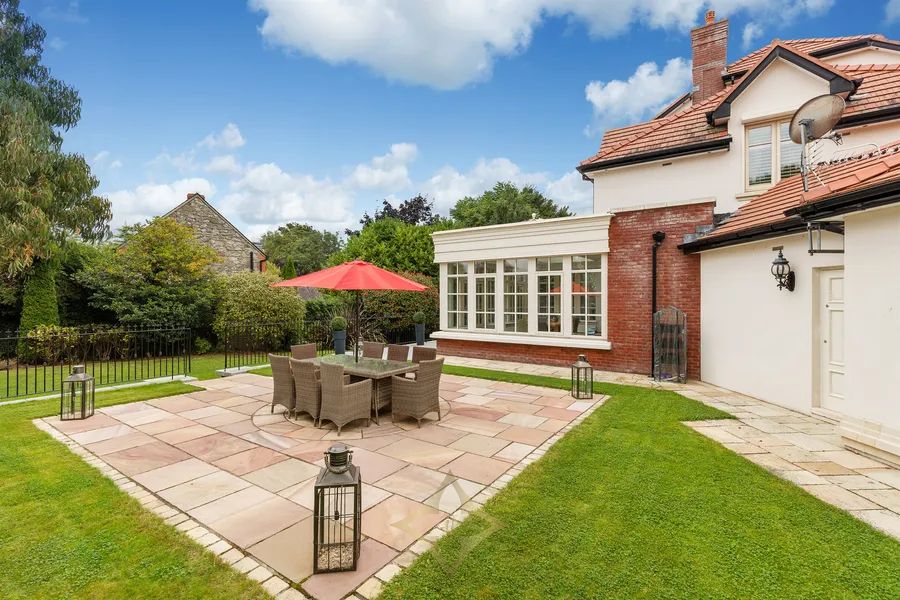 Approached by custom designed electronic front gates with intercom access. Gravel driveway and excellent off street parking, with direct access to the Double Garage. The mature hedgerow gives privacy to front. The gardens are professionally landscaped, private with three patio areas – one in the greenery of the garden, one outside the drawing room double doors and one with direct access from the orangery/kitchen area. The gardens are well planted with colourful plants and mature shrubbery.