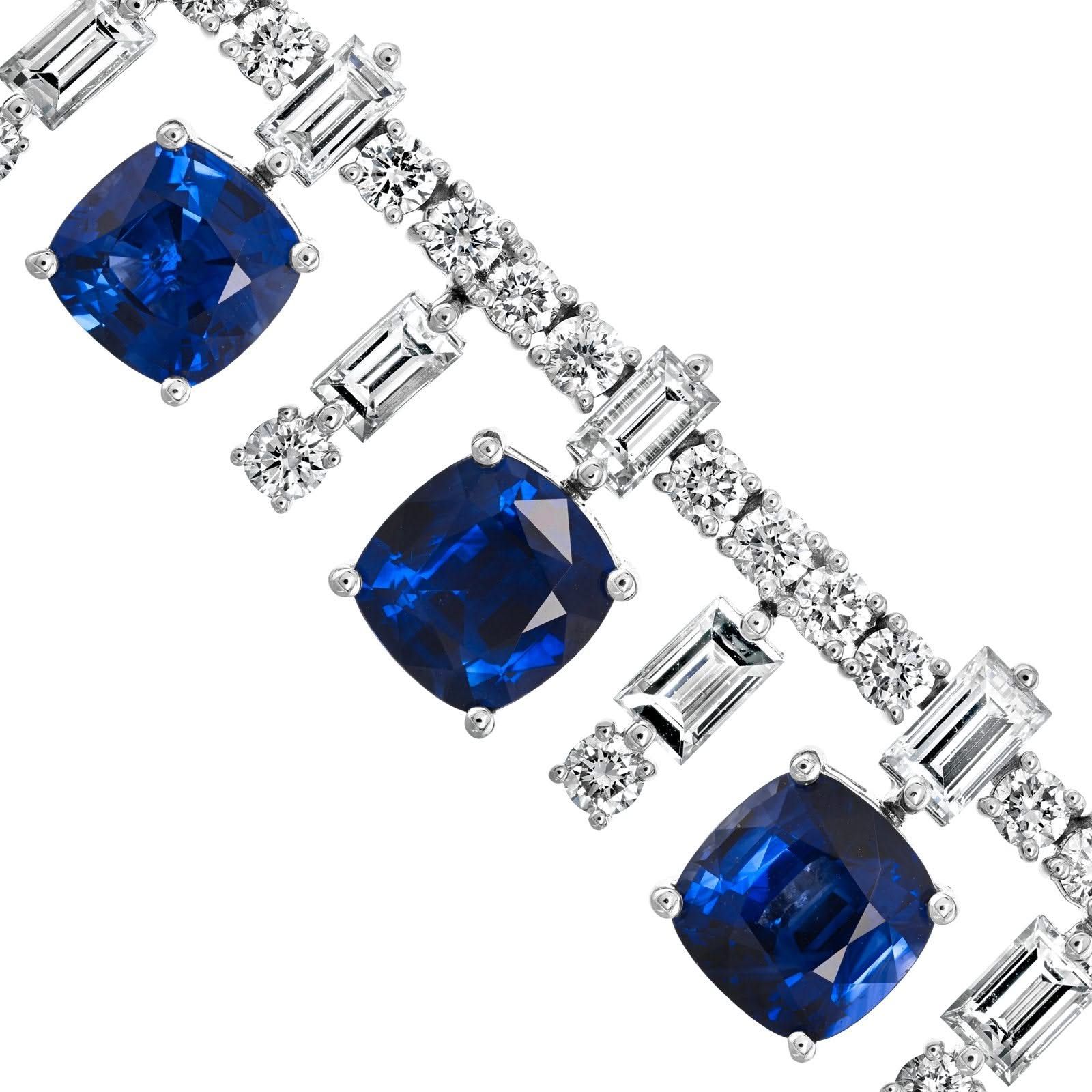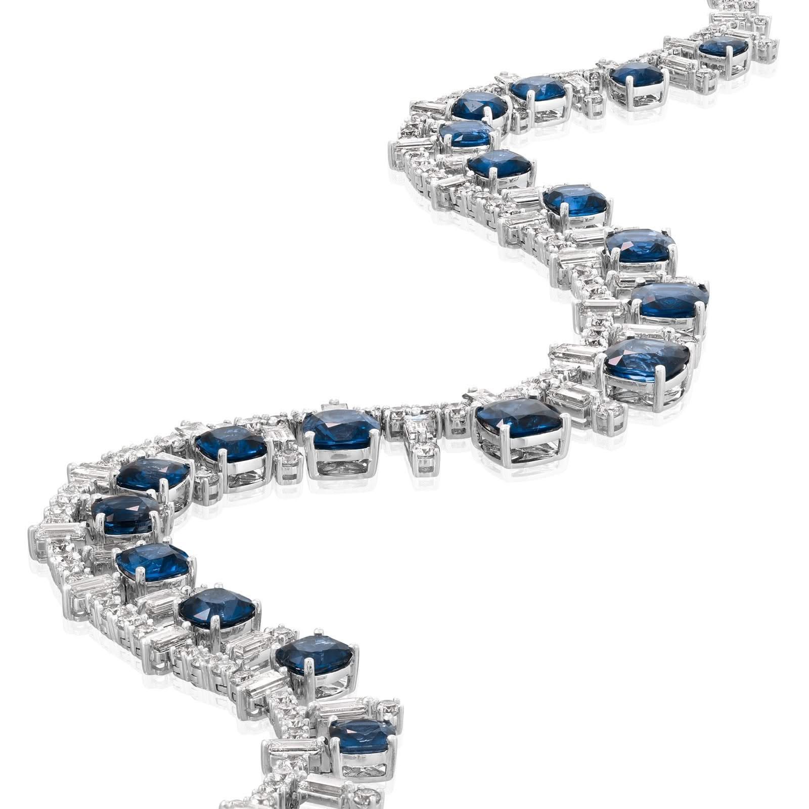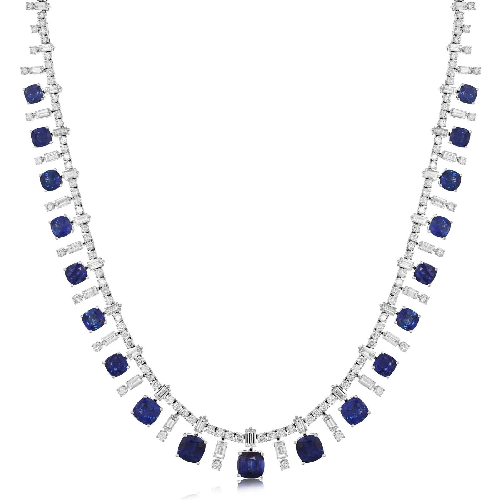 18K white gold sapphire and diamond necklace from the Reis-Nichols Collection. The necklace features 19 cushion cut sapphires weighing 19.43 ctw and 241 round brilliant cut diamonds weighing 12.15 ctw. The necklace is 17'' in length. Pricing may vary depending on size and materials.
