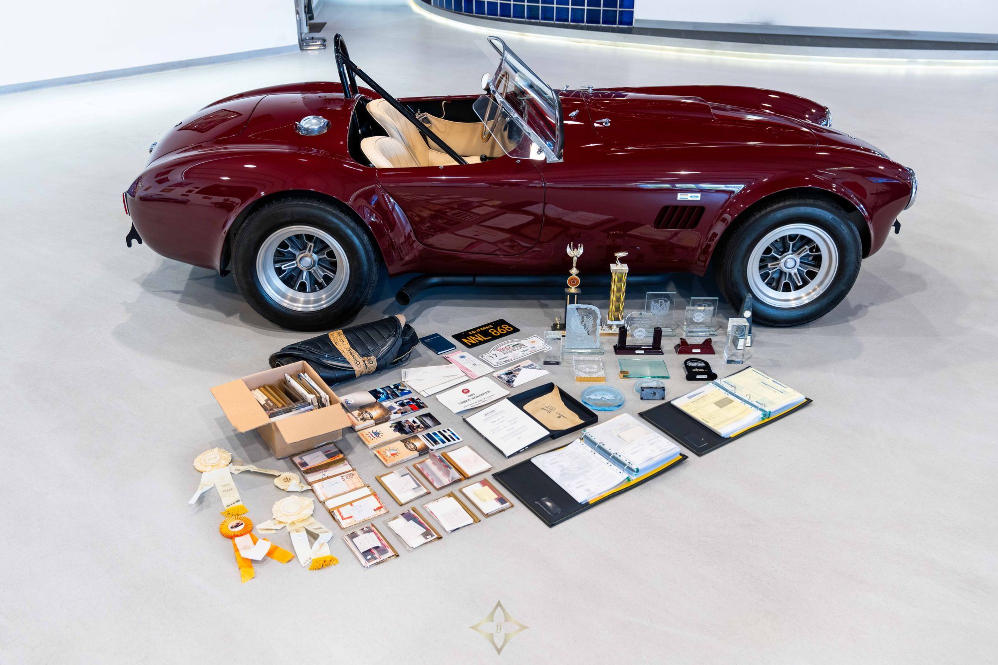 This particular Cobra was invoiced to Shelby American on May 14, 1964, and shipped to the United States just twelve days later aboard the SS Diemerdyk, notably, the first Holland America Line vessel constructed after World War II. Originally specified in the striking combination of Rouge Iris over Beige and ordered with the desirable Class A accessories package, this Cobra included five chrome wire wheels, whitewall tires, a luggage rack, external rear-view mirror, AM-FM radio, and antifreeze. The factory invoice totalled $5,800.05.