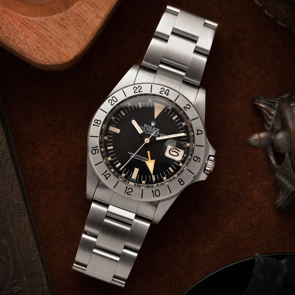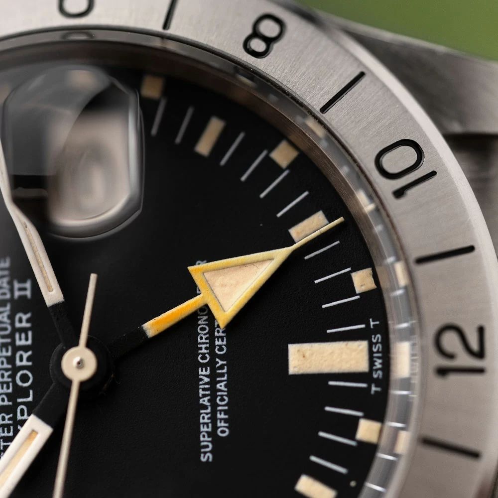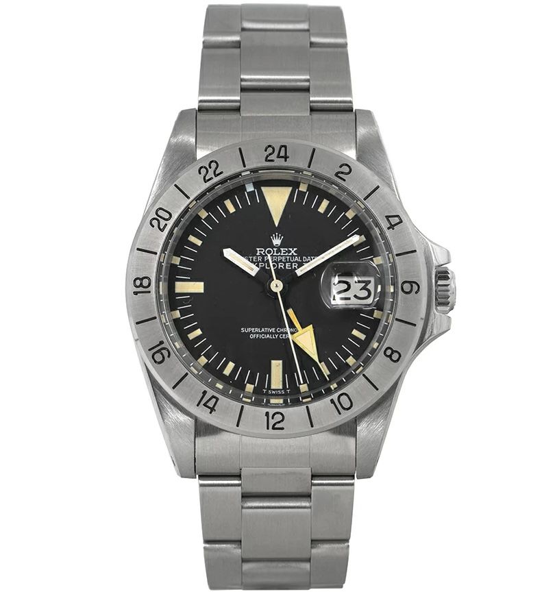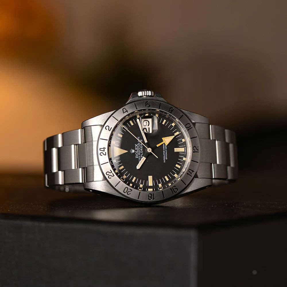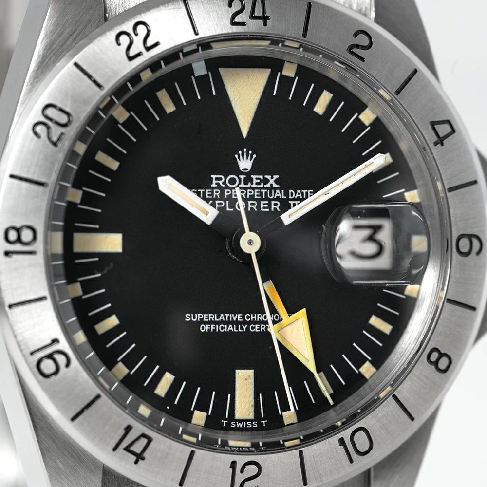 Introduced in 1971, the Rolex Explorer II was intended for use by scientists and explorers that work in environments without a visible day-night cycle – like underground or above the arctic circle. The unusual design and limited appeal led to relatively lower sales, which has now contributed to the rarity and collectivity of the model. This example, dating to the first year of release, features its original dial and hands that have aged to a lovely patina and are in excellent condition. The movement has been fully serviced, and the original case has been restored by LA Watchworks. The bracelet is a modern Rolex service replacement, but the original (and very rough) folded-link Oyster bracelet will be included.