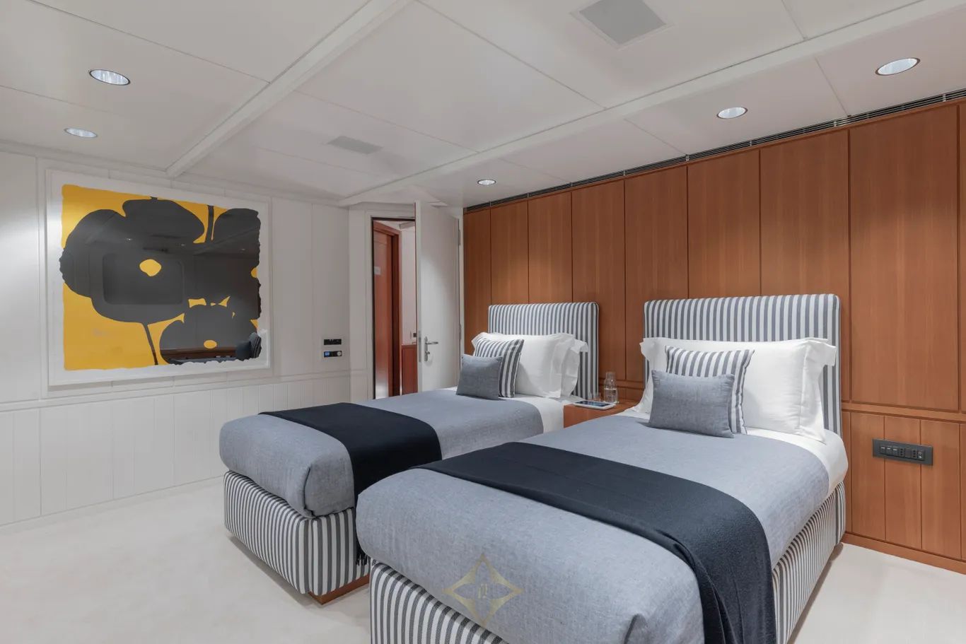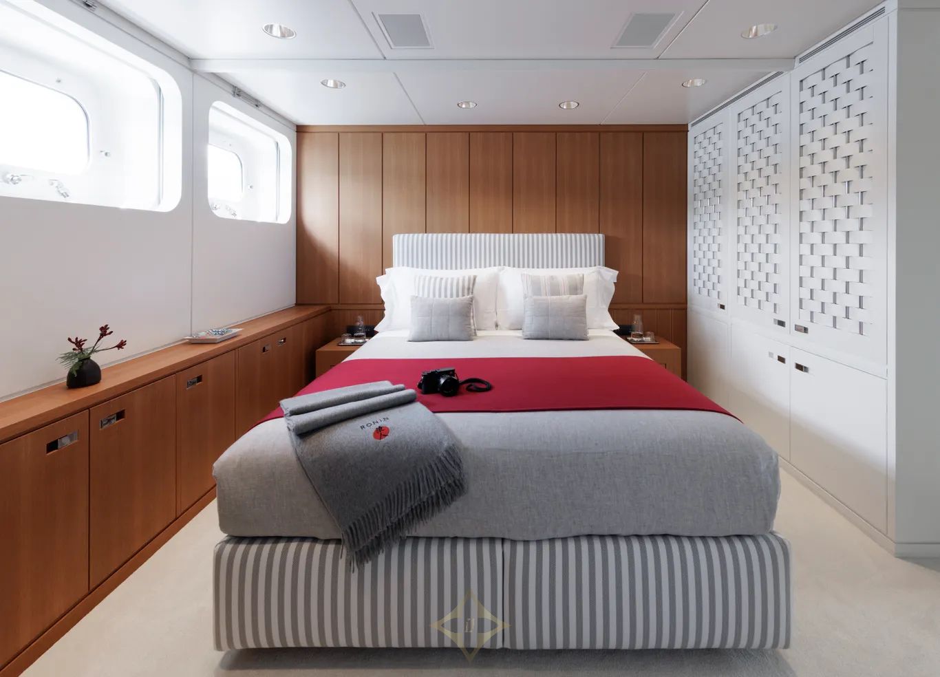 RONIN for sale Lurssen ASKING PRICE: €28,500,000 LENGTH: 58.5 m BUILD YEAR: 1993 TOP SPEED: 30 kn BEAM: 9 m GT: 625 GUESTS: 10 LOCATION: Genoa, Italy The Norman Foster architecture is unique, striking and distinctive. The angular shapes and unusual deck layouts set the yacht apart. Her distinctive profile immediately commands attention. Built by Lurssen, launched in 1993, and benefitting from a significant 16.5 million EUR refit, Ronin is outstanding. Accommodating up to 10 guests in five cabins and boasting a light, bright interior, the yacht was made to explore without compromise to onboard comfort. The generous onboard areas are calming, light and bright. The large windows fill the space with natural light. The exterior spaces allow for a connection with the surroundings while offering protection from the elements, with an indoor/outdoor vibe. The upper deck features a large dining table which is covered, making it an all-weather, all-day space.Guests are able to soak up the sun on the large sun pads aft of the sun deck, or enjoy uninterrupted views from the loungers forward. There is also an on-deck basketball net for leisure and competition at sea. Ronin has been extensively well maintained and upgraded including a hull repaint in 2025 and rebuilt engines; she is presented in immaculate condition. SPECIFICATIONS OVERVIEW Name: RONIN Yacht Type: Motor Yacht Builder: Lurssen Exterior Designer: Sir Norman Foster Interior Designer: Laura Seccombe Refits: 2023-01-01 DIMENSIONS Length Overall: 58.5 metres Length at Waterline: 53.58 metres Beam: 9 metres Max Draught: 2.65 metres Gross Tonnage: 625 Displacement Tonnage: 477 CONSTRUCTION Builder: Lurssen Year of Build: 1993 Hull Number: 13573 Hull Type: Deep V / Planing Number of Decks: 3 Classification: ABS PERFORMANCE & CAPACITIES Max Speed: 30 kn Cruising Speed: 18 kn Fuel Capacity: 130000 litres Water Capacity: 26000 litres Range: 3200 nm @ 18 kn ENGINES Engine Make: MTU Total power: 11750hp MATERIALS Hull: Aluminium Superstructure: Aluminium Deck: Teak ACCOMMODATION Guests: 10 Passenger Rooms: 5 Master Rooms: 1 Double Rooms: 2 Twin Rooms: 2 ——— Y.CO - The Yacht Company 17 AVENUE ALBERT II,, Monte-Carlo, Monaco CONTACT BEN BARTLETT Yacht Sales | Monaco PHONE: +377 93 50 12 12