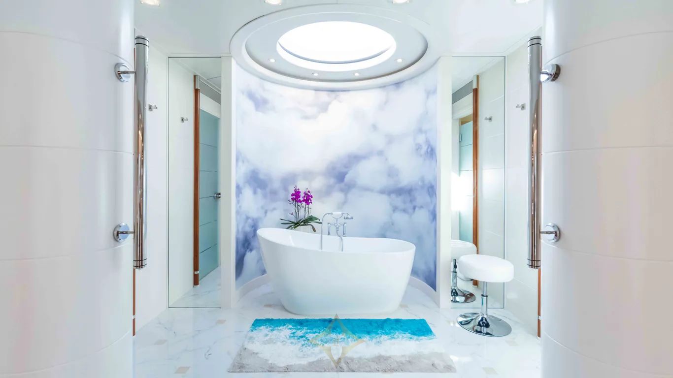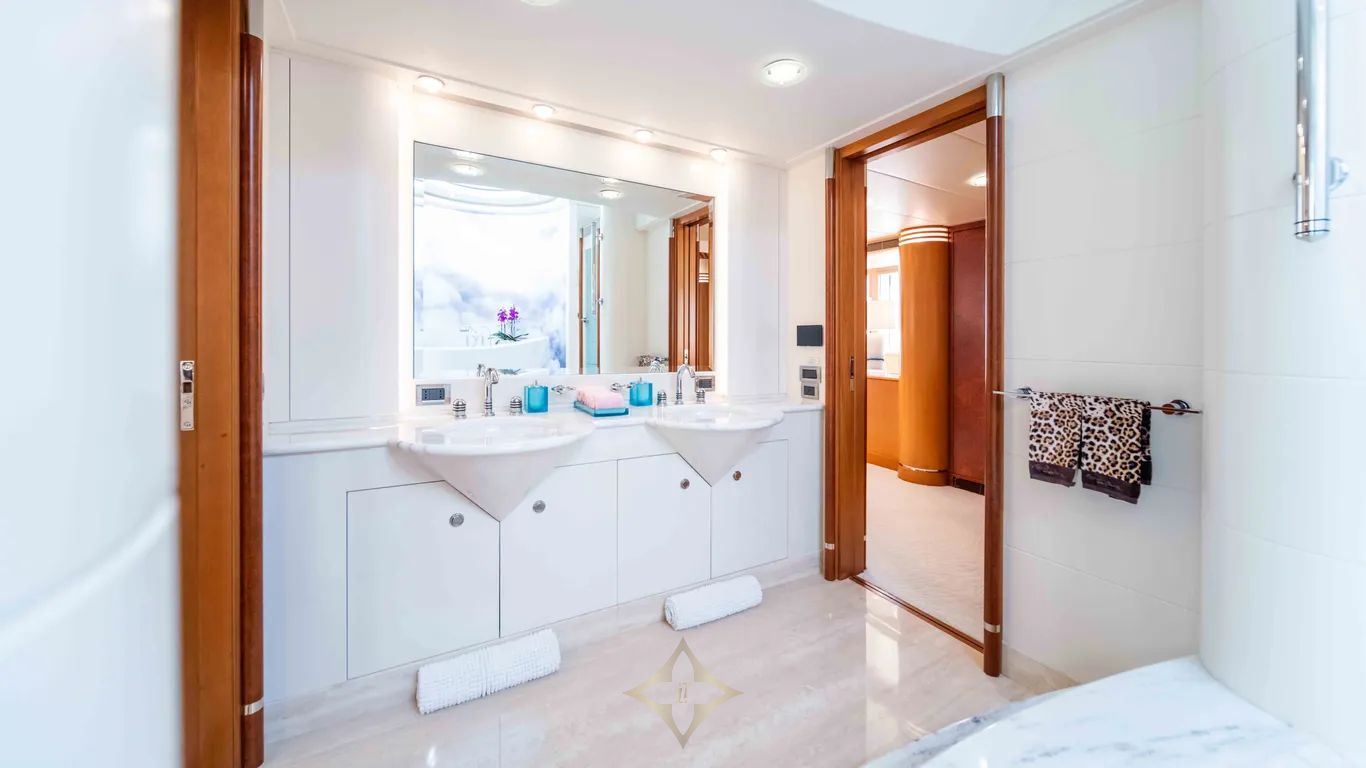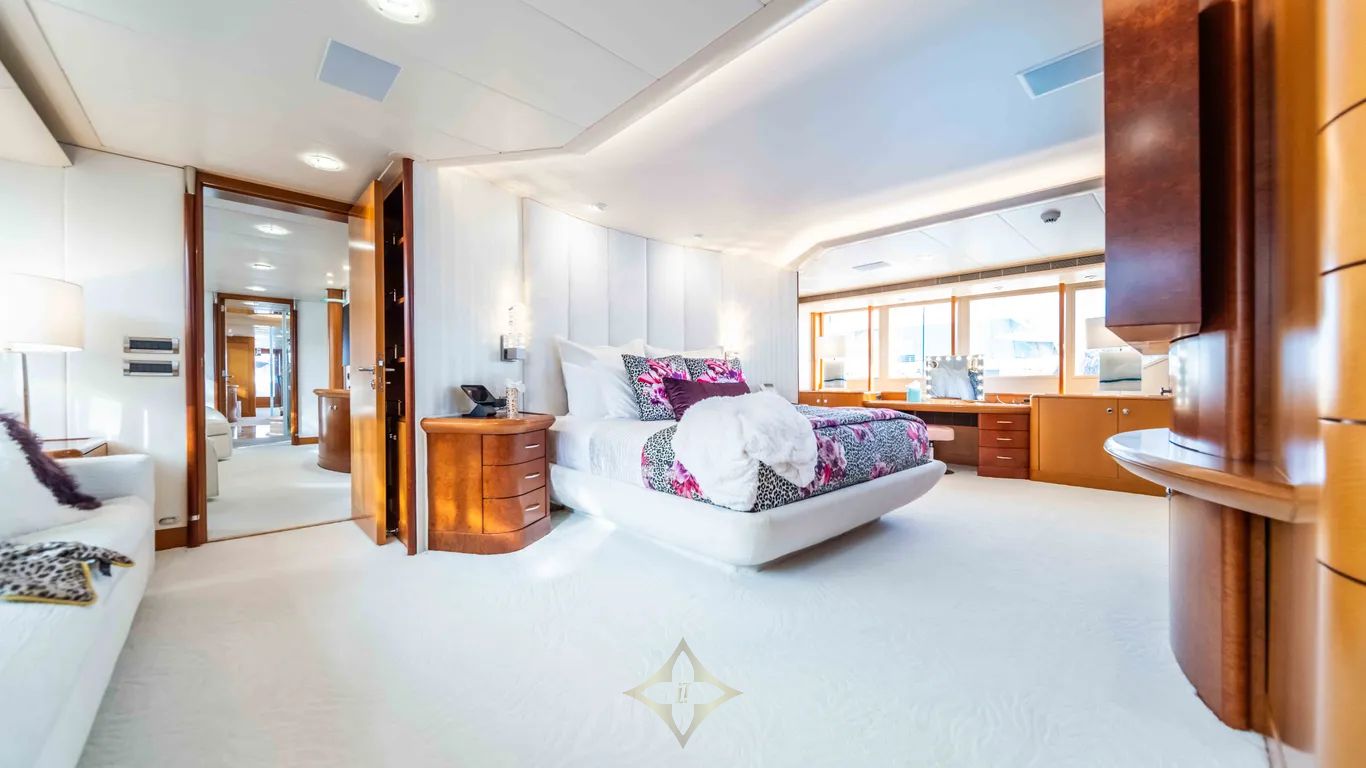 Onboard, TASIA offers luxurious accommodations with 5 staterooms for 10 guests, including a spacious full-beam master suite that ensures privacy and tranquility. Each guest stateroom is meticulously designed to deliver both comfort and style, featuring ensuite facilities and sophisticated décor. The layout is optimized for entertainment and relaxation, with an expansive main salon, formal dining area, and multiple al fresco spaces.