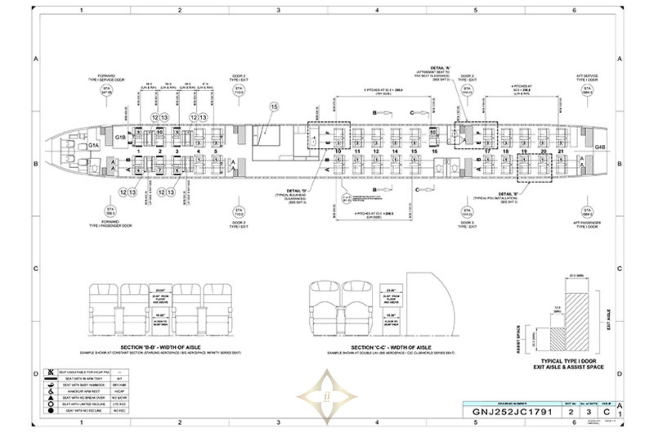 • Seven (7) cabin attendant seats (2 at door 1, 2 at door 2L, 2 forward of door 4L, 1 forward of door 3R).