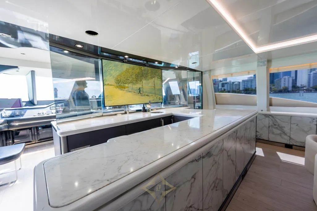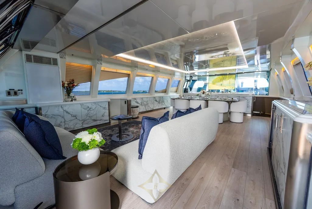 Step Into A Modern, Minimalistic Interior With High-end Materials And Panoramic Views Through Large Salon Windows. The Main Salon Is Open And Airy, With A Relaxed Yet Refined Atmosphere. It Includes Plush Lounge Seating, A Formal Dining Area, And A Retractable Flat-screen TV.