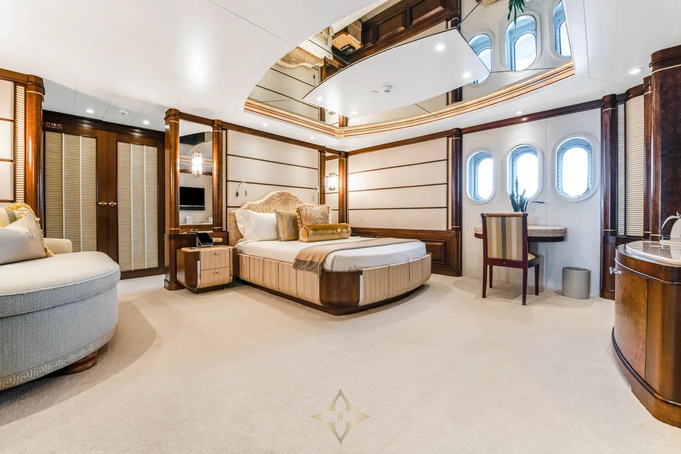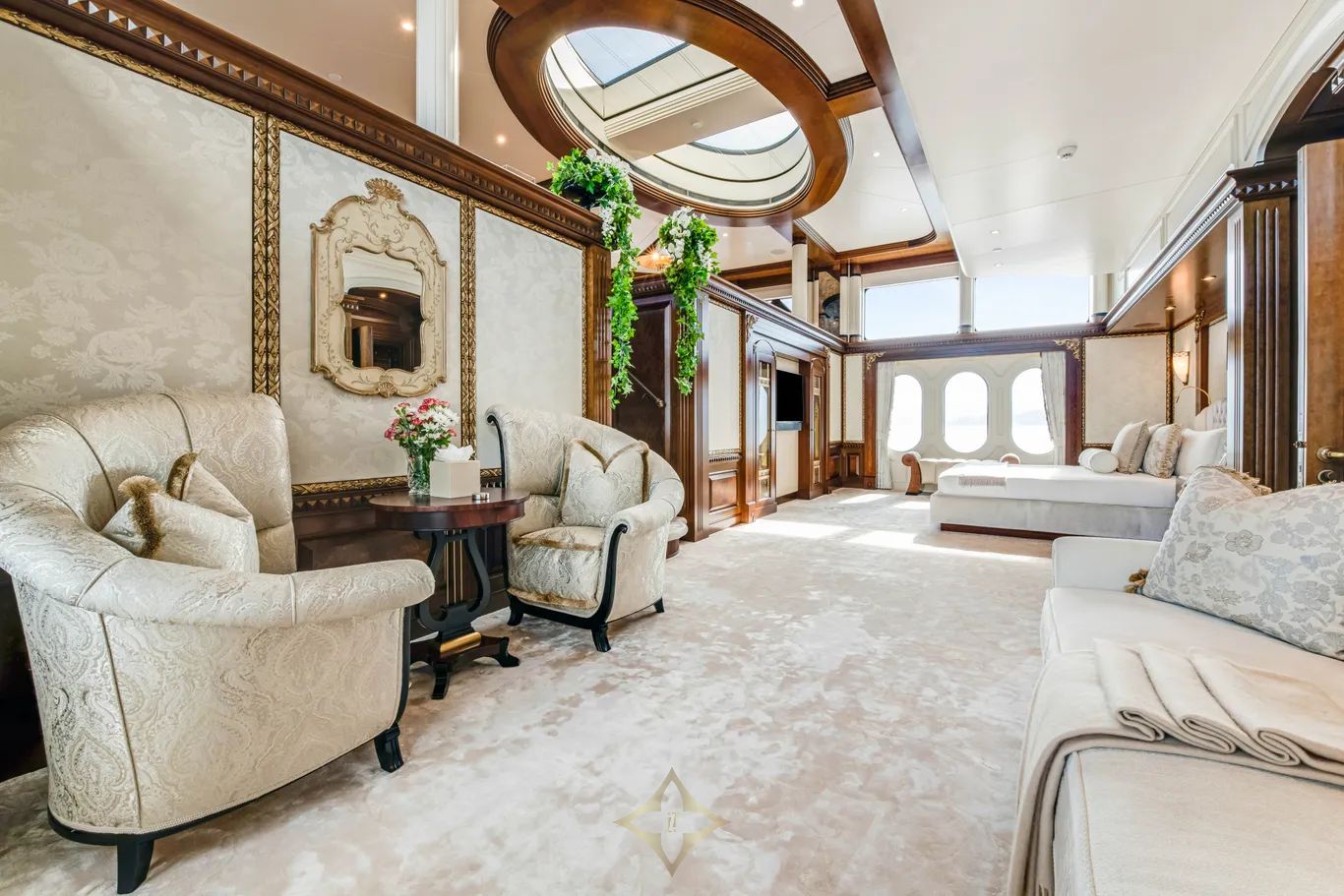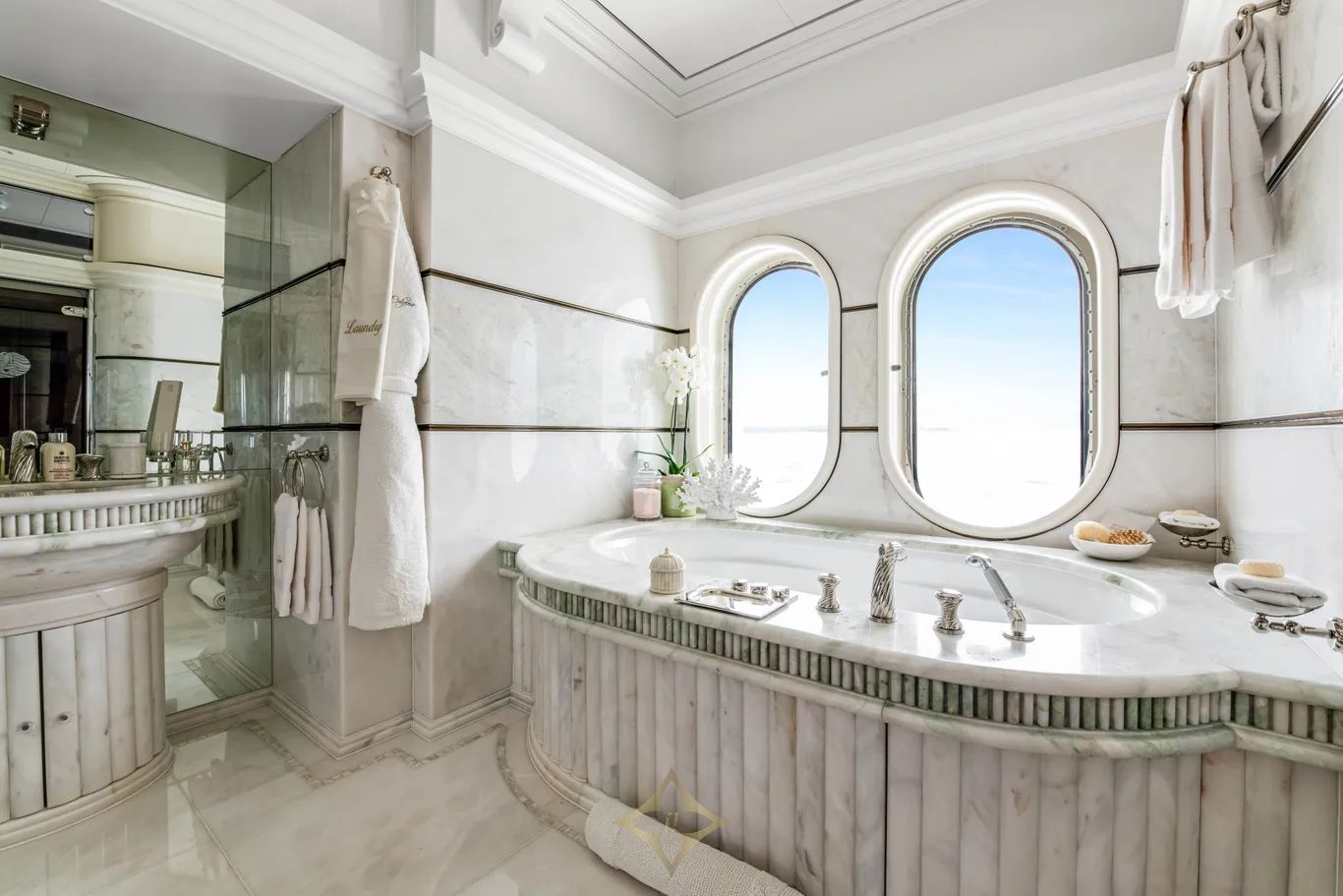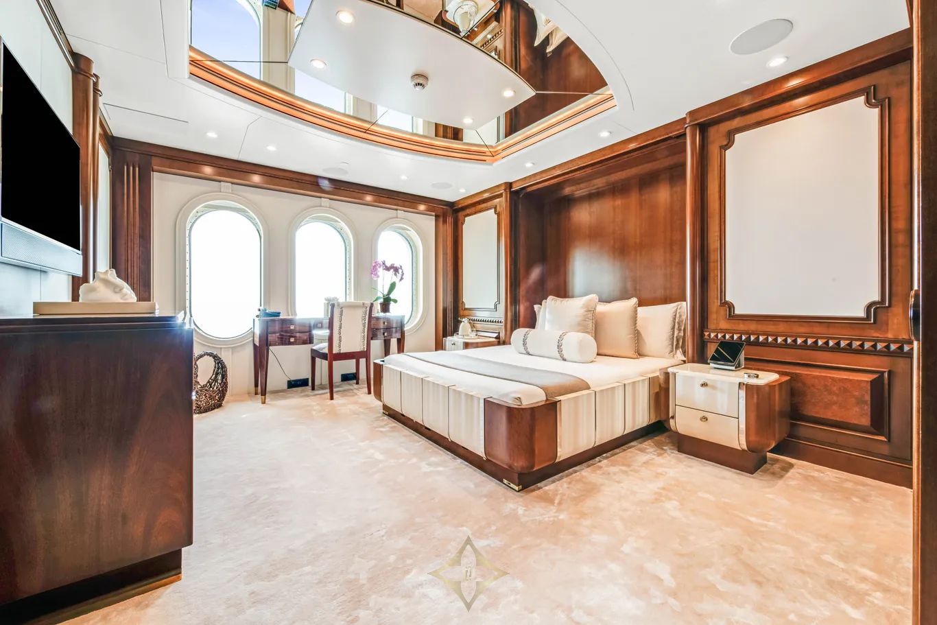 Stepping aboard, the first impression is her extraordinary sense of space compared to other yachts her size. Designed with comfort in mind, every area feels expansive and indulgent, with unobstructed views of the ocean. Privacy is number one priority and separate crew entrances ensure discreet service at all times. One of the yacht's highlights is her full-beam, two-level master suite. Flooded with natural light from its overhead skylight, this suite is a true standout of the yacht.