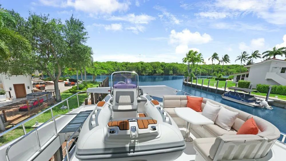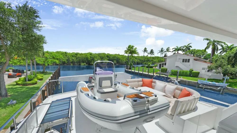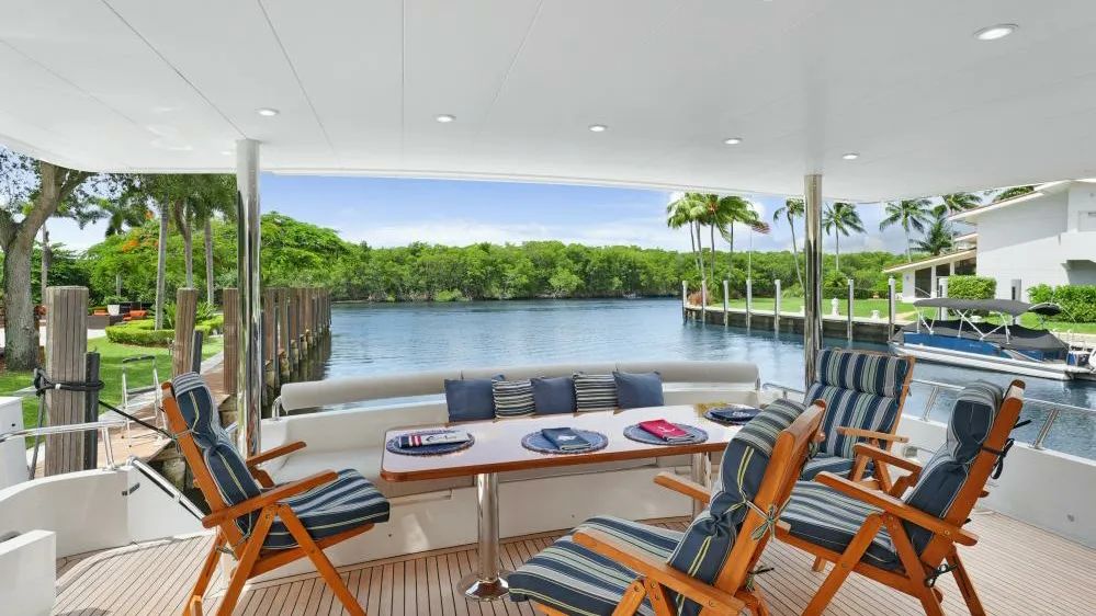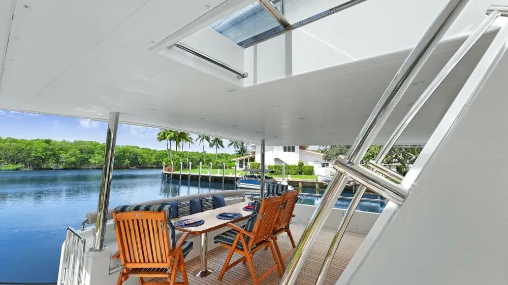 SUE CAROLYN underwent multiple upgrades during a six-month refit, including new teak decking on the aft deck and the installation of an adjustable sunshade system. Seating areas are protected by custom canvas covers, and custom-fabricated boarding stairs aid embarkation. Wide, wraparound side decks allow for smooth circulation around the vessel, with four boarding gates and a swim platform.