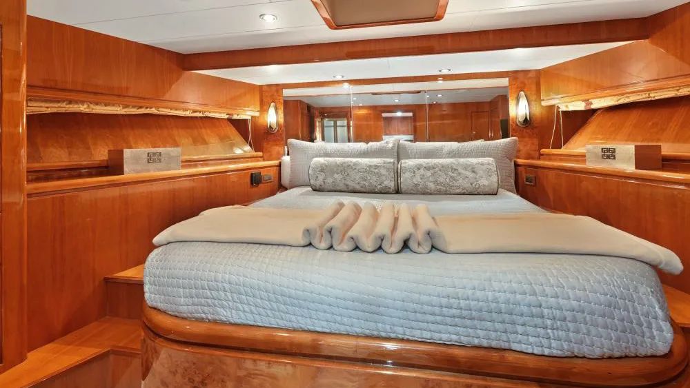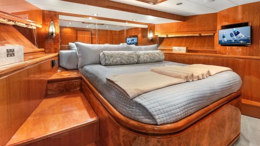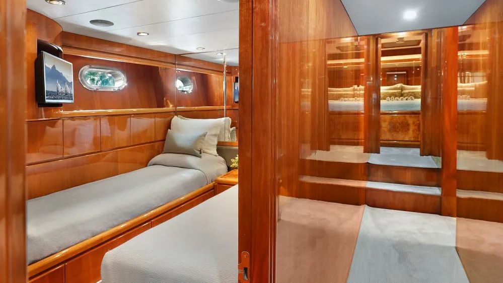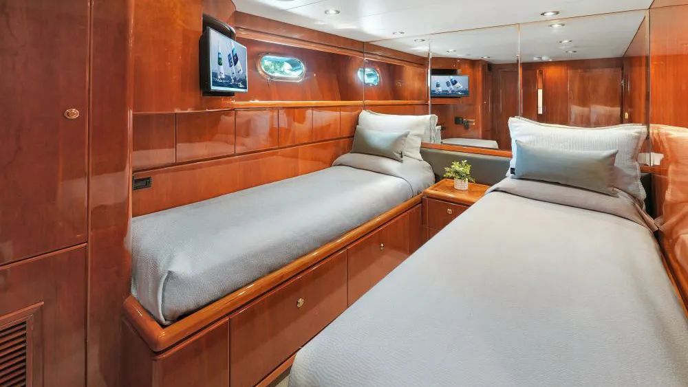 SUE CAROLYN accommodates up to eight guests in four cabins, all situated on the lower deck. The wheelchairaccessible master suite is complemented by a VIP cabin and two twins. Flat panel displays are installed in every cabin, including the crew quarters, ensuring that entertainment and information systems are easily accessible throughout.