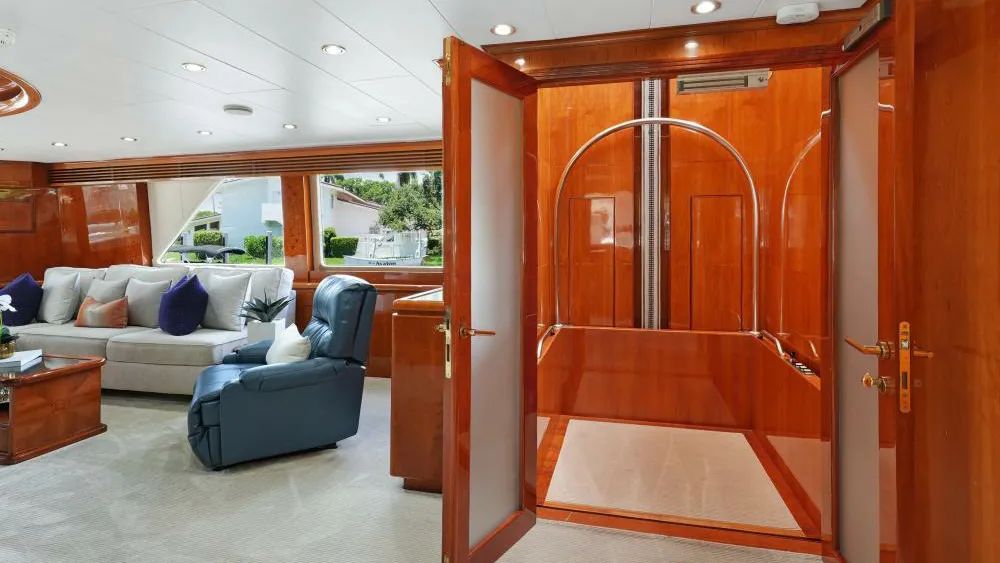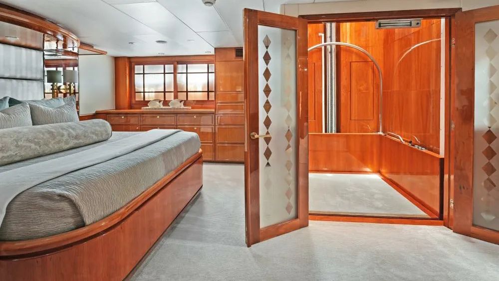Her interior has been thoughtfully designed around accessibility, most notably with the addition of an elevator connecting the master suite to the sky lounge, a feature almost unheard of on a yacht of this size. The sky lounge itself offers near 360-degree views, while wide doorways, specially adapted day heads on both levels, and master head with extra-wide doors offer ease of movement throughout.