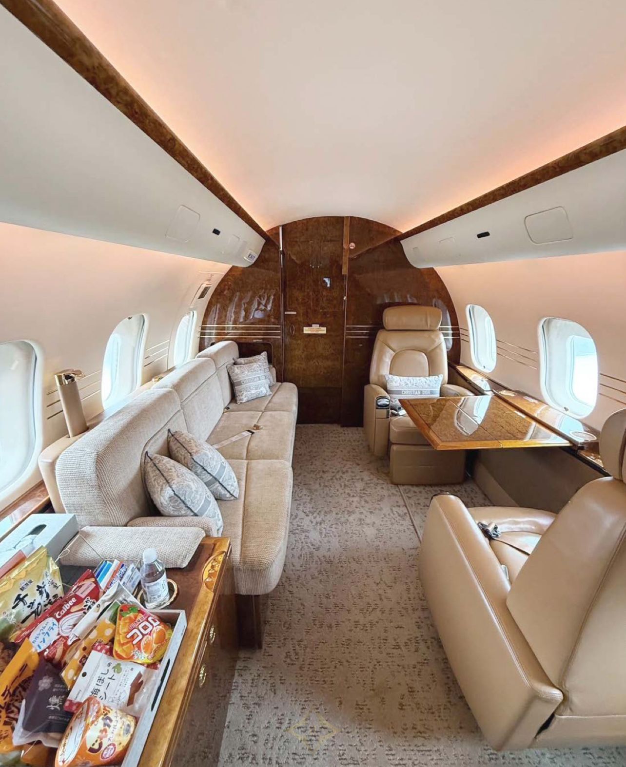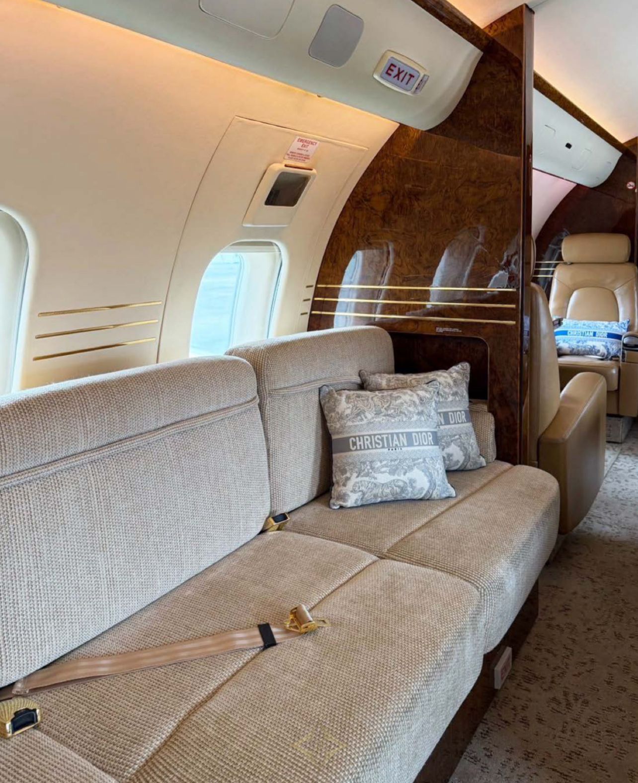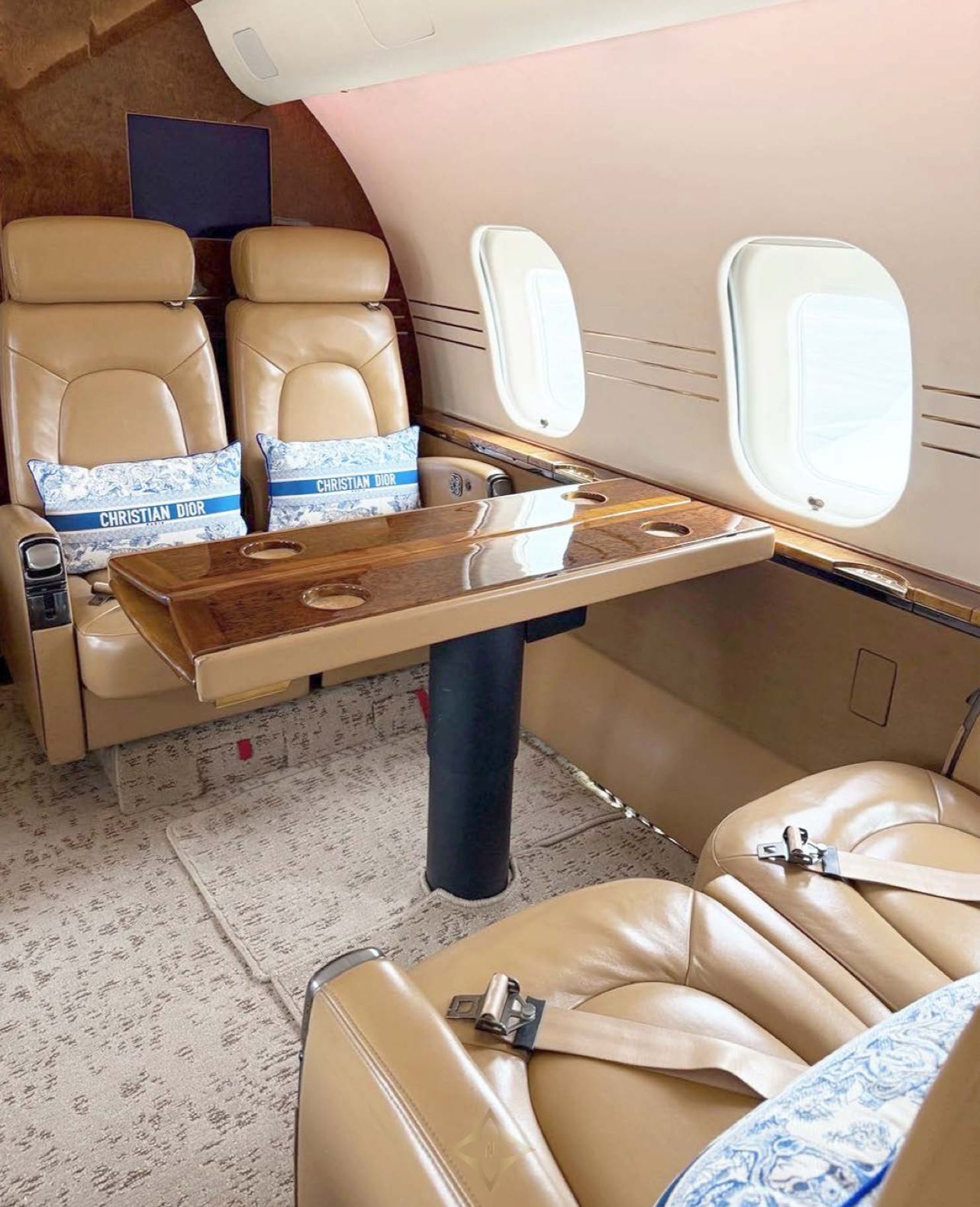 Seating: Tan leather seating, four forward executive seats, mid-cabin 3-place berthable divan opposite dual executive club seats, aft 4-place conference group opposite dual executive club seats
