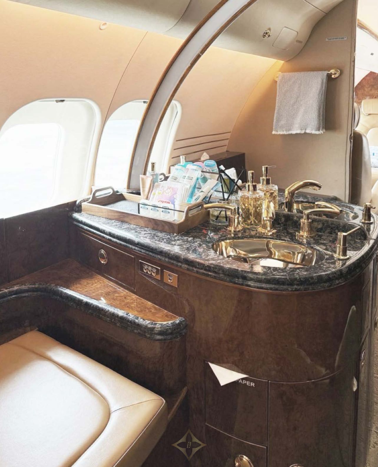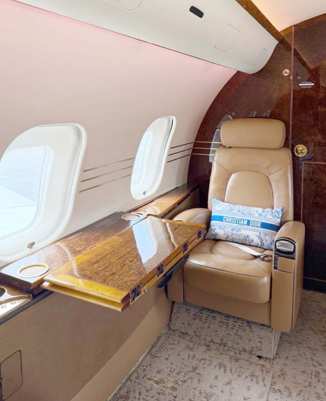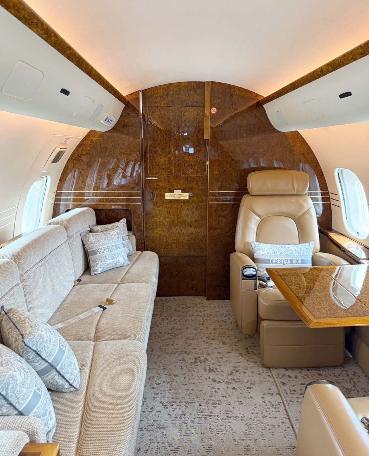 Seating: Tan leather seating, four forward executive seats, mid-cabin 3-place berthable divan opposite dual executive club seats, aft 4-place conference group opposite dual executive club seats