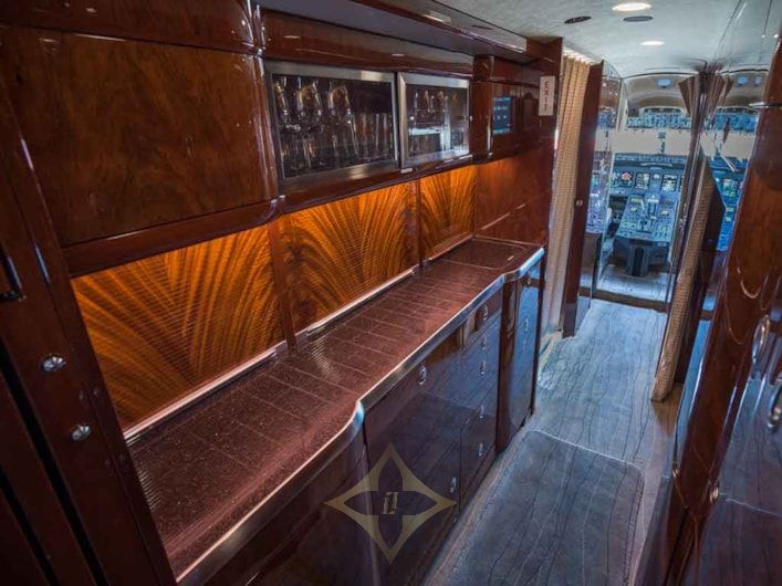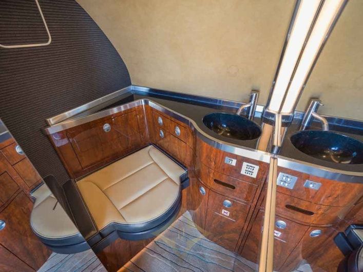 Forward Vestibule: Forward crew closet / storage area. Forward crew lavatory and forward crew rest area.