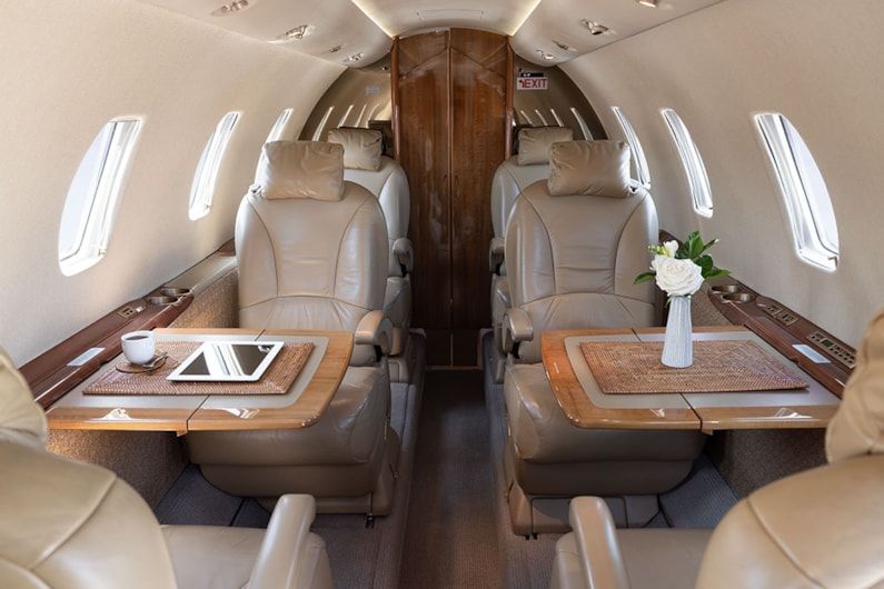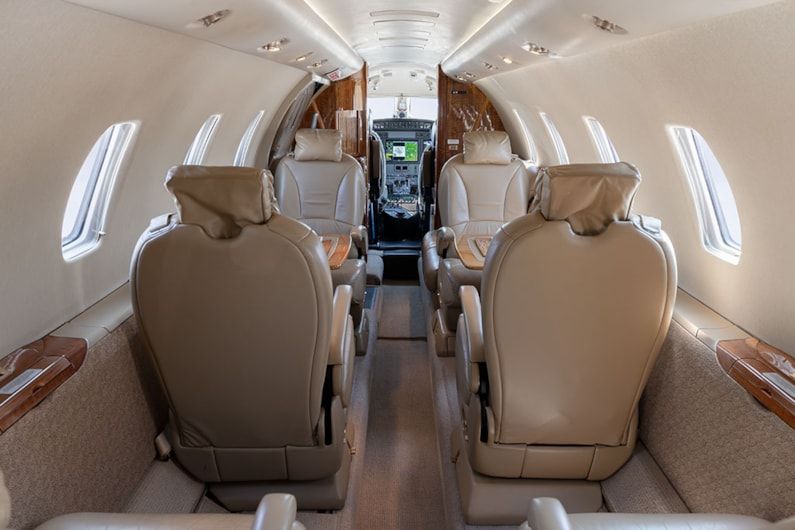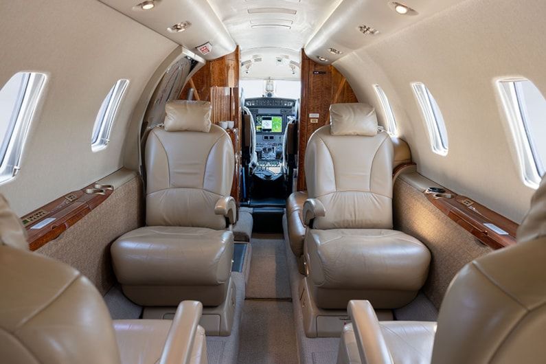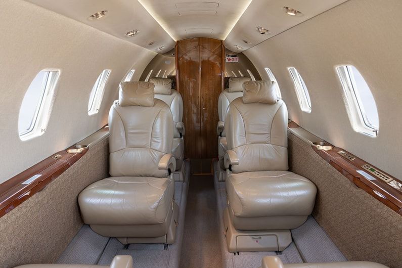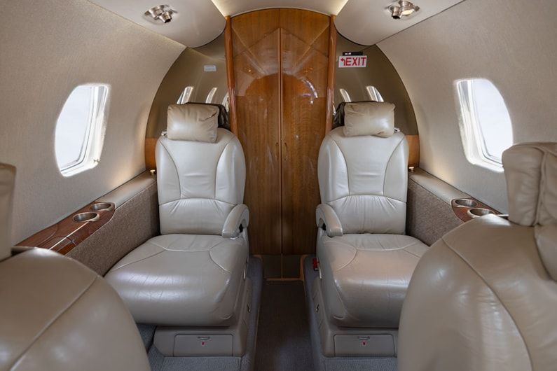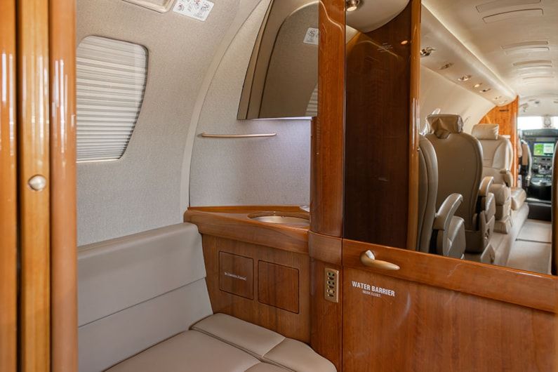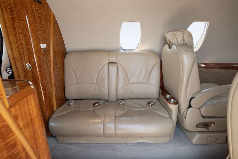 This elegant nine-passenger interior features a forward two-place divan and a four-place club arrangement in the forward cabin, followed by two forward-facing seats. The aircraft is also equipped with a belted lavatory. A partial interior refreshment was completed in 2019, which included resurfaced cabinetry, new carpeting, and deep cleaning and refurbishment of the passenger seats.