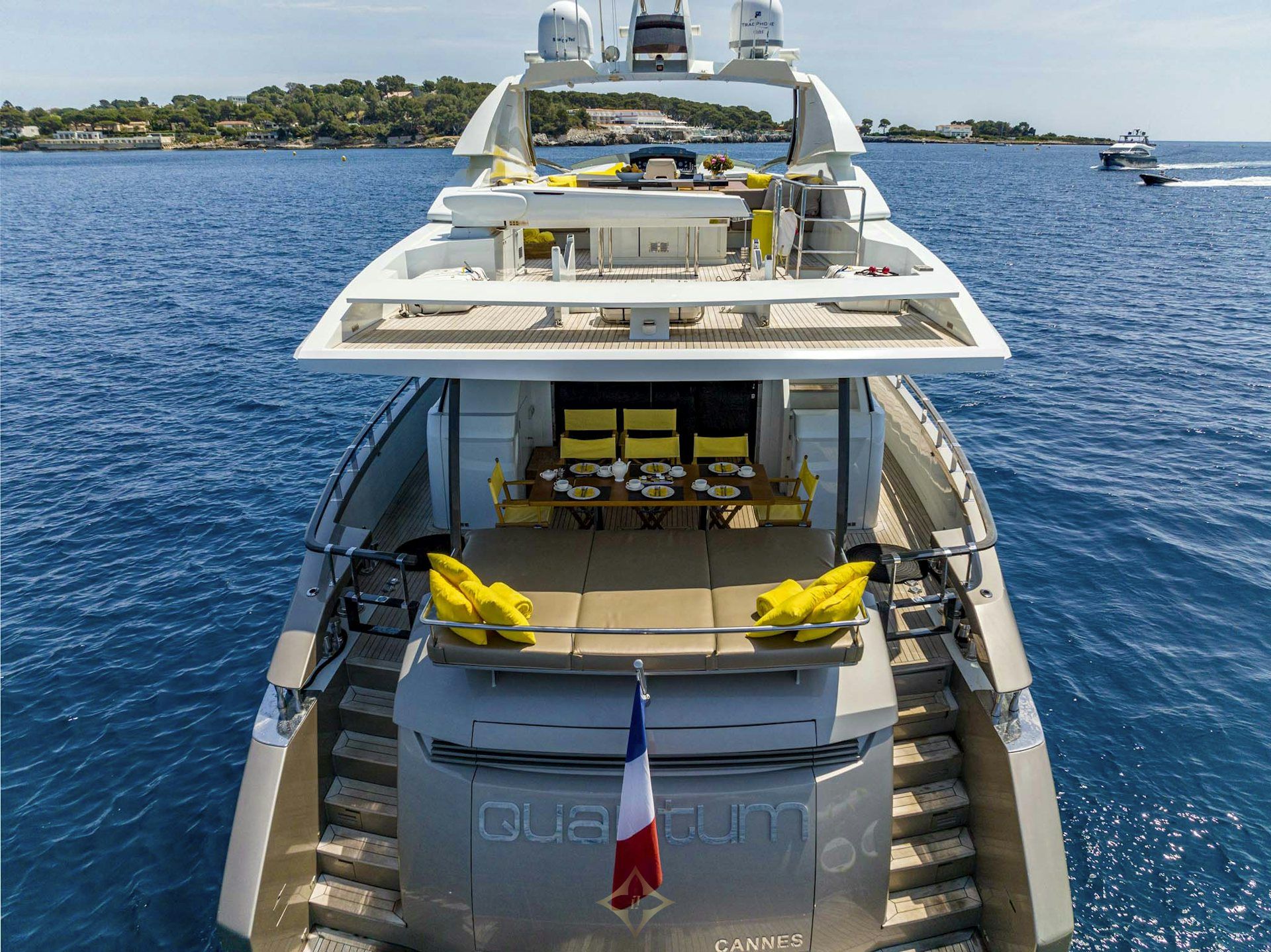 QUANTUM has also benefited from substantial technical upgrades. Her 2022 refit included the addition of state-of-the-art HUMPHREE stabilizers with 180° rotating fins, providing exceptional stability both at anchor and underway. A new navigation system and fresh aesthetic touches, including carbon handrails and updated upholstery in the salon, further enhance her modern appeal.