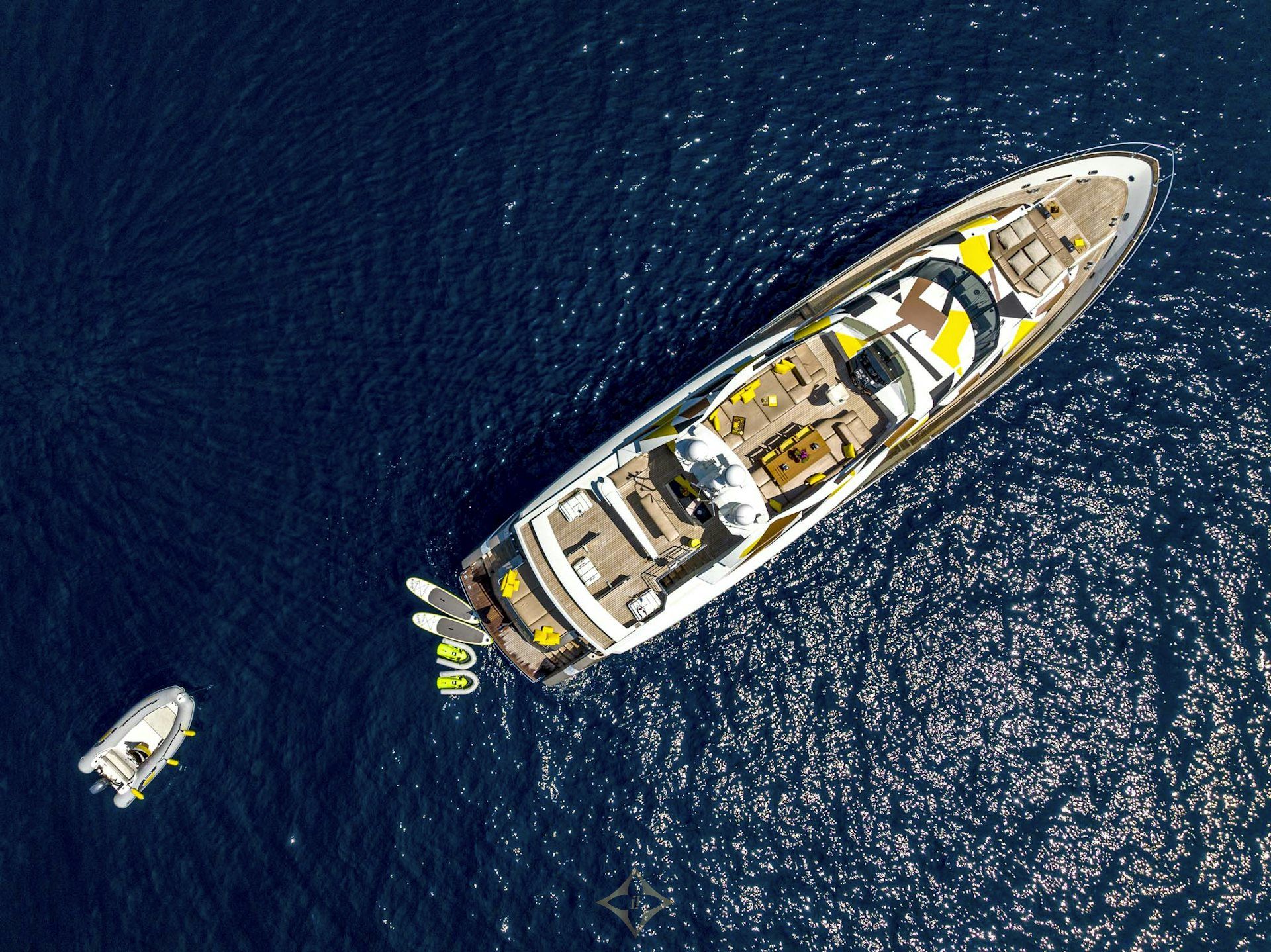 Inside, QUANTUM is just as impressive. Her open-plan salon, flooded with natural light, offers panoramic views through large windows, creating a sense of openness and connection to the surroundings. The vibrant interior design features fun pop art and edgy yellow accents that give the space a lively, contemporary feel. This playful yet sophisticated atmosphere continues into the accommodation, where she comfortably sleeps up to eight guests across four luxurious cabins. The full-beam master suite is bright and spacious, while the VIP cabin and two guest cabins—converted to doubles—each have en-suite facilities and offer the same chic, modern style seen throughout the yacht.