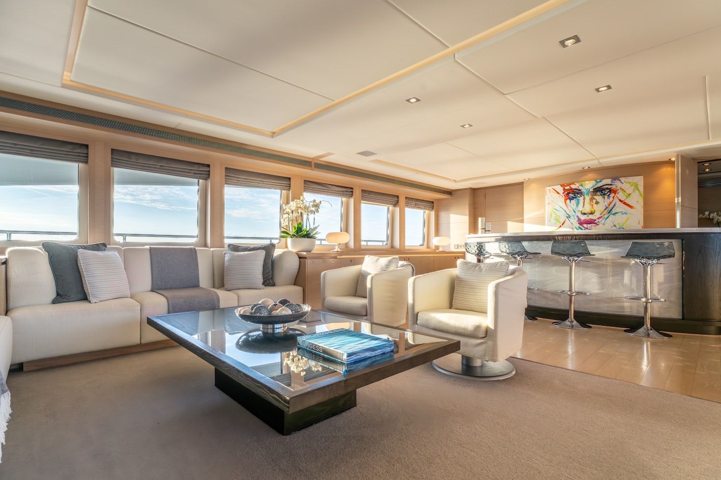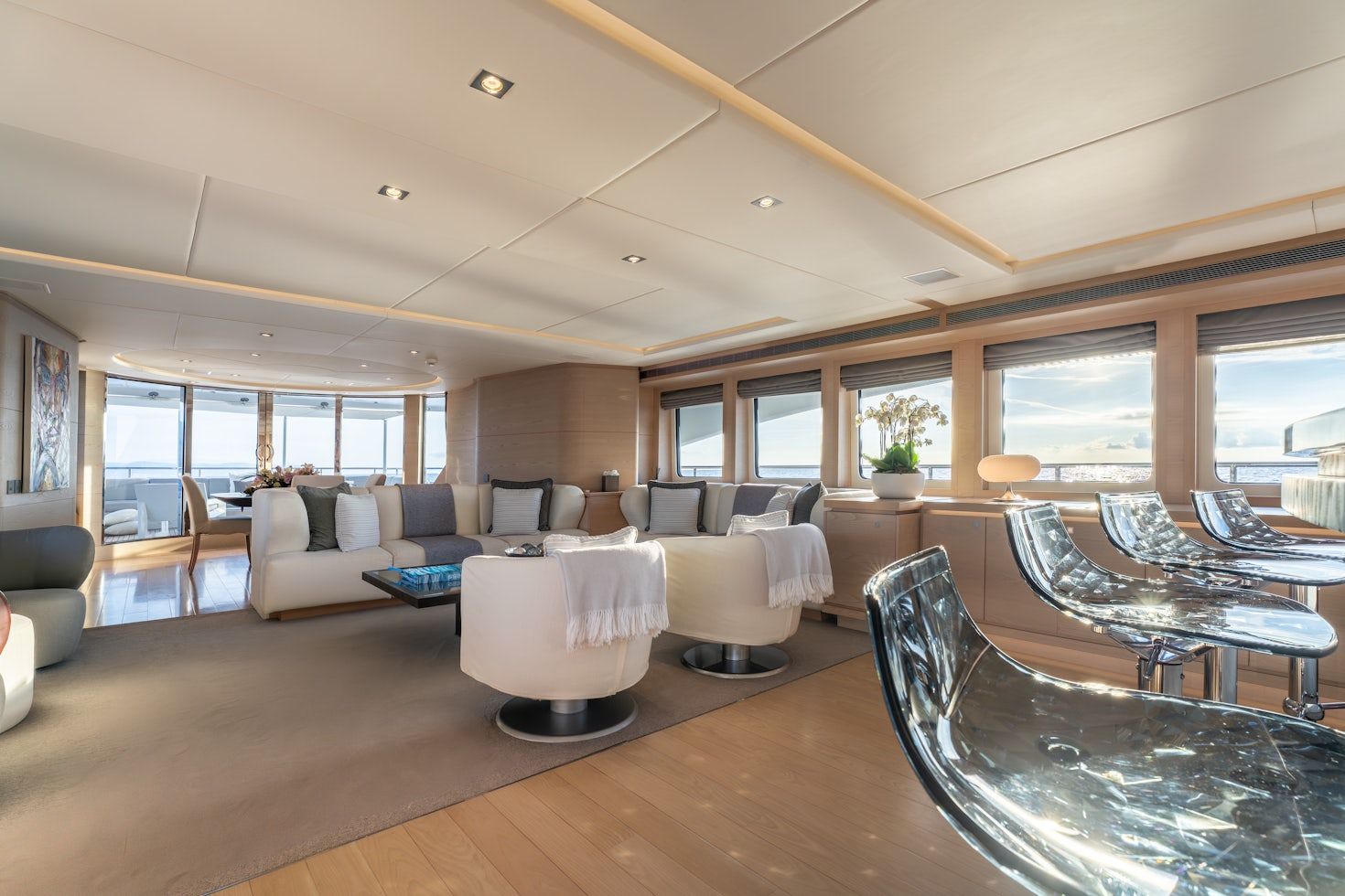 Styled by Omega Architects, her interiors are open, fresh, and flexible. The main salon features expansive windows and a clean, modern finish. The formal dining area was moved aft in her 2017 refit, opening directly onto the main deck aft for a more connected indoor–outdoor experience. The galley is fully equipped with Miele and Hoshizaki appliances, and a dumbwaiter system supports smooth service. The skylounge, updated in 2022, opens onto the bridge deck aft, offering a flexible space for entertaining.