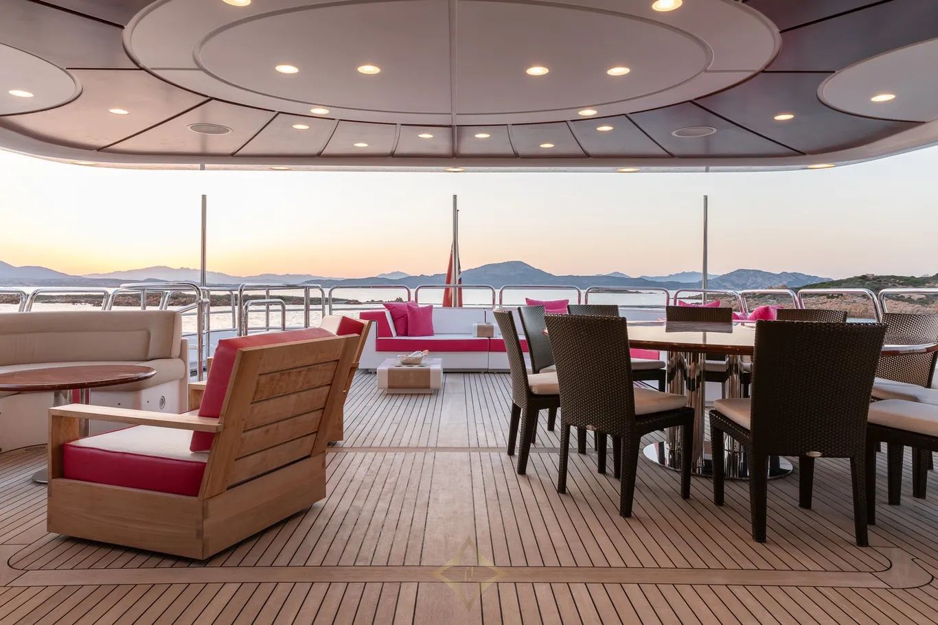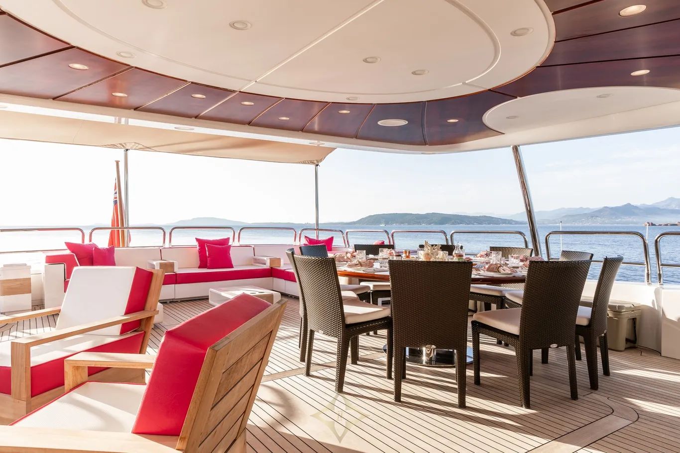 Outdoor living is equally impressive. The aft deck is configured for al fresco dining and entertainment, featuring built-in bench seating, a dining table, and chairs. The expansive sundeck offers panoramic views and is equipped with a jacuzzi, gym equipment, sun pads, and a bimini top aft for shade and comfort.