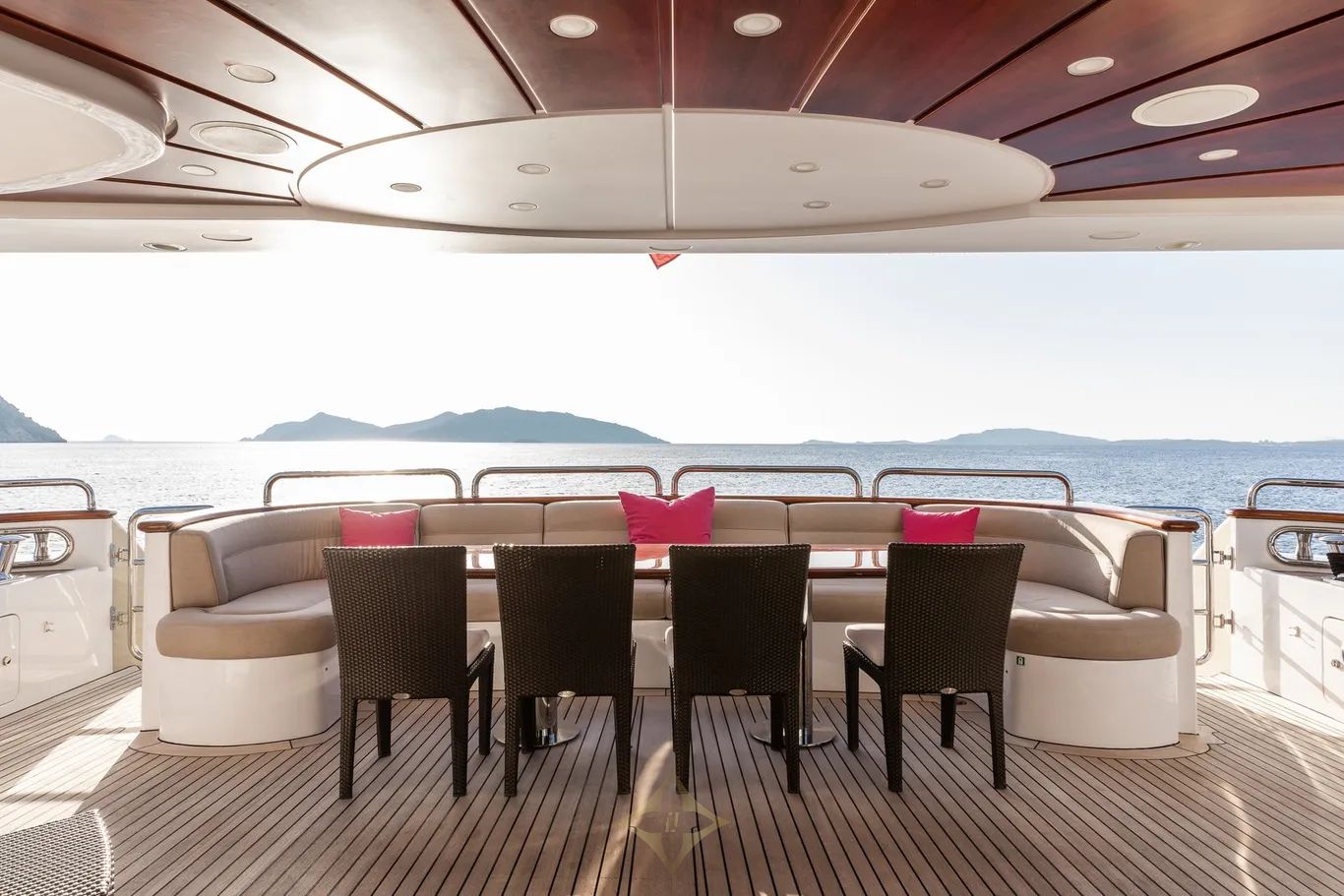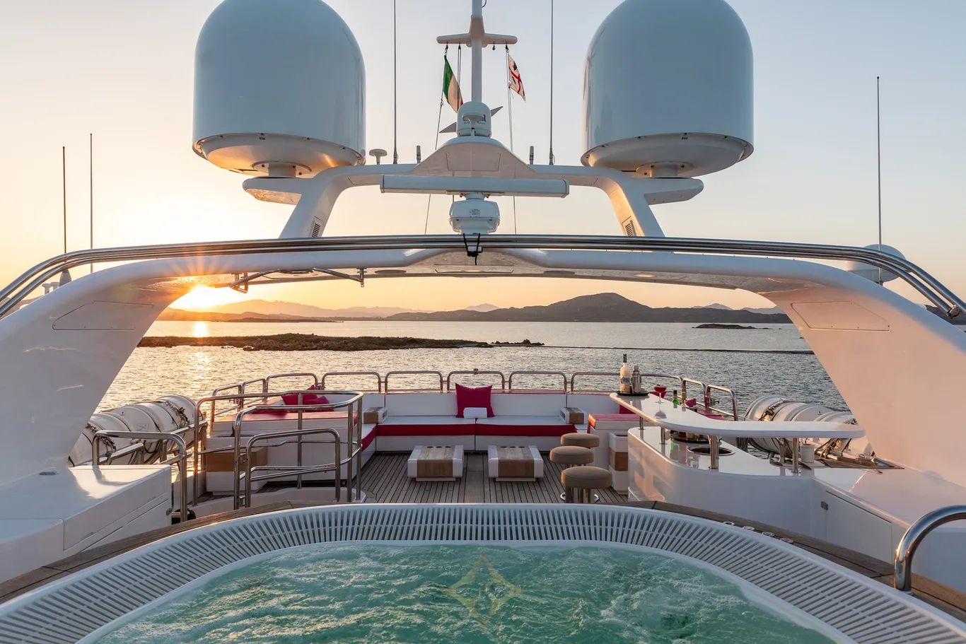 Sun deck packed with amenities including a jacuzzi, wet bar, and viewing chairs fixed forward
