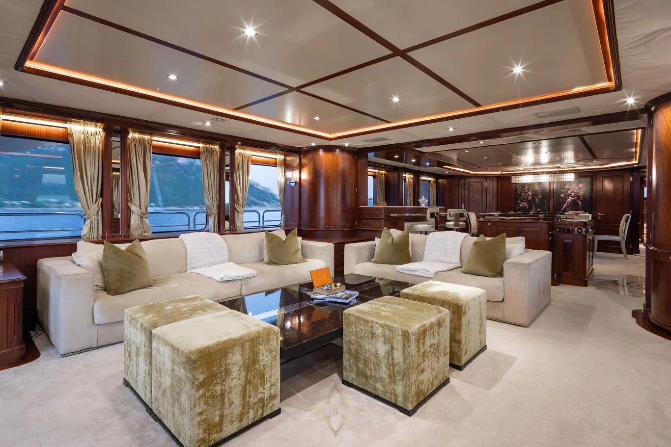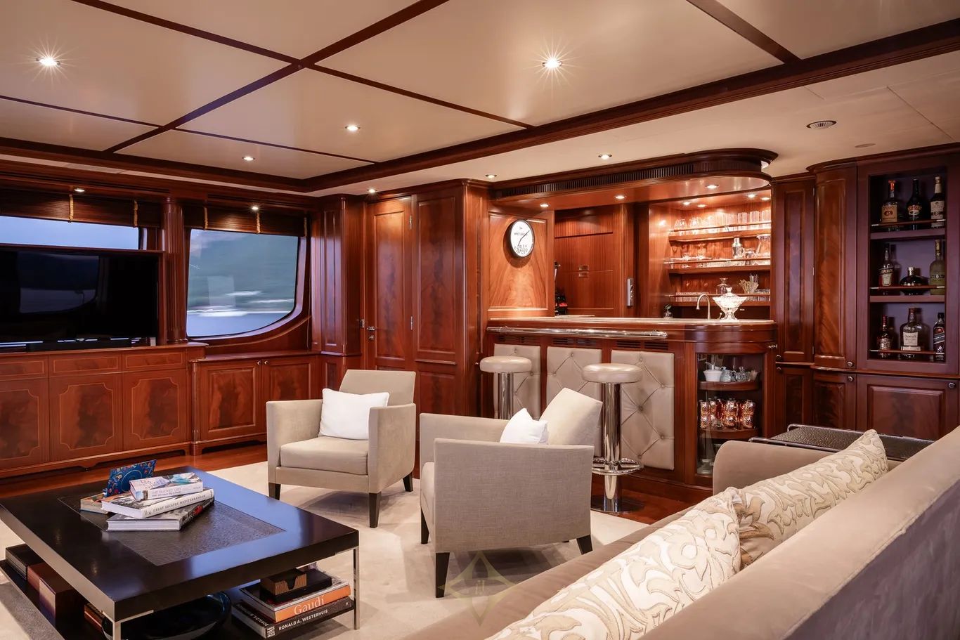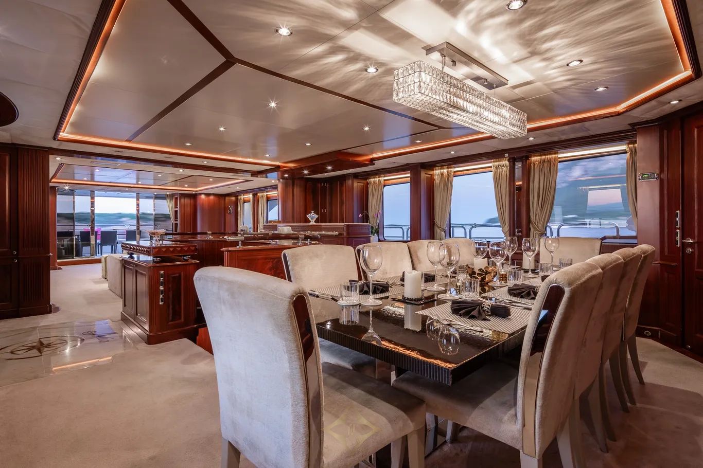 The main deck lounge exudes timeless elegance, furnished with plush sofas, armchairs, gold-accented curtains, and decorative mirror inserts. Forward of the lounge lies an intimate dining area, centered around a formal dining table that seats ten. A full-service wet bar and integrated entertainment system—featuring an LED television and state of the art sound system—are situated between the main deck lounge and dining area, creating a refined space for socialising and relaxation.