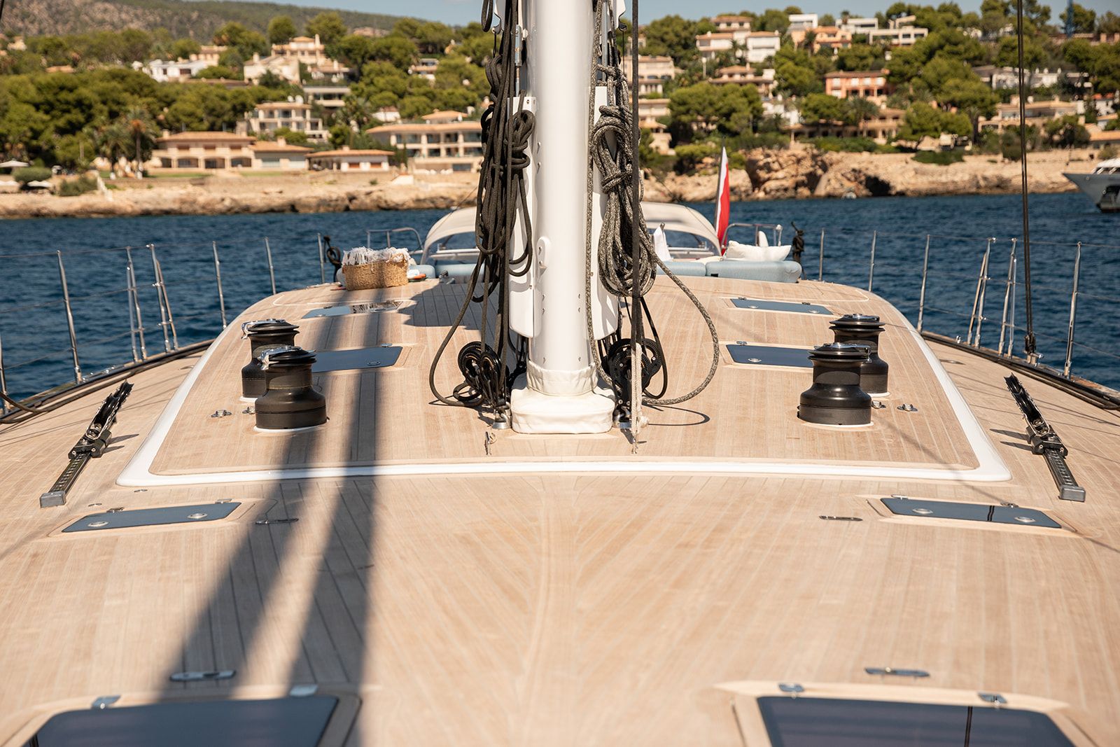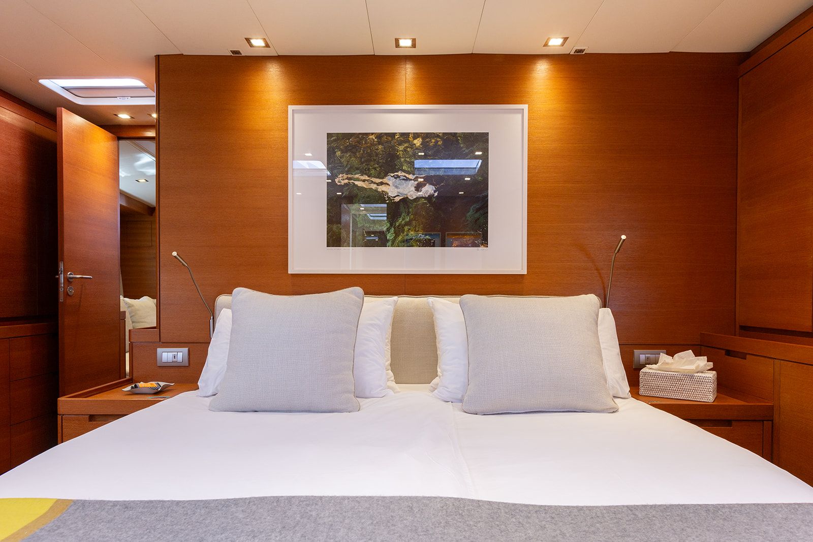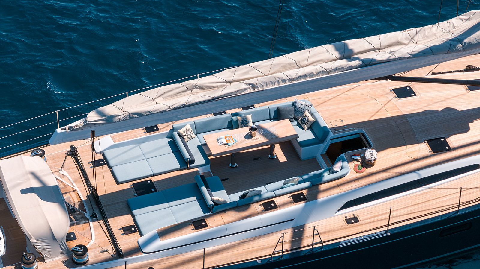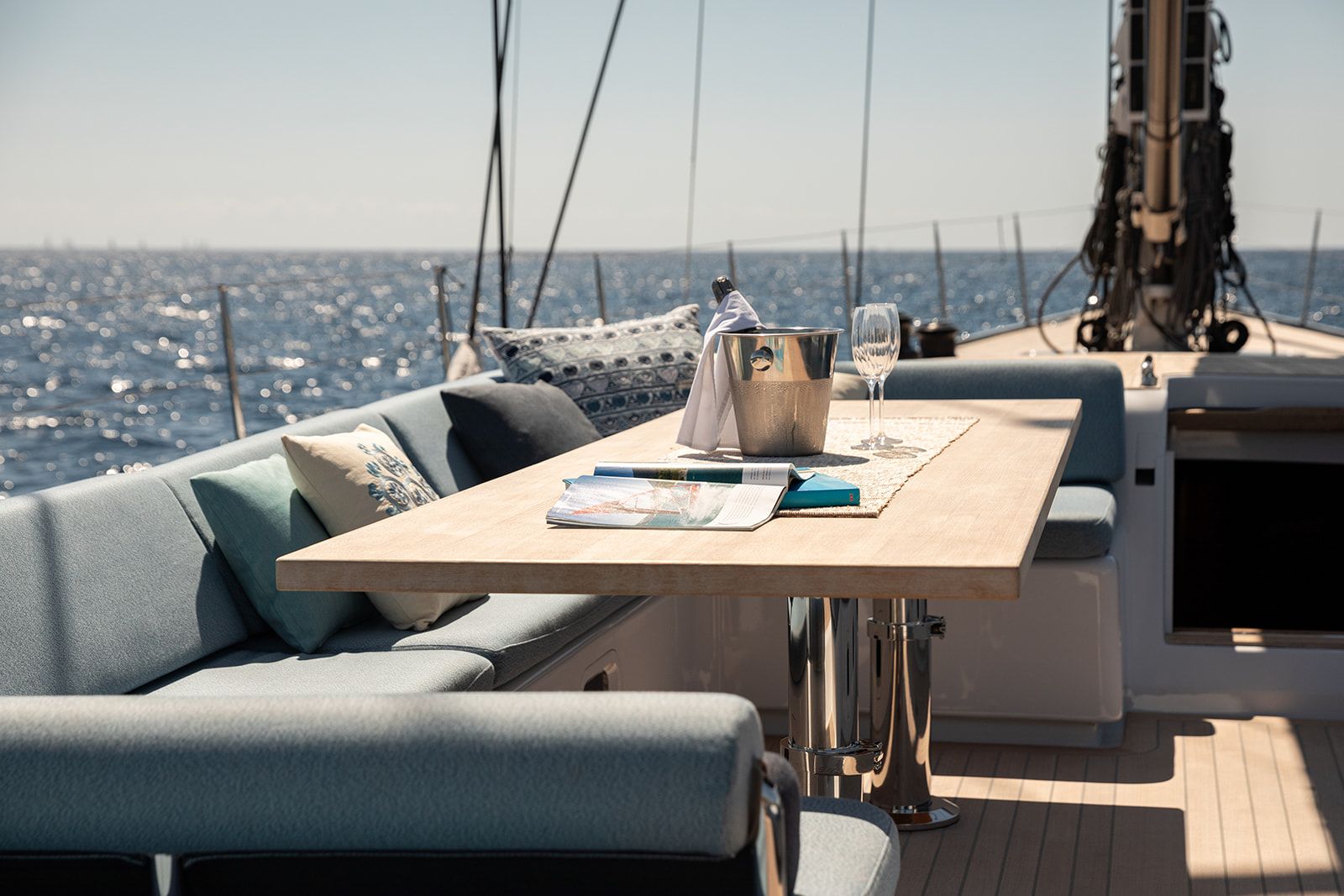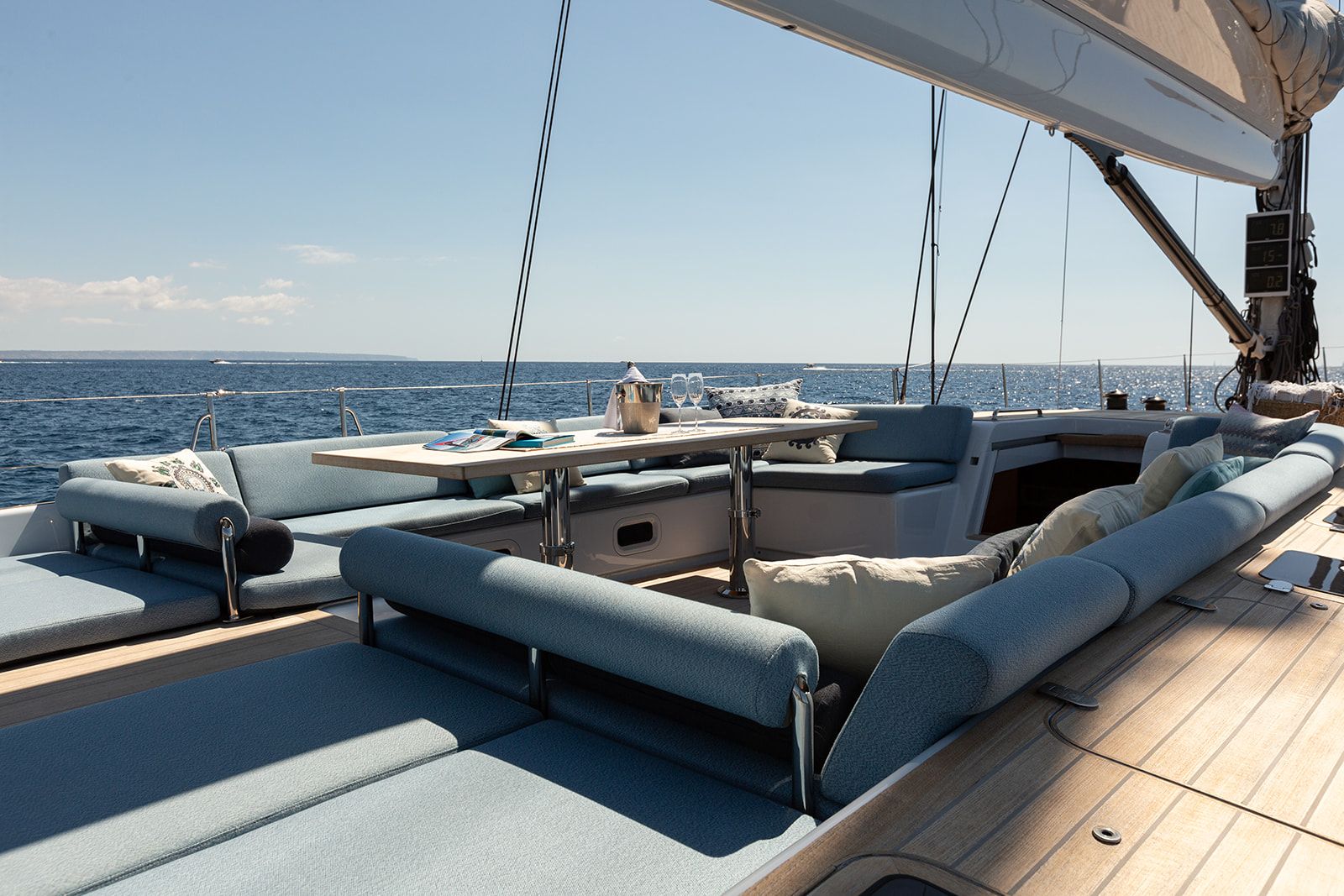 She accommodates eight guests in four spacious cabins, with additional quarters for four crew located aft. On deck, she features a generous centre cockpit with sun-lounging and dining areas, offering a comfortable and secure environment for relaxation and entertaining at sea.