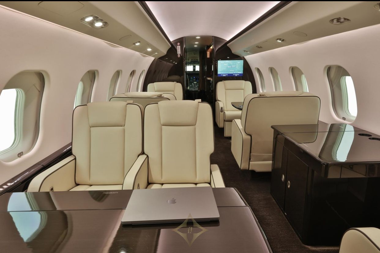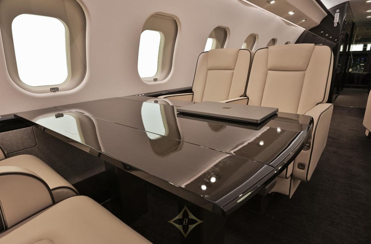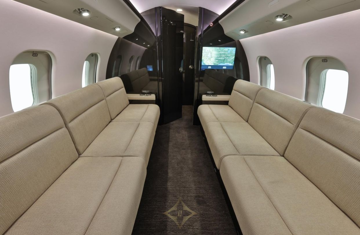 The cabin is configured for 14 passengers. Immediately aft of the cockpit features a right-hand forward lavatory, followed by the forward right-hand galley, which is equipped with a TIA Wavejet Microwave, TIA Hi-Temp Oven, Espresso and TIA Coffee Maker and an Air Chiller. Opposing the galley is left-hand crew rest area just aft of the main entrance door. Continuing aft through a pocket door and entering the main cabin area is a four (4) place club followed by a left-hand four (4) place conference group that opposes a single seat and workstation. A cabin bulkhead with a pocket door separates this area from the aft cabin seating. Moving aft through the pocket door is a left-hand two (2) place berthable 16G divan that opposes a right-hand three (3) place berthable 16G divan, which is certified for only two (2) TT&L passengers when the removable bulkhead is installed on the right-hand side. Further aft is the lavatory followed by the baggage compartment.