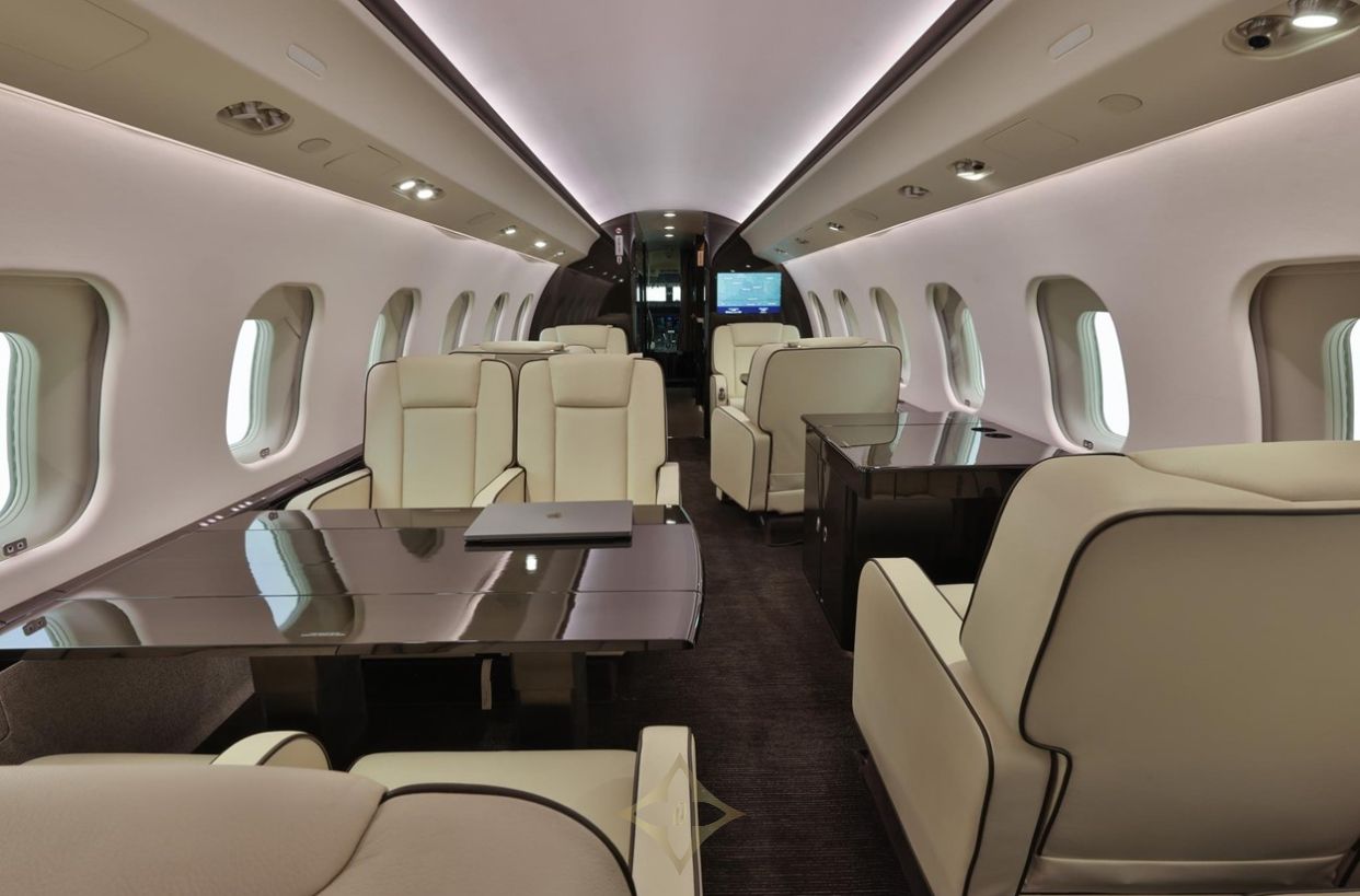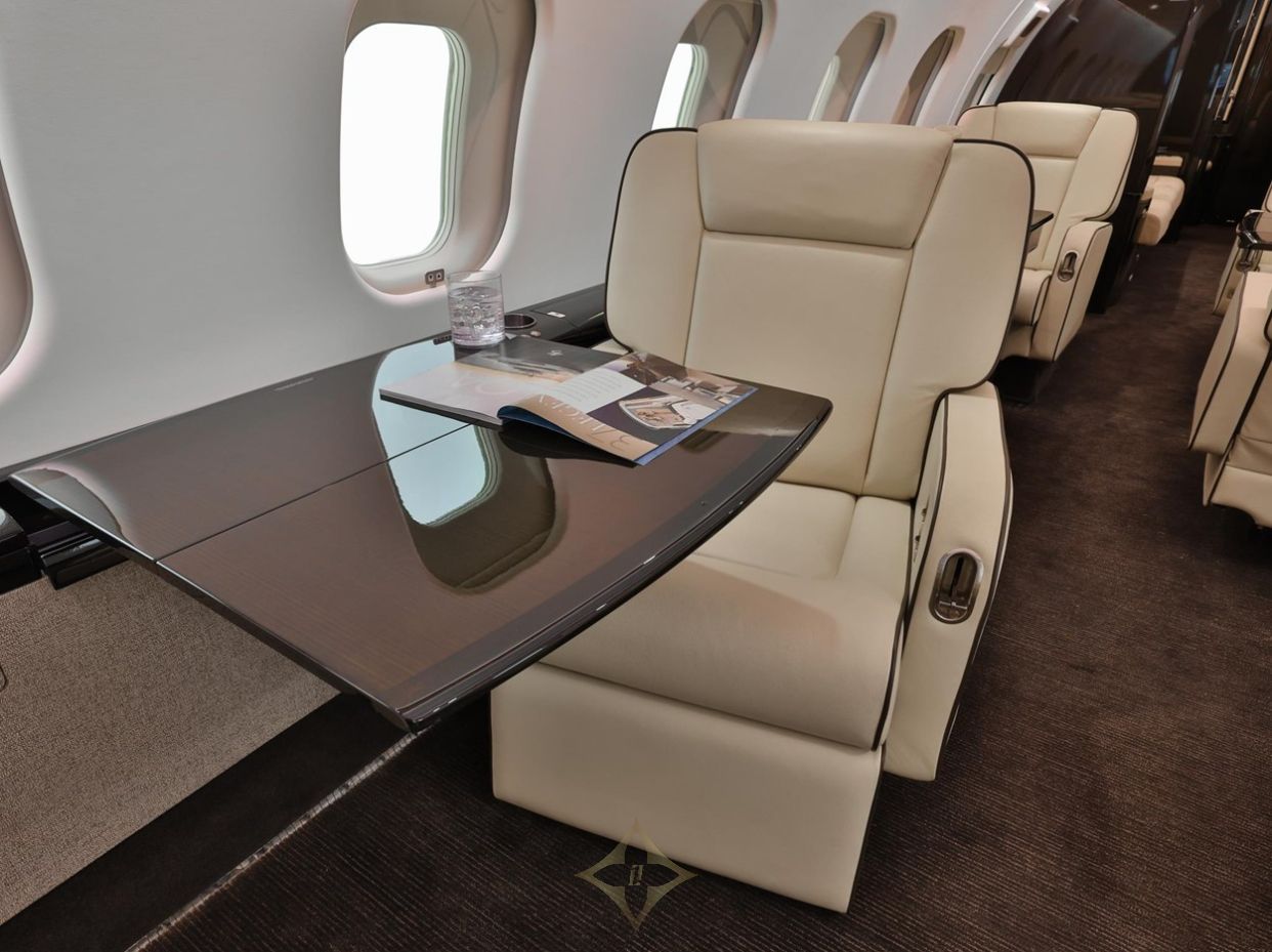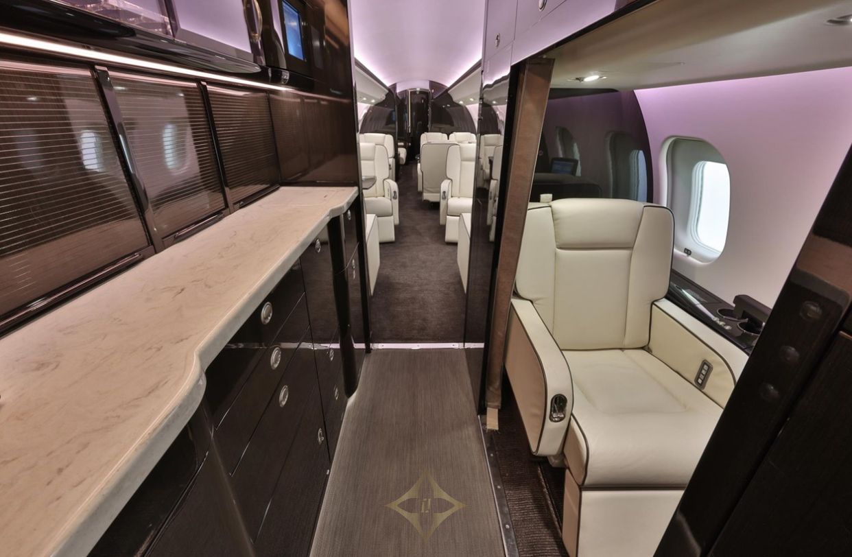 The cabin is configured for 14 passengers. Immediately aft of the cockpit features a right-hand forward lavatory, followed by the forward right-hand galley, which is equipped with a TIA Wavejet Microwave, TIA Hi-Temp Oven, Espresso and TIA Coffee Maker and an Air Chiller. Opposing the galley is left-hand crew rest area just aft of the main entrance door. Continuing aft through a pocket door and entering the main cabin area is a four (4) place club followed by a left-hand four (4) place conference group that opposes a single seat and workstation. A cabin bulkhead with a pocket door separates this area from the aft cabin seating. Moving aft through the pocket door is a left-hand two (2) place berthable 16G divan that opposes a right-hand three (3) place berthable 16G divan, which is certified for only two (2) TT&L passengers when the removable bulkhead is installed on the right-hand side. Further aft is the lavatory followed by the baggage compartment.
