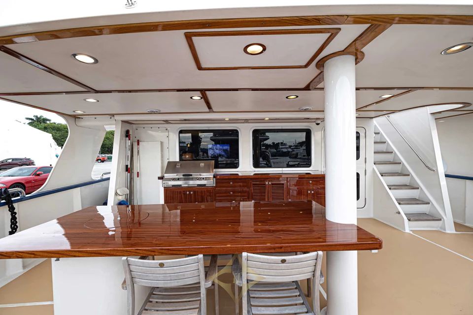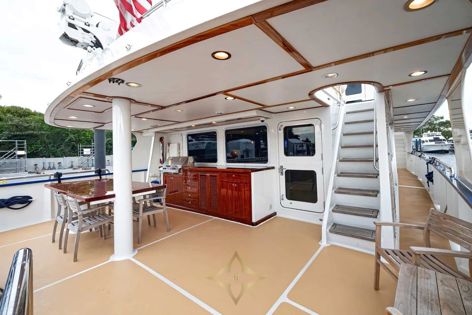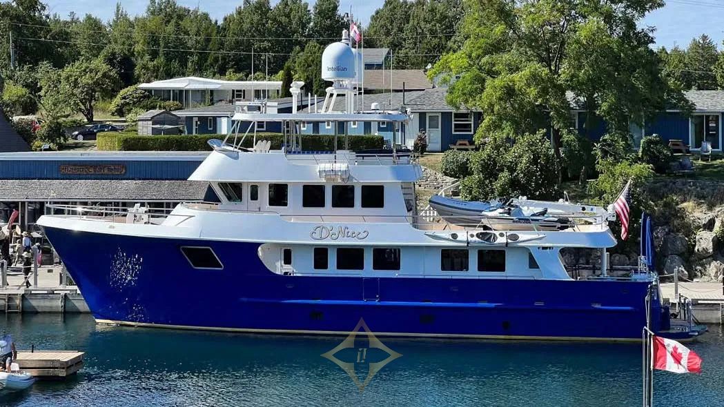 Designed for long voyages, D’NICE offers an expansive layout with six staterooms and seven heads, providing ample space for guests and crew. The salon features a leather seating area, entertainment center, and dining space for six. The galley is a chef’s dream with commercial freezers, a large pantry, and a built-in dinette. The Owner’s Stateroom, located at the forward end of the yacht, offers a private retreat with a king-size bed, office space, reading nook, and marble bathroom, creating an ideal space for relaxation and privacy.