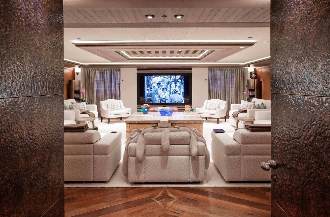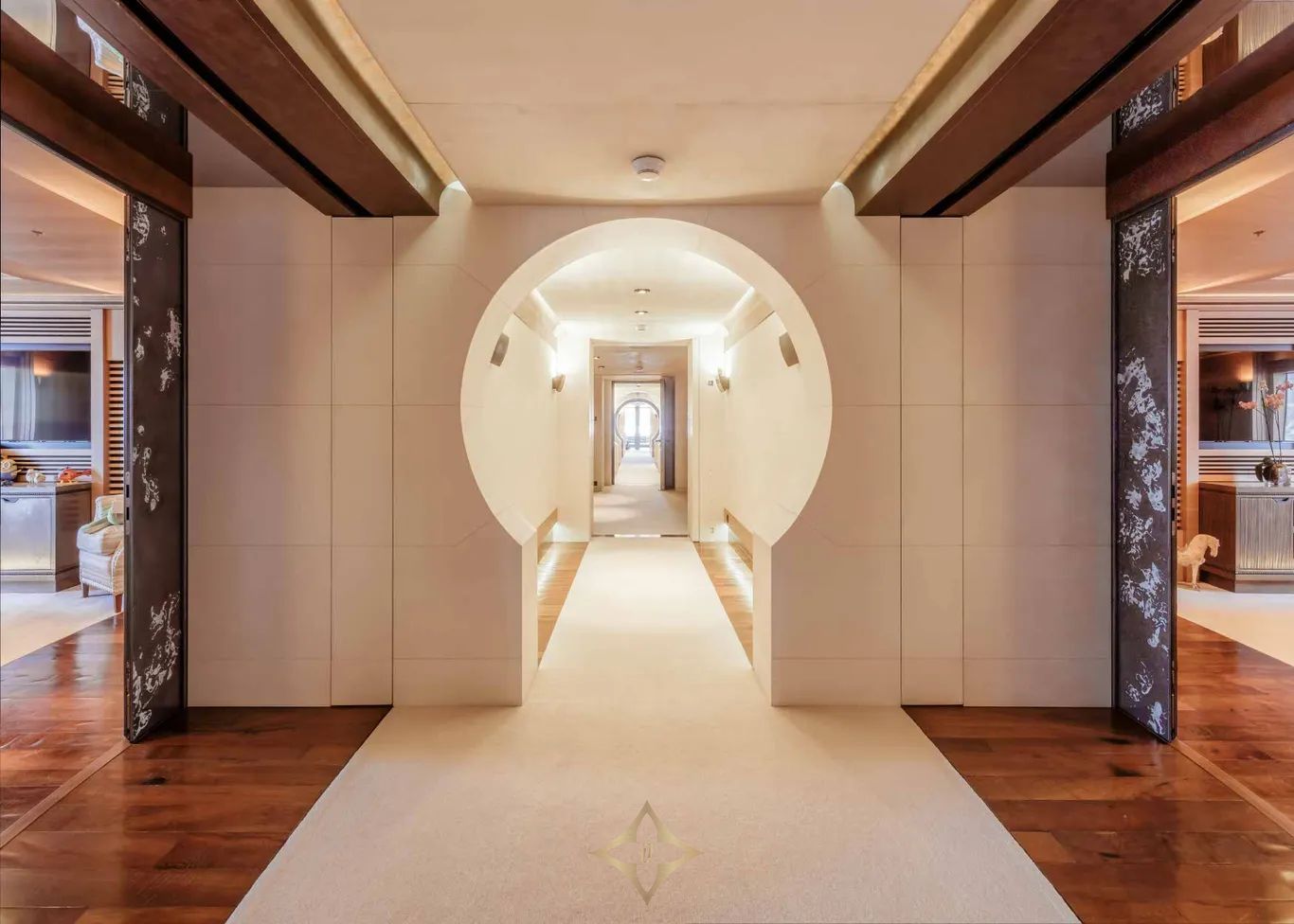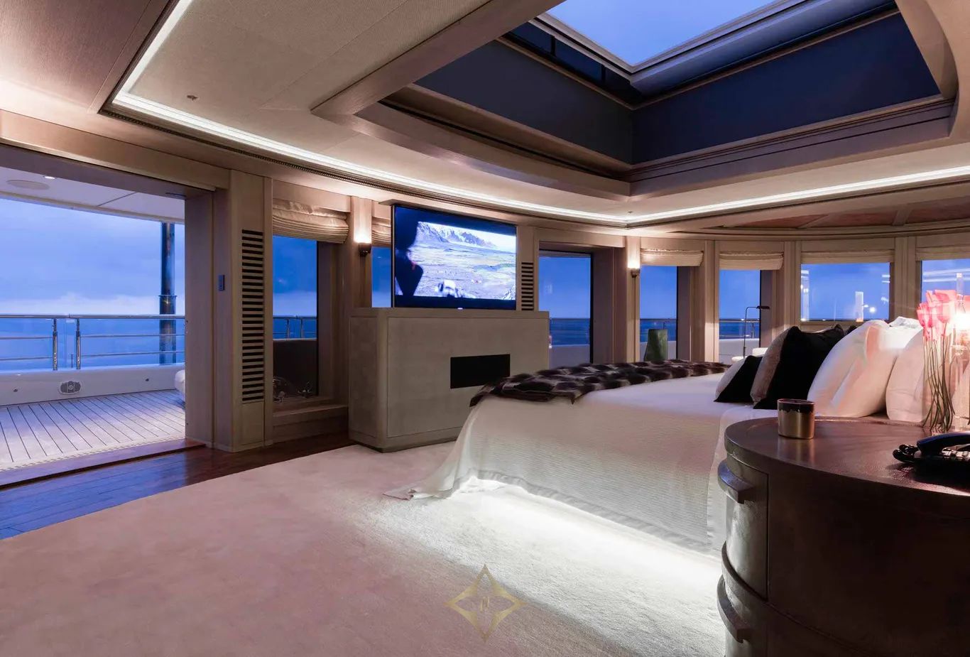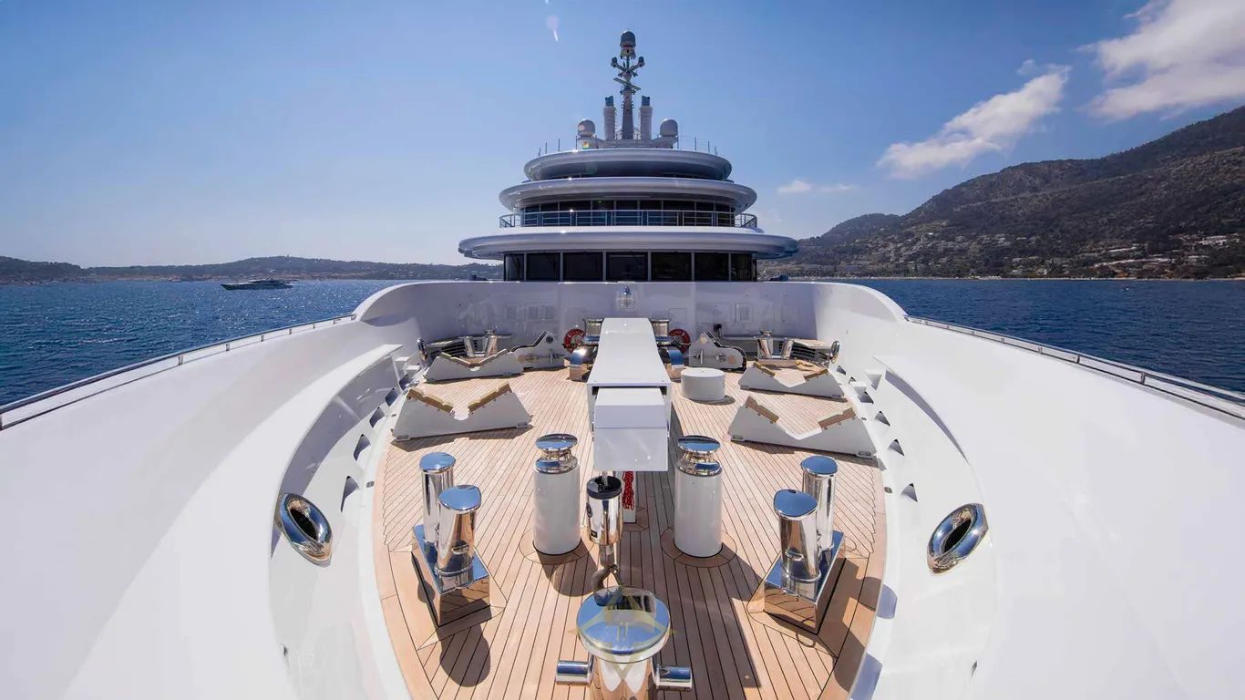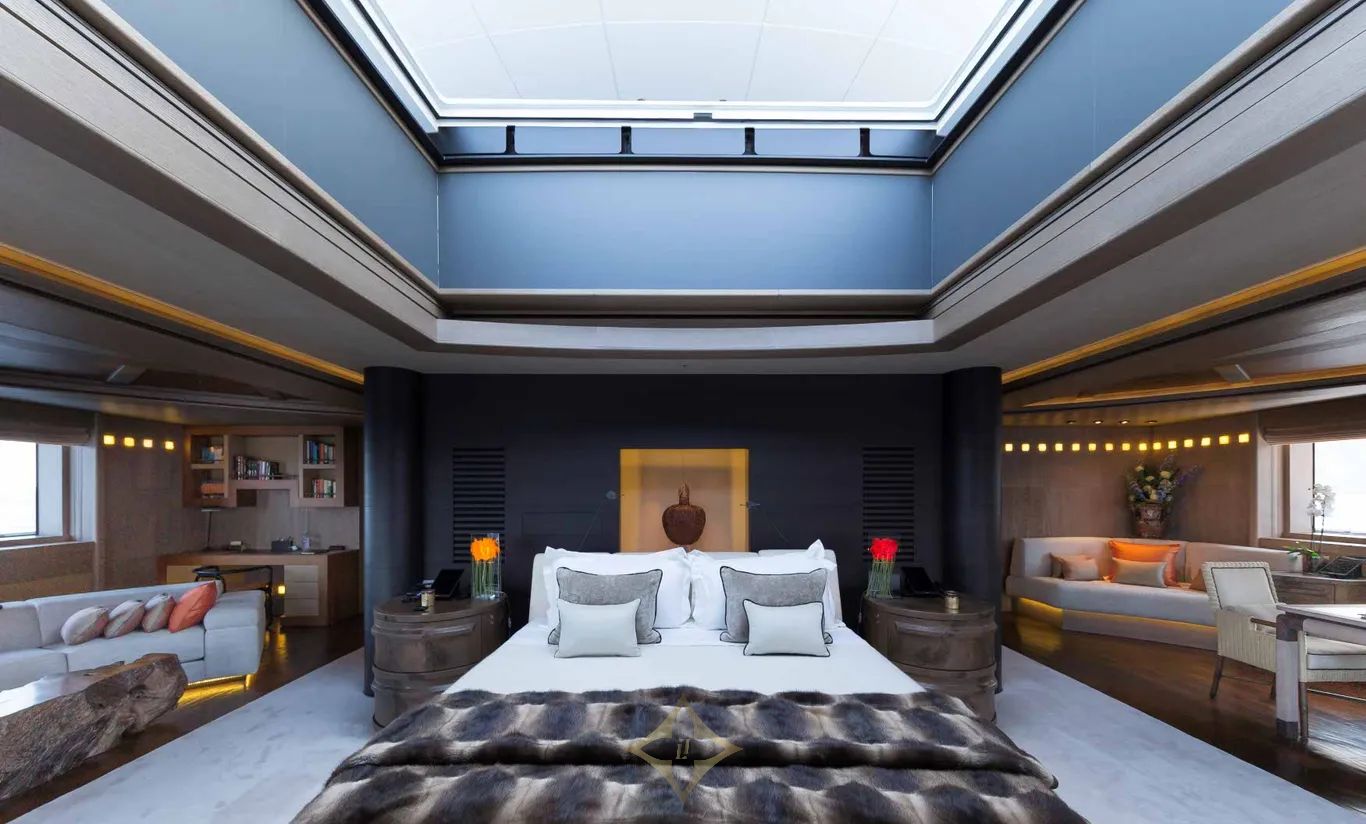 Built with a steel hull and aluminium superstructure, LUNA cruises at 16.8 knots, reaches a top speed of 22 knots, and offers a range of 9,500 nautical miles. Four retractable stabilizers ensure impeccable comfort both underway and at anchor.