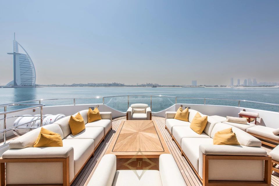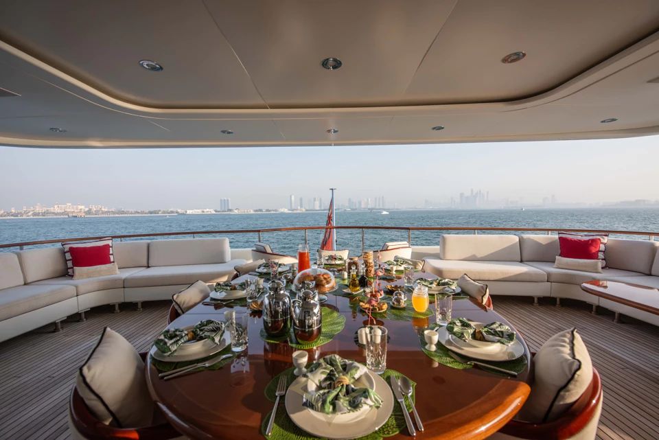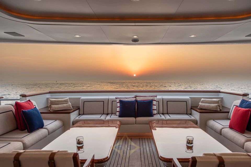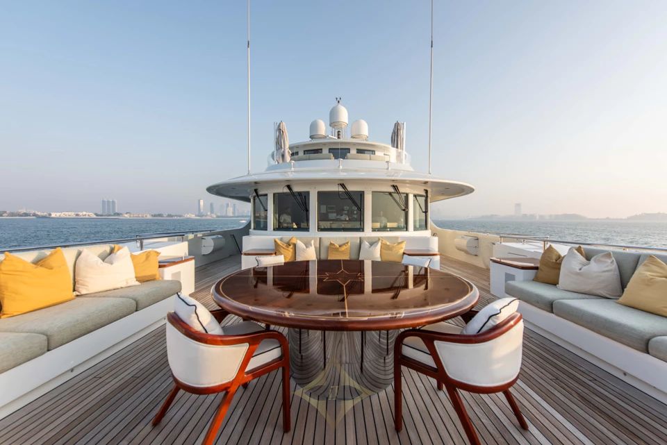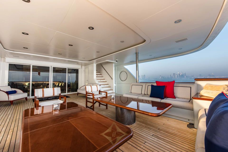 Outdoor areas are designed for versatility and privacy. The bridge deck aft offers alfresco dining for twelve and a full-service bar under a retractable awning. The sun deck aft features loungers, a gym setup, while forward areas include seating for quiet retreat or sunset cocktails.