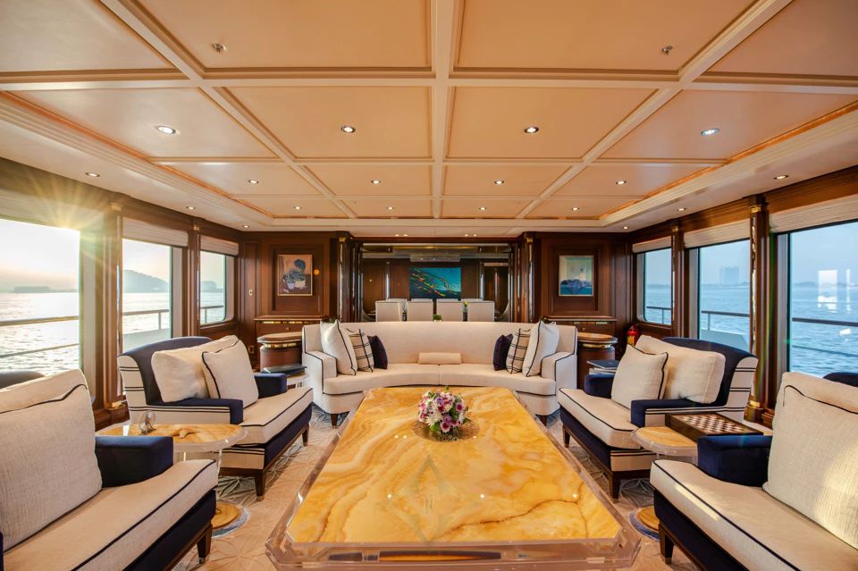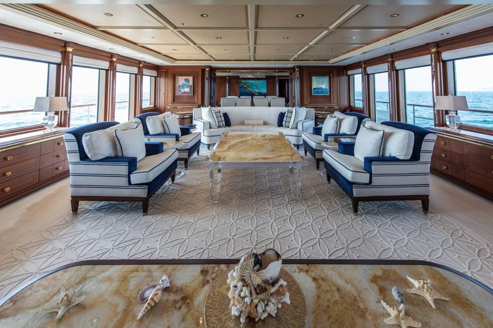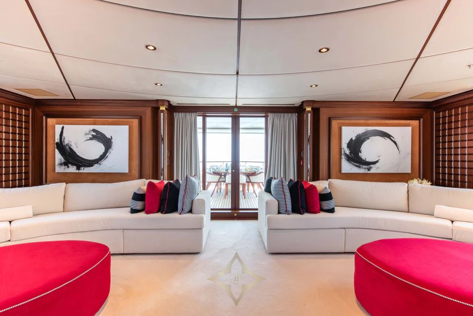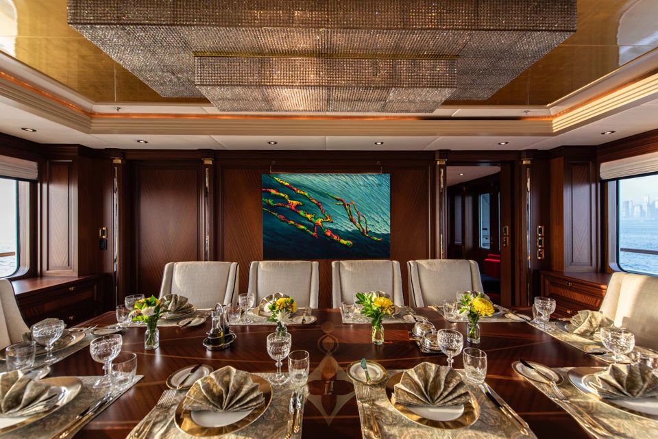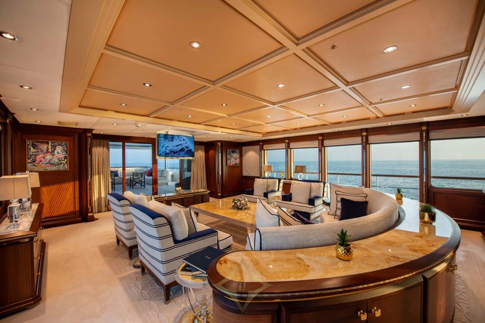 With a gross tonnage of 703 GT, she boasts huge interior volume designed by Sinot. The main salon features a central seating area with panoramic windows, seamlessly flowing into a formal dining room for ten. The bridge deck lounge offers a more relaxed setting with two large sofas, a game table, and cinema-style viewing.