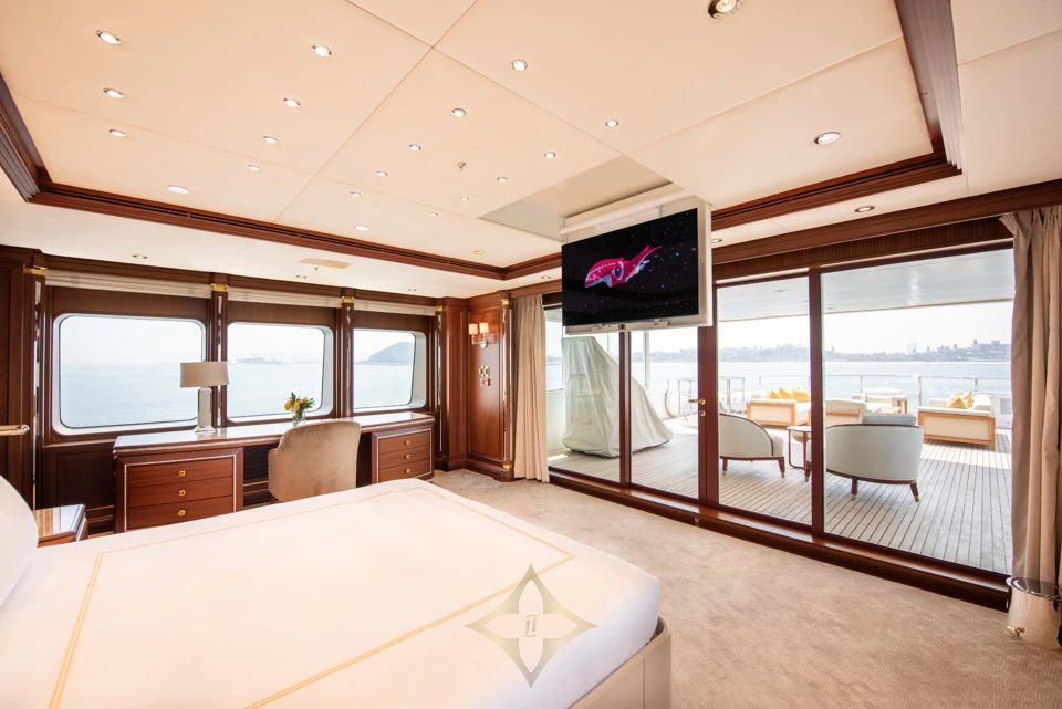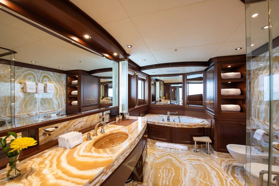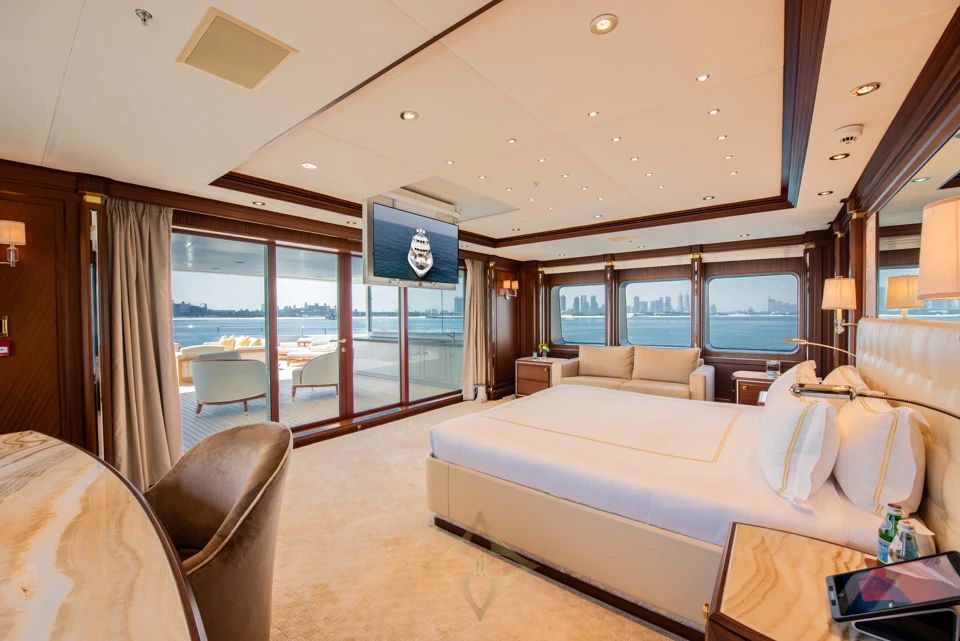 OLMIDA accommodates up to 14 guests across seven staterooms, including a full beam Owner’s Suite with direct access to a private aft terrace. Two VIP suites are located on the bridge deck, and four additional staterooms are located on the lower deck. A convertible cabin on the main deck can serve as a captain’s or guest cabin. An elevator connects all four decks, ensuring effortless access throughout the yacht.