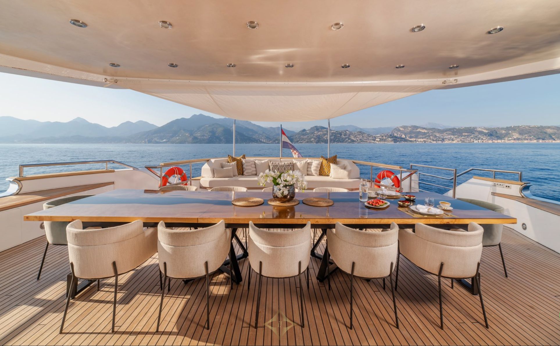 Accommodating 12 guests in a master suite, VIP suite, and four double cabins, all with entertainment systems, WiFi, and en suite bathrooms, she offers luxury and comfort. The master and VIP suites on the upper deck feature a private terrace and saloon with open sea views.