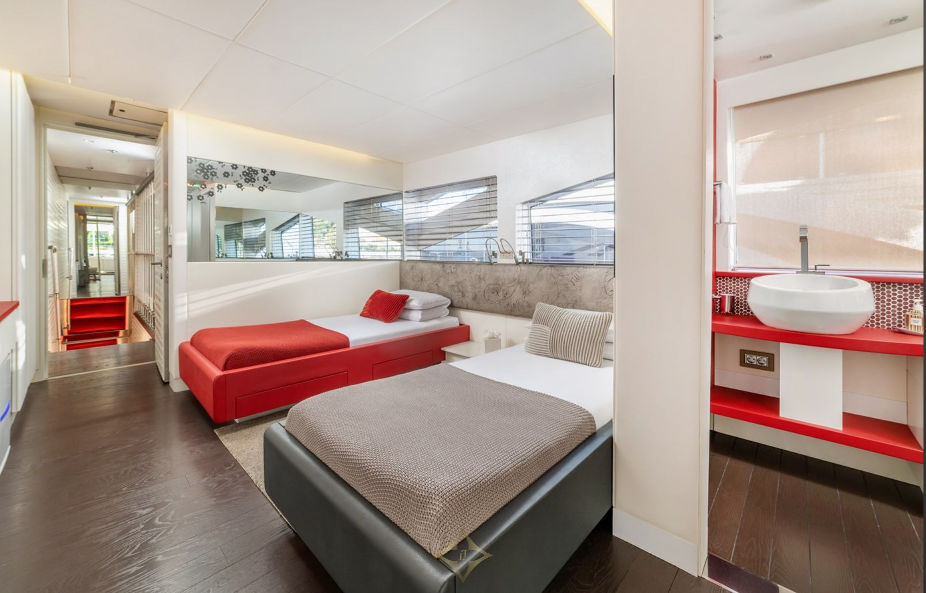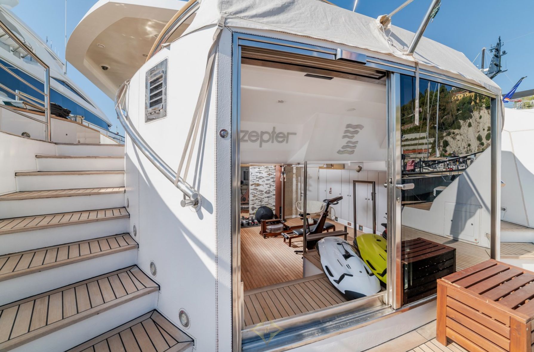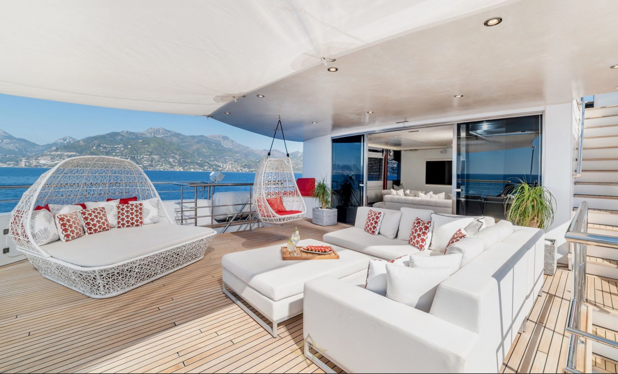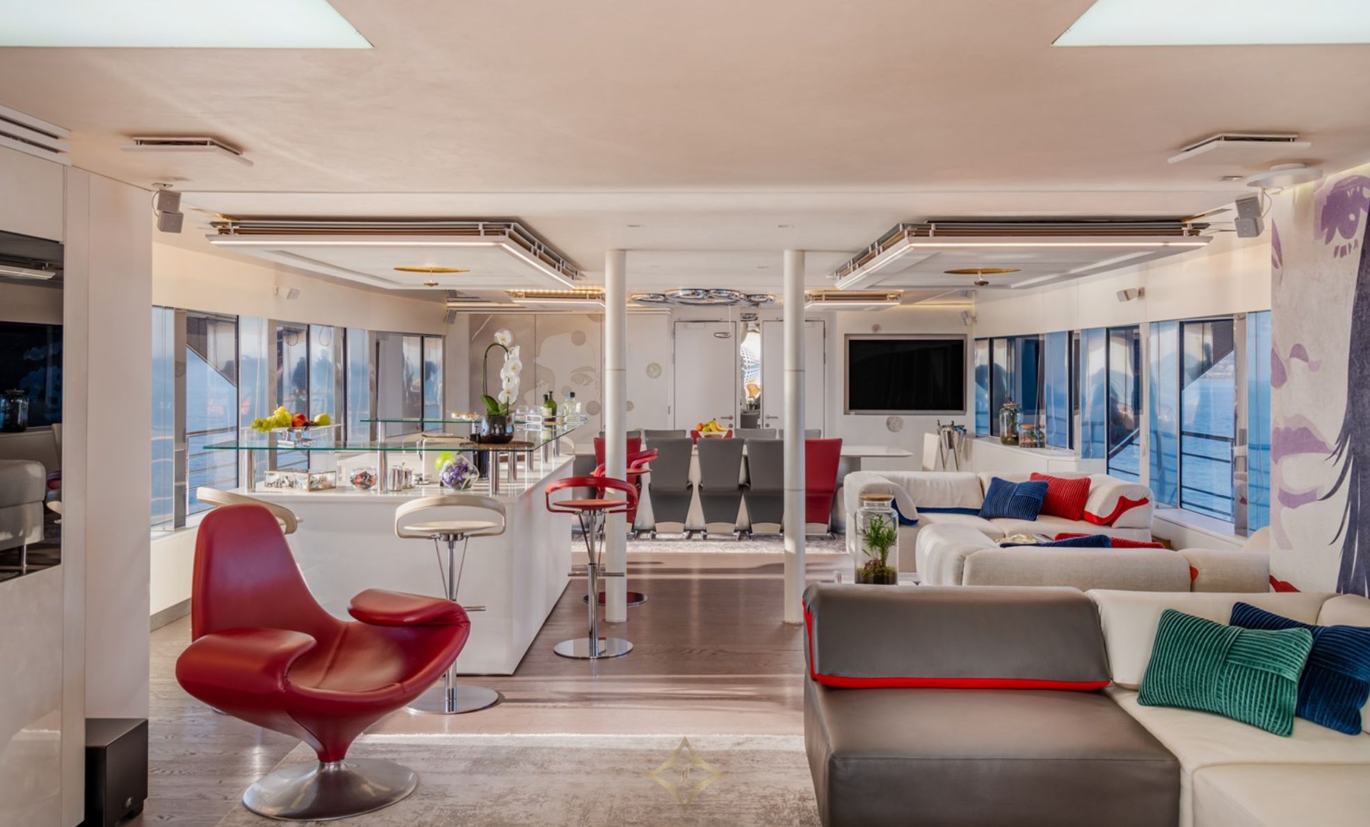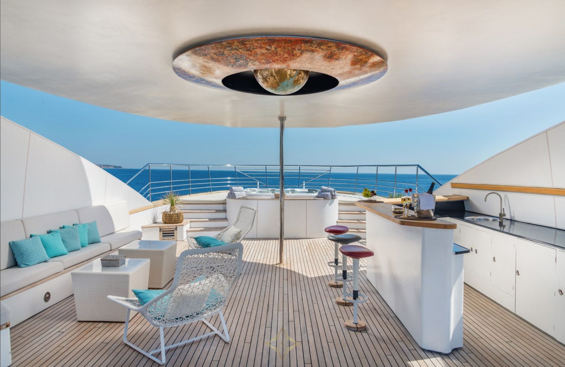 The lower deck features a spa area with sea views, a gymnasium, Finnish sauna, and hammam, while the massive aft deck offers 47 square meters for al fresco dining and entertainment. The sun deck includes a large Jacuzzi and a sky lounge withfull entertainment systems.