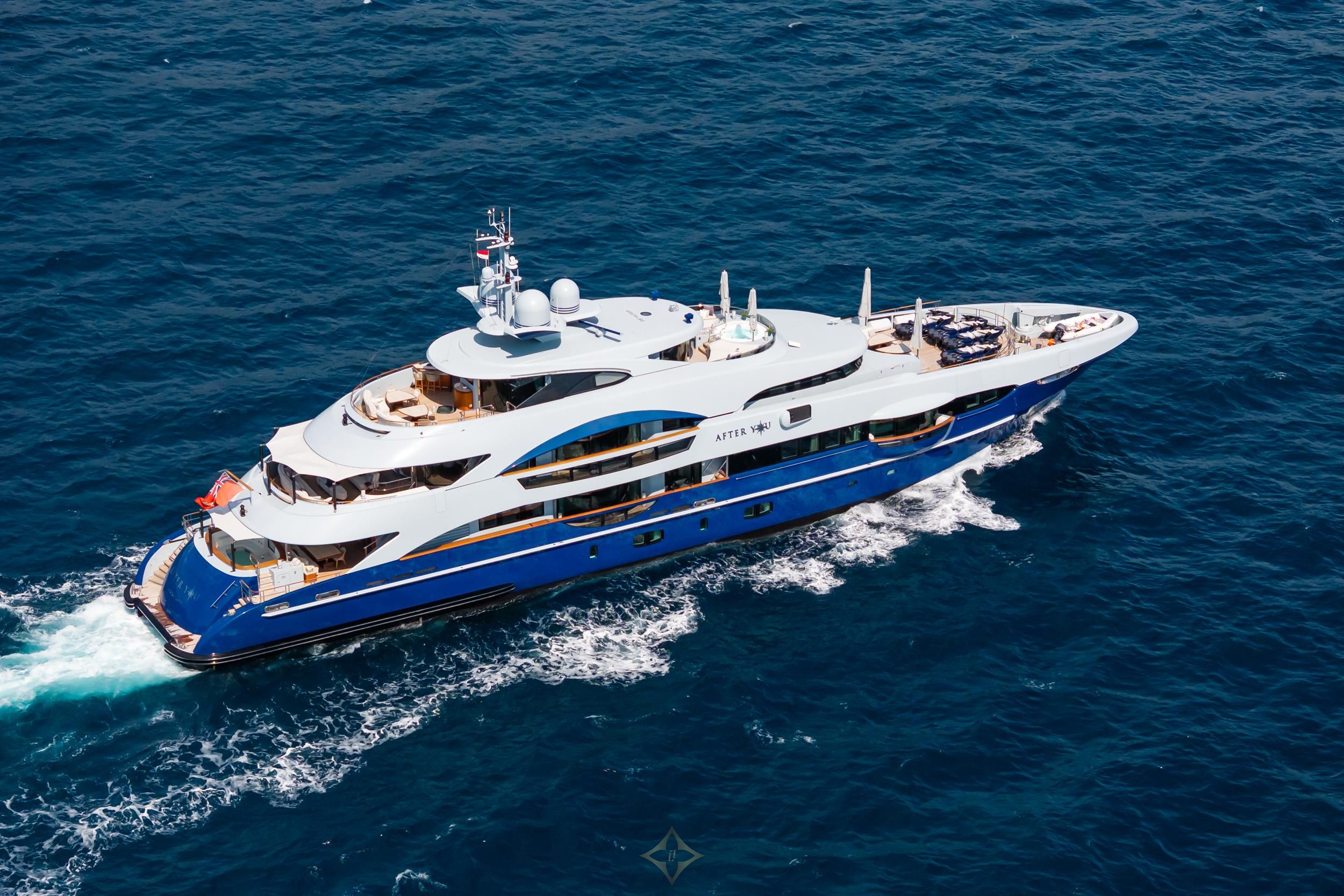 As the largest full custom semi-displacement ever built by Heesen, AFTER YOU is both impressive and innovative. At 55 meters and an exceptional volume of just under 800GT, her expansive interiors were reimagined by designer Mark Berryman during her refit in 2022, while her OMEGA exterior was repainted a vibrant blue that radiates elegance.She accommodates 12 guests in 6 luxurious staterooms, including a full beam master suite on the main deck with balconies on port and starboard as well as a spacious lounge and dressing area. The VIP suite on the lower deck is also full beam and can be converted into 2 double cabins for owners looking for versatility.The floor to ceiling windows provide an abundance of natural light on board, including the stylish main saloon that comes complete with a bar. The bridge deck saloon, with its iconic self-playing piano, also features an aft dining area surrounded by glass doors and offers the perfect indoor dining experience.AFTER YOU’s exterior is just as notable, with her main deck pool that comfortably seats 10 and has a stunning waterfall feature. The sundeck is home to another Jacuzzi, as well as the yacht’s gym setup and spa amenities, including sauna, hammam and massage room.AFTER YOU’s semi-displacement hull can reach an impressive speed of 25 knots, cruising comfortably at 17 knots.