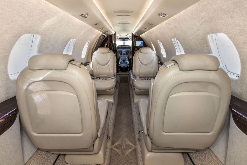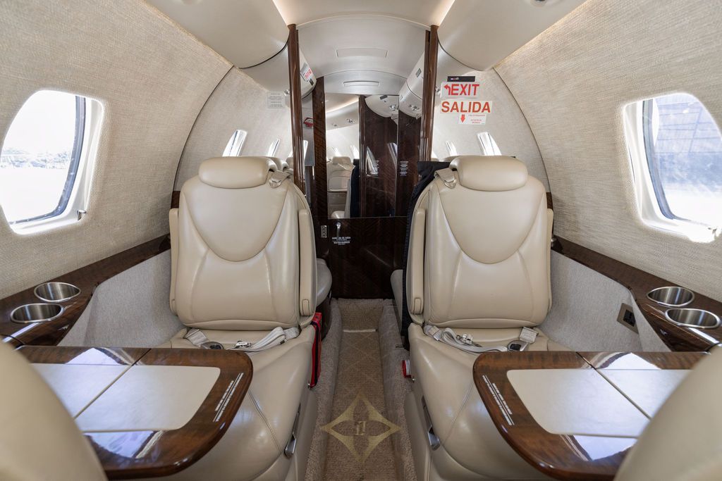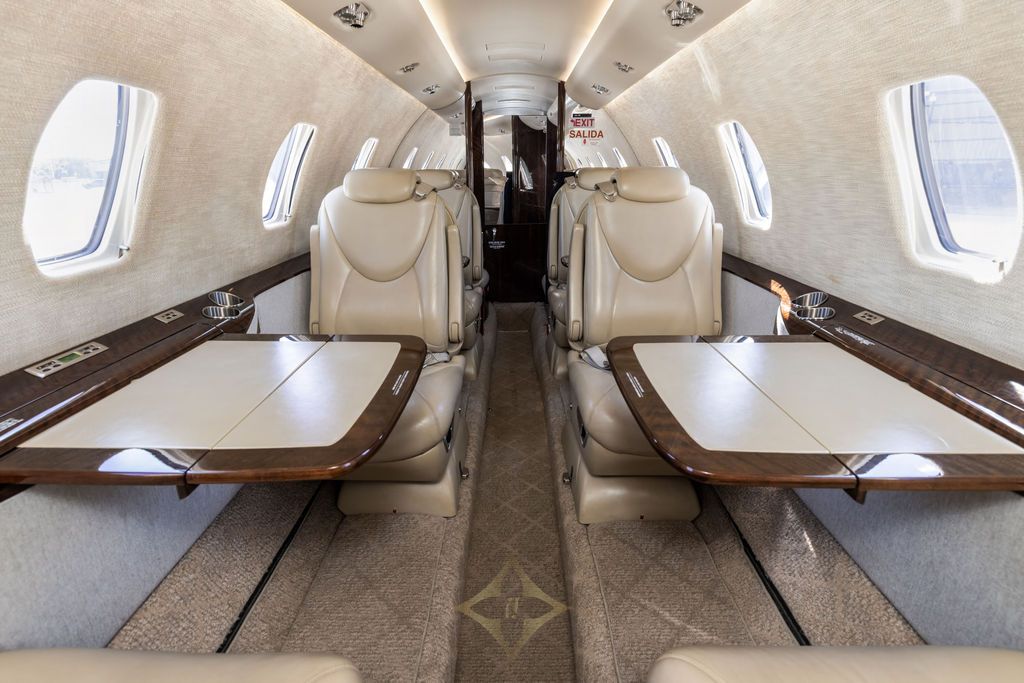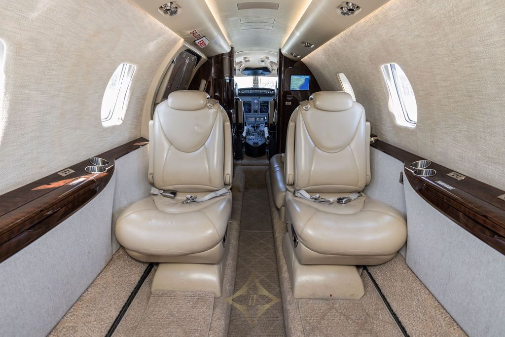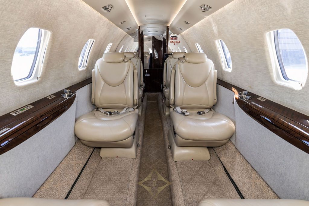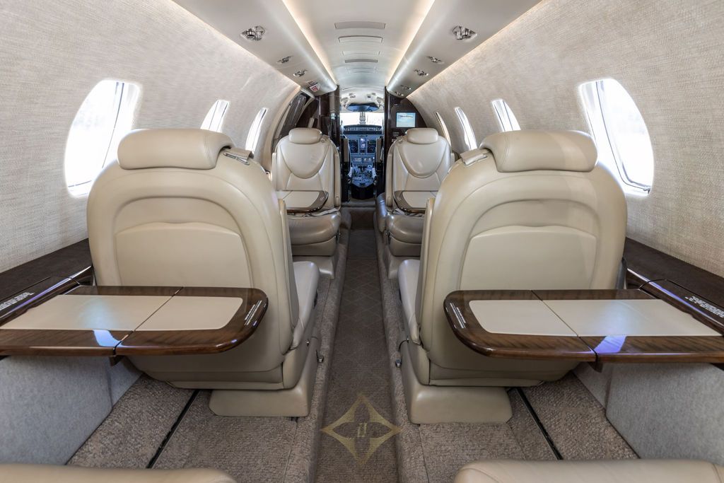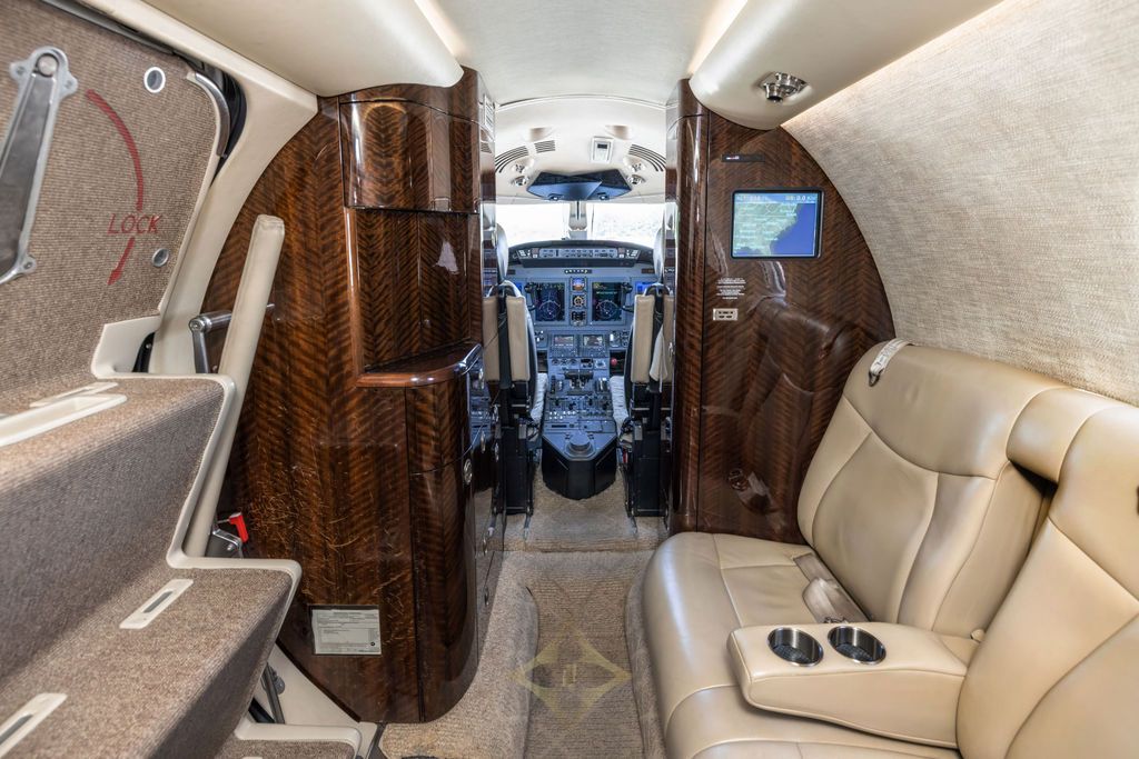 This Citation XLS+ features a spacious and comfortable 9 passenger interior. The cabin is configured with six pedesal-mounted seats arranged in a single club layout, all upholstered in elegant cream leather. Additional seating includes a forward right-hand side-facing two-place divan and an aft side-facing belted seat located across from the lavatory. The cabin is appointed with high-gloss wood veneer finishes throughout, enhancing its refined and luxurious atmosphere. Stowable executive and slimline tables provide convenient surfaces for dining or productivity during flight. Additional amenities include a non-belted, externally serviceable flushing lavatory. Passengers can enjoy in-flight information and entertainment via the Rosen FlightView Moving Map System displayed in the cabin.