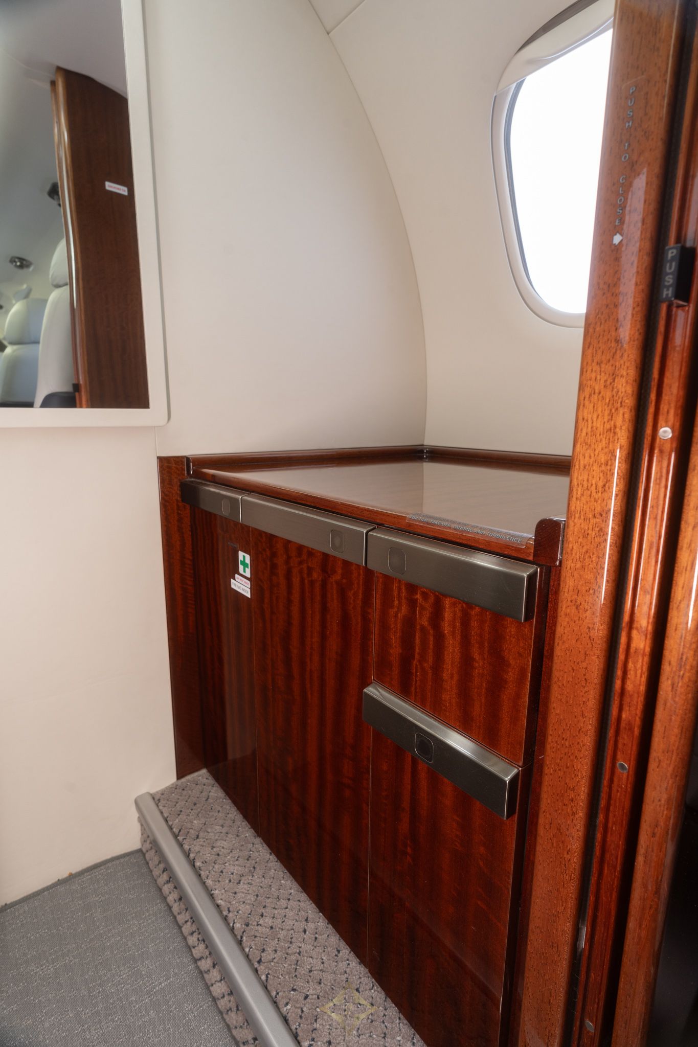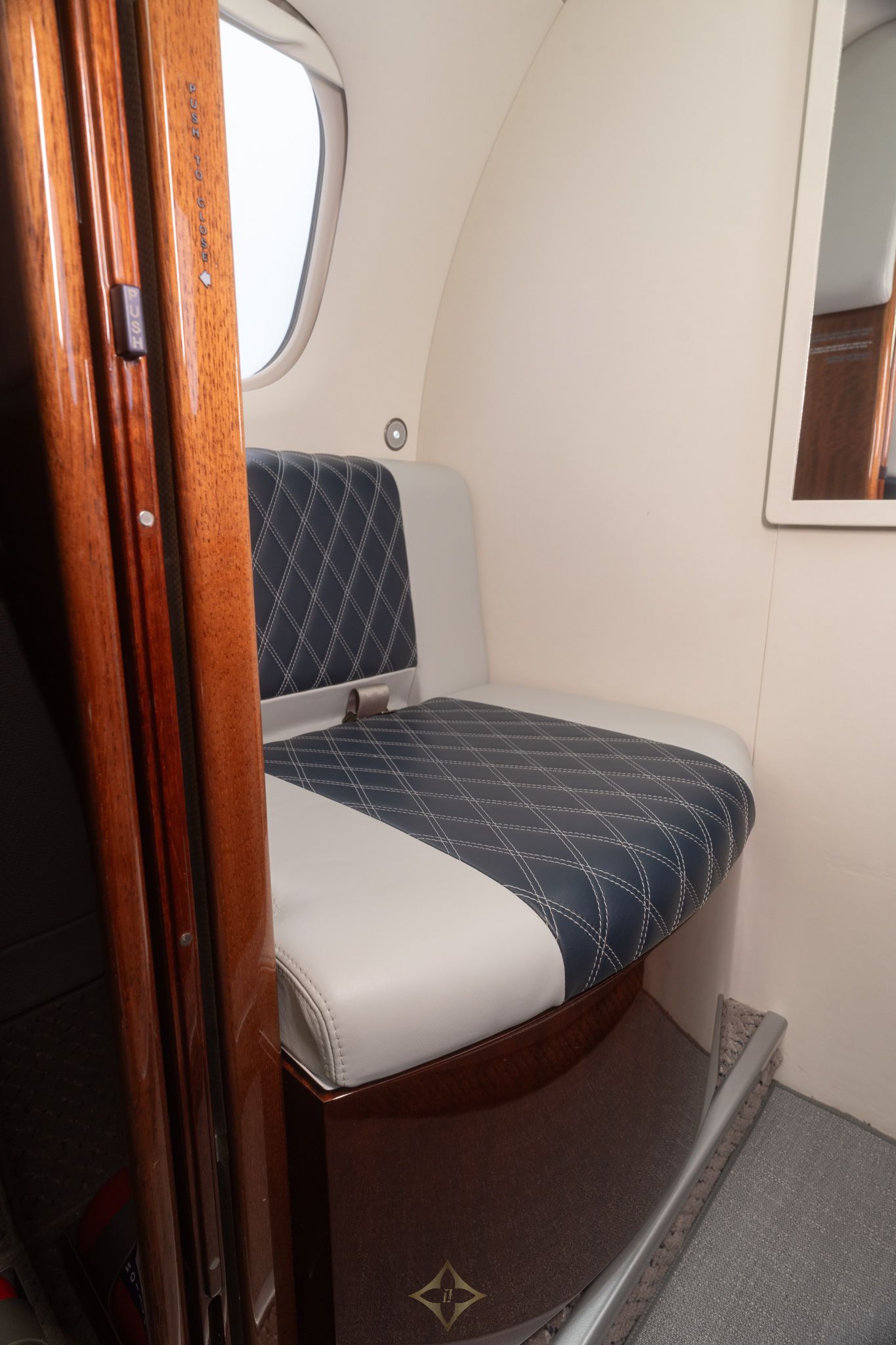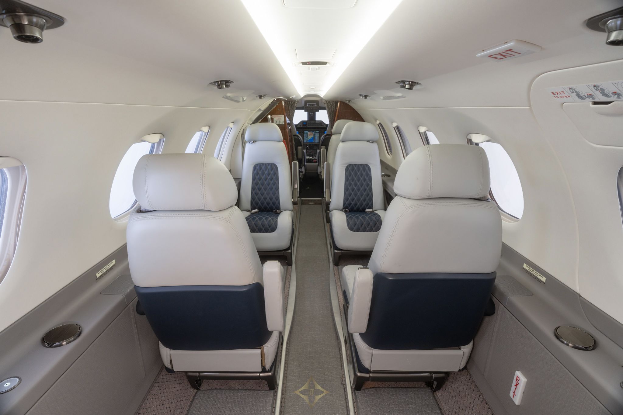 Eight (8) Passenger Configuration including Optional Forward Seventh (7th) and Belted Lavatory All Completed in Grey with Blue Detailing Leather.