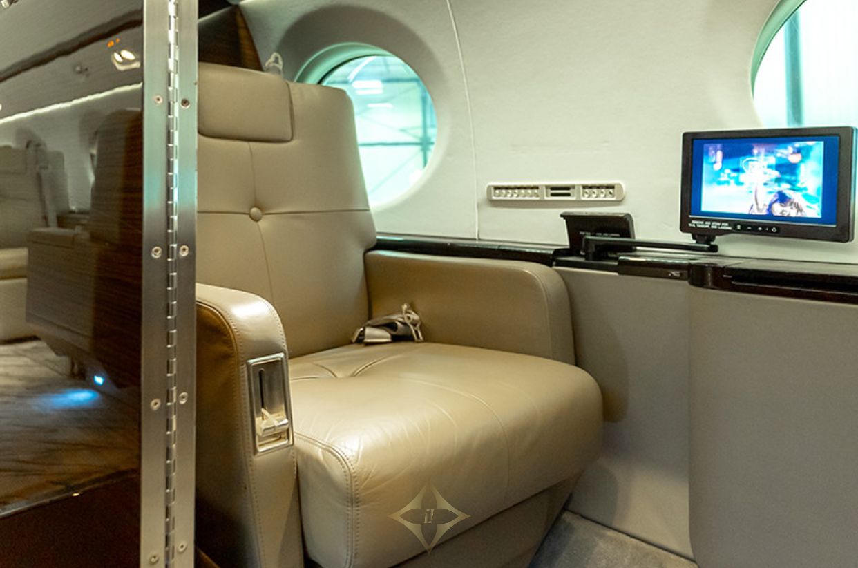 The interior boasts the more popular layout including fwd galley and crew rest area, 4 fwd club chairs, center 4 place conference area with table and two rear birth able couches with privacy partitions. 24” aft bulkhead monitor, 19” fwd LCD monitor and 9” LCD monitors within armrests of each single passenger seats.