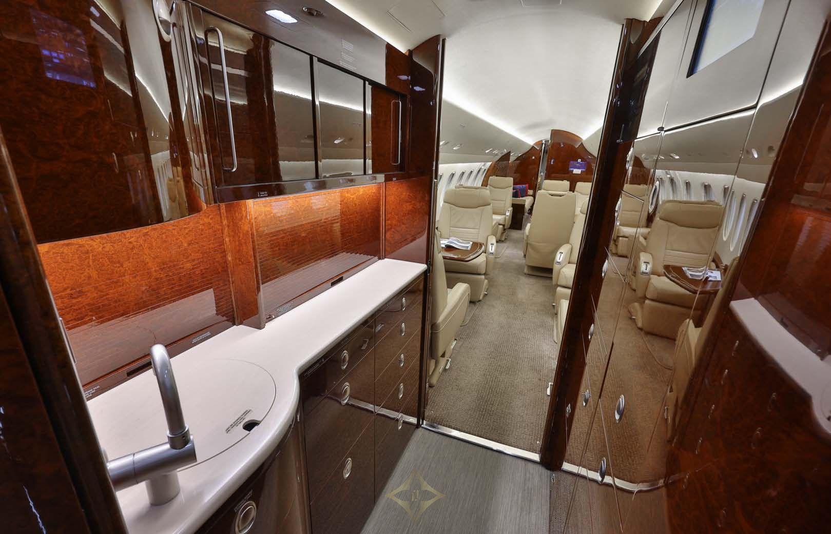 15 passengers: Forward double club, 4 place dining group with electric table & 2 seats opposite, Aft 3 seat 80” electric berthable divan with 2 club seats opposite. Forward & Aft lavs, 3rd crew member seat. Galley pocket door.