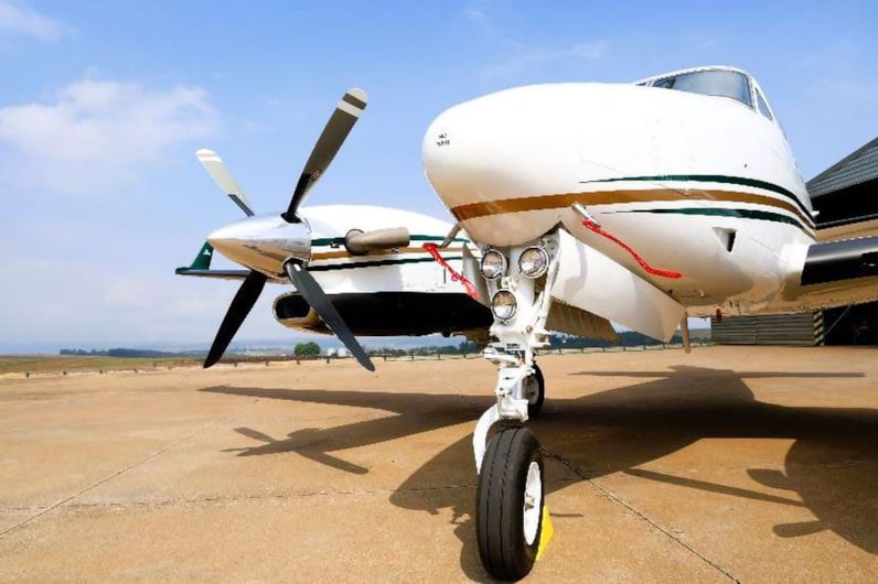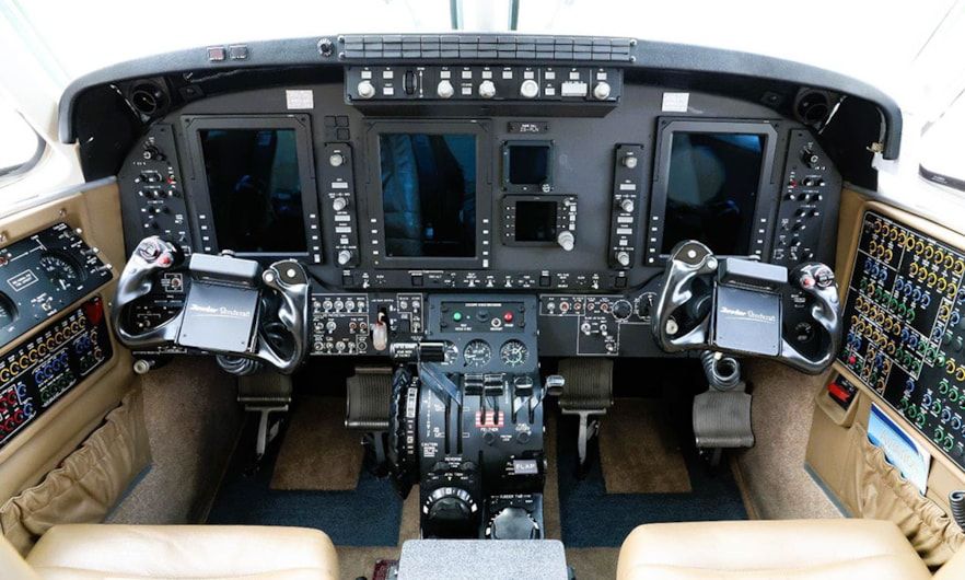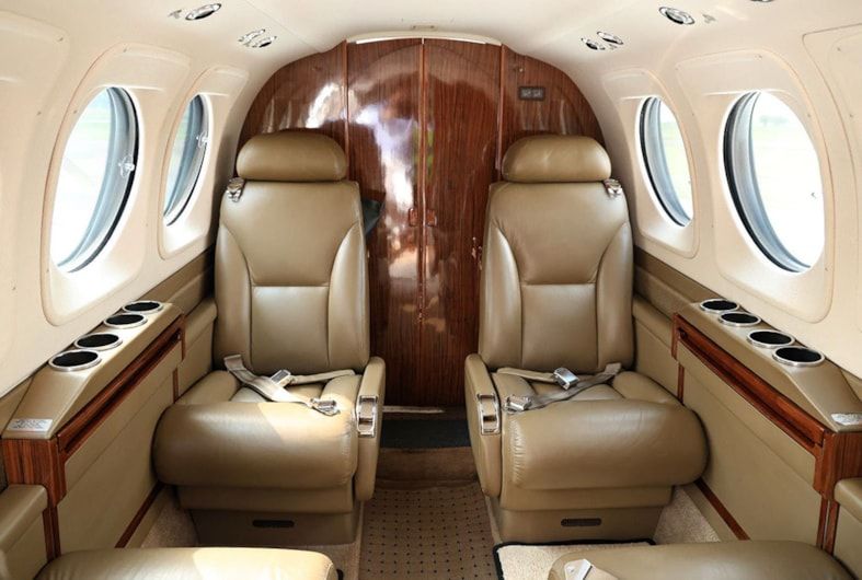 The King Air C90GTx offers a spacious cabin configured for up to Six (6) passengers. The interior features a four-place club arrangement, followed by a belted, side-facing Lavatory and a single seat in the baggage area.