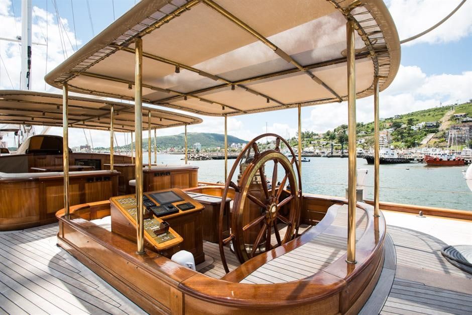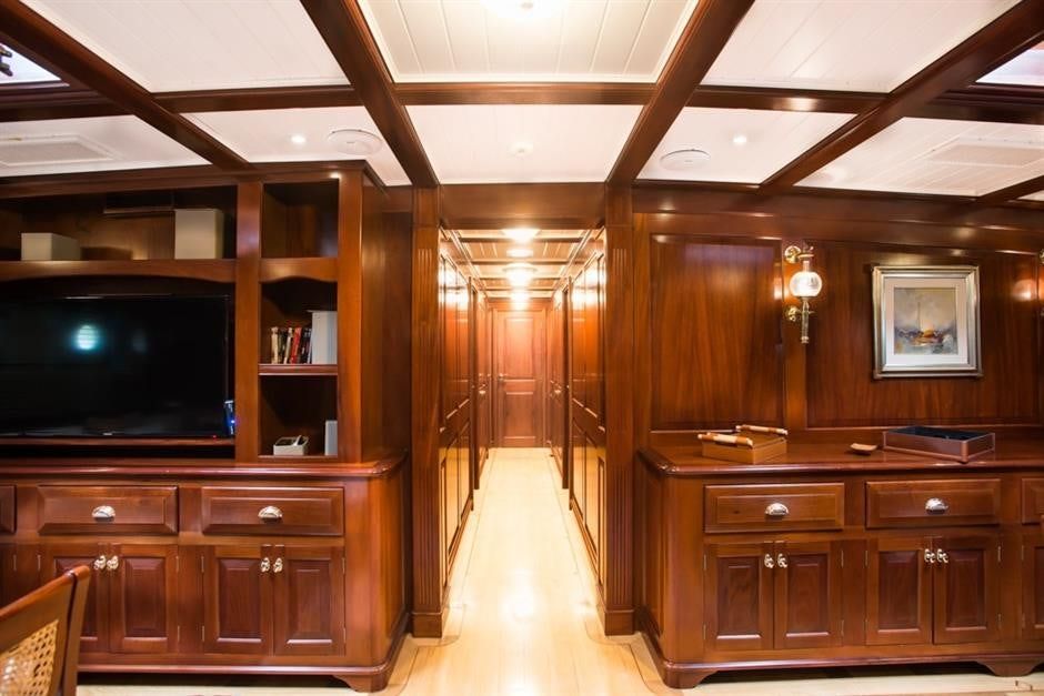 The general exterior and interior, designed by Javier Soto Acebal and refined by experts like Miguel Costa and Ruben Gomez, reflect a blend of sophistication and functionality. A recent refit in 2023-2024 included aesthetic carpentry, rigging paint job, and comprehensive maintenance, ensuring both form and function. The main salon and dining room, spanning the entire beam, feature an elegant and classical style for lounging, meals and experiences. She is illuminated with tasteful old classical lamps along with natural light from the special prisms in the deck. Her entire interior design is meant to be reminiscent of classical 1900s yachts with the use of bronze and wood, including the faucets in the bathrooms and galley.
