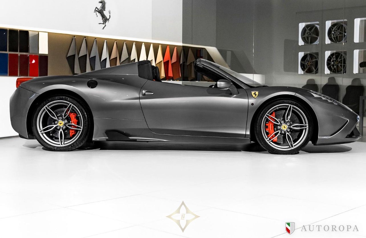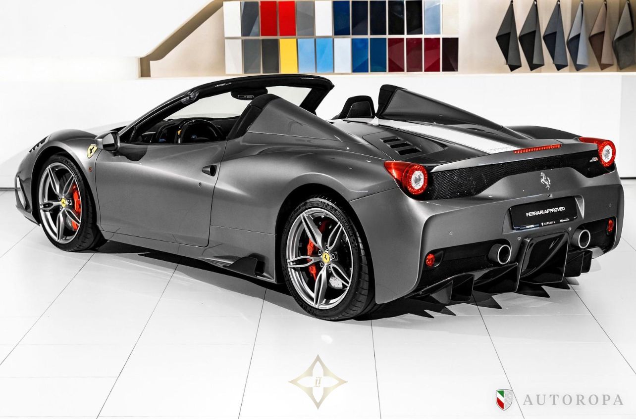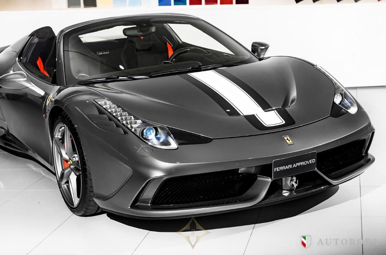 Ferrari 458 Speciale Aperta 2015 Limited Edition 1 of 499 made, Grigio Ferro Met historic special order exterior metallic paint with Nero Alcantara interior, Fully specified as per standard spec on the Lim Ed 458 Speciale Aperta model, Additional options to this vehicle, Interior carpet in Nero Alcantara, Interior mats in Nero Alcantara with 458 Speciale Aperta logos stitched in Grigio Chiaro stitching, Carbon fibre side nolders, Fuel lid in Carbon fibre, Drivers seat adjustment device, Wheel arch panels in Nero Alcantara, Dashboard in Nero Alcantara, Rosso brake calipers, Front air flaps in Carbon fibre, Parcel shelf in Nero Alcantara, Cruise control, Safety belts in Rosso, Central part of Racing seats in Nero Alcantara, Outer b-post in Carbon fibre, Carbon fibre Racing seats, Cavallinos stitched in Rosso in neck rests, Fire extinguisher, Scuderia emblems in fenders, Exterior electrochromic rear view mirrors, Parking camera, Front and rear park sensors, Rev counter in Giallo, Interior stitching in Grigio Chiaro, Upper zone in Nero Alcantar, Navigation with phone connection, Racing Livery in Bianco, The car was delivered as new from Autoropa Official Ferrari dealer in Sweden spring 2015 and have had the same owner since, Annually maintained and in absolute new car condition, In stock ready for delivery, Ferrari Approved tested, Please call or e-mail for more info,