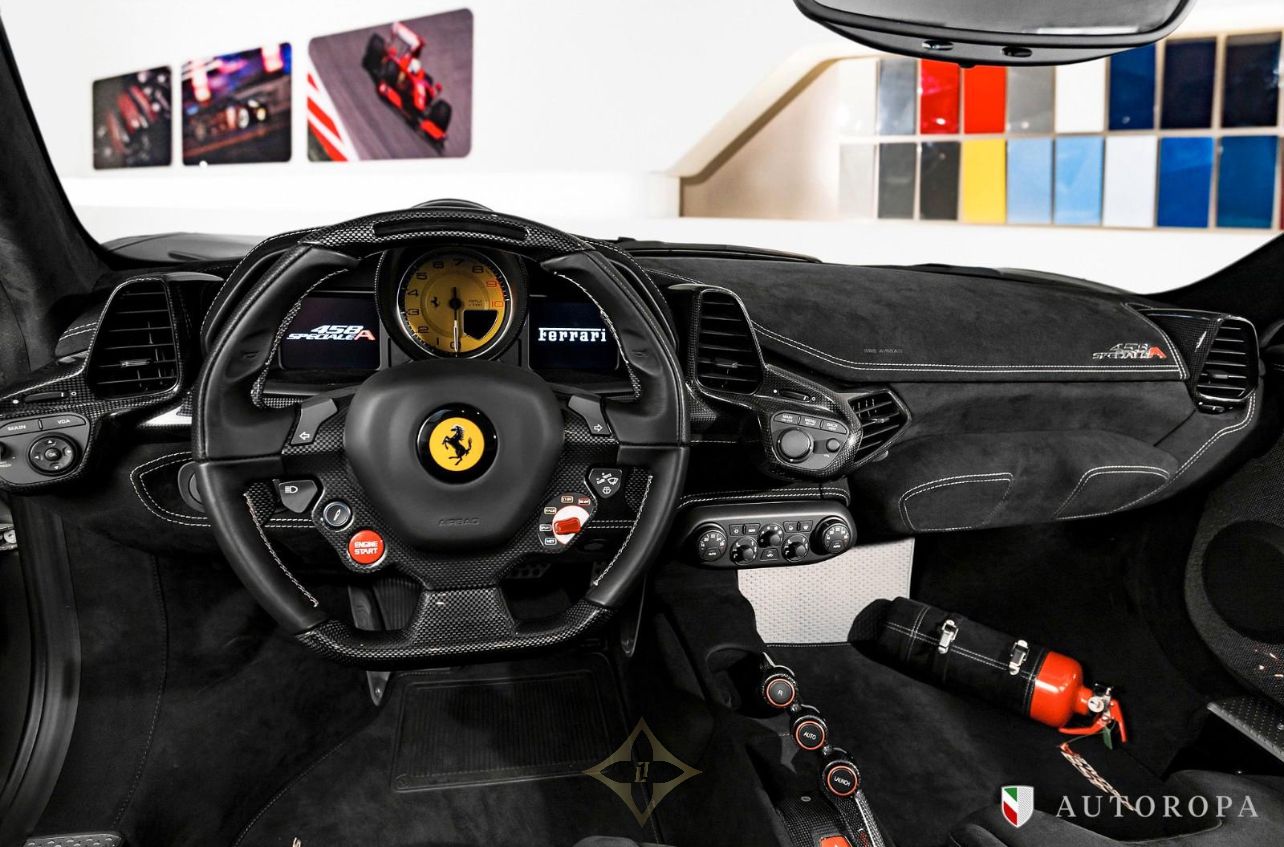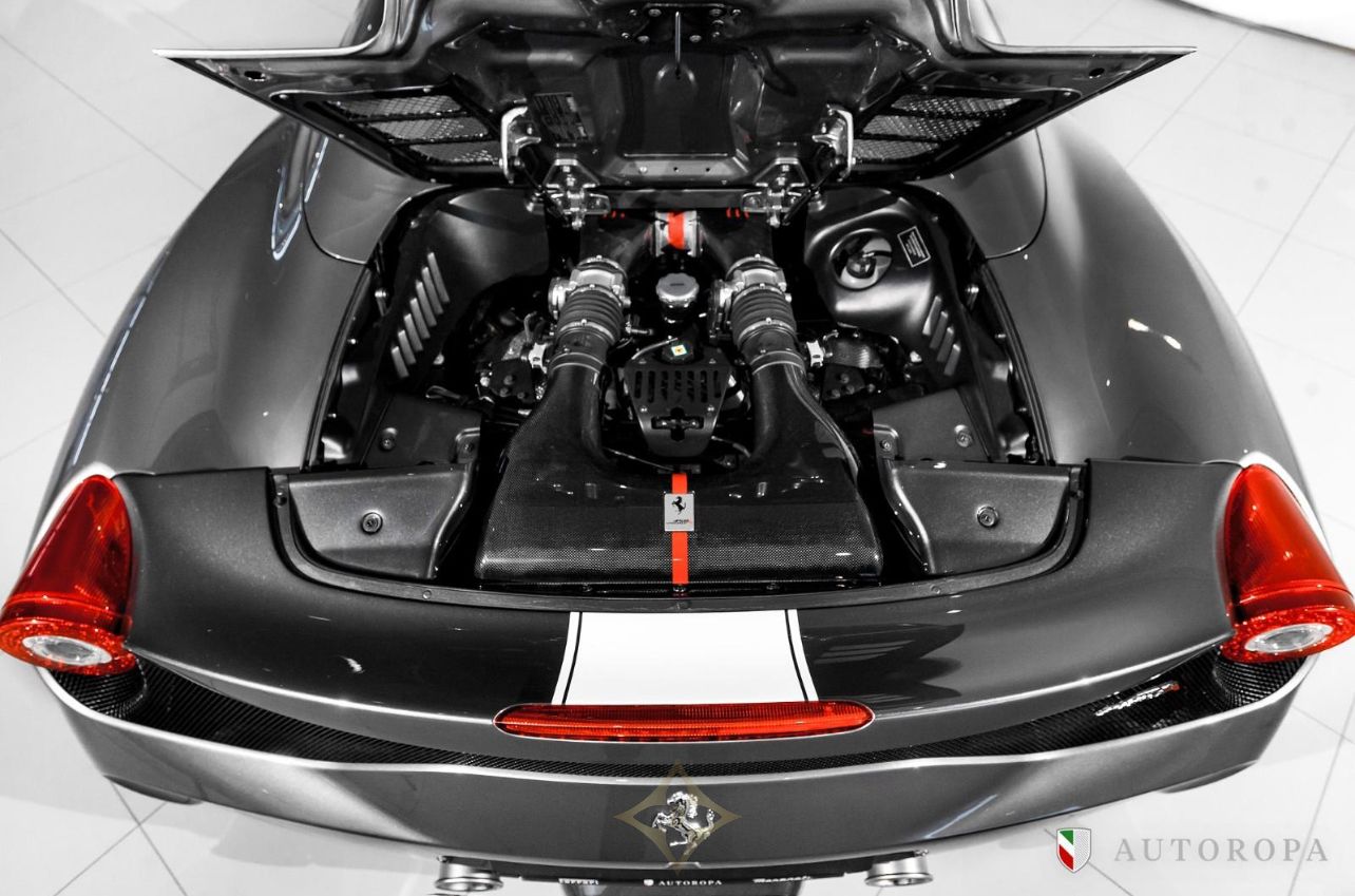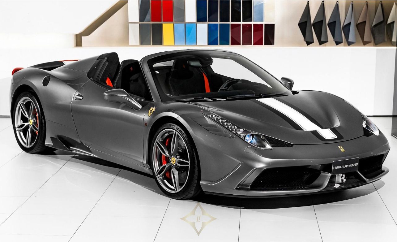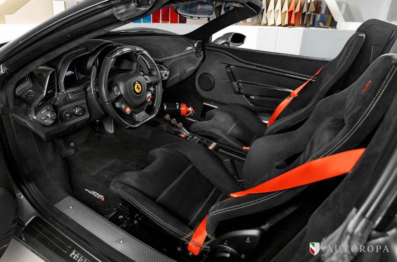 Ferrari 458 Speciale Aperta 2015 Limited Edition 1 of 499 made, Grigio Ferro Met historic special order exterior metallic paint with Nero Alcantara interior, Fully specified as per standard spec on the Lim Ed 458 Speciale Aperta model, Additional options to this vehicle, Interior carpet in Nero Alcantara, Interior mats in Nero Alcantara with 458 Speciale Aperta logos stitched in Grigio Chiaro stitching, Carbon fibre side nolders, Fuel lid in Carbon fibre, Drivers seat adjustment device, Wheel arch panels in Nero Alcantara, Dashboard in Nero Alcantara, Rosso brake calipers, Front air flaps in Carbon fibre, Parcel shelf in Nero Alcantara, Cruise control, Safety belts in Rosso, Central part of Racing seats in Nero Alcantara, Outer b-post in Carbon fibre, Carbon fibre Racing seats, Cavallinos stitched in Rosso in neck rests, Fire extinguisher, Scuderia emblems in fenders, Exterior electrochromic rear view mirrors, Parking camera, Front and rear park sensors, Rev counter in Giallo, Interior stitching in Grigio Chiaro, Upper zone in Nero Alcantar, Navigation with phone connection, Racing Livery in Bianco, The car was delivered as new from Autoropa Official Ferrari dealer in Sweden spring 2015 and have had the same owner since, Annually maintained and in absolute new car condition, In stock ready for delivery, Ferrari Approved tested, Please call or e-mail for more info,