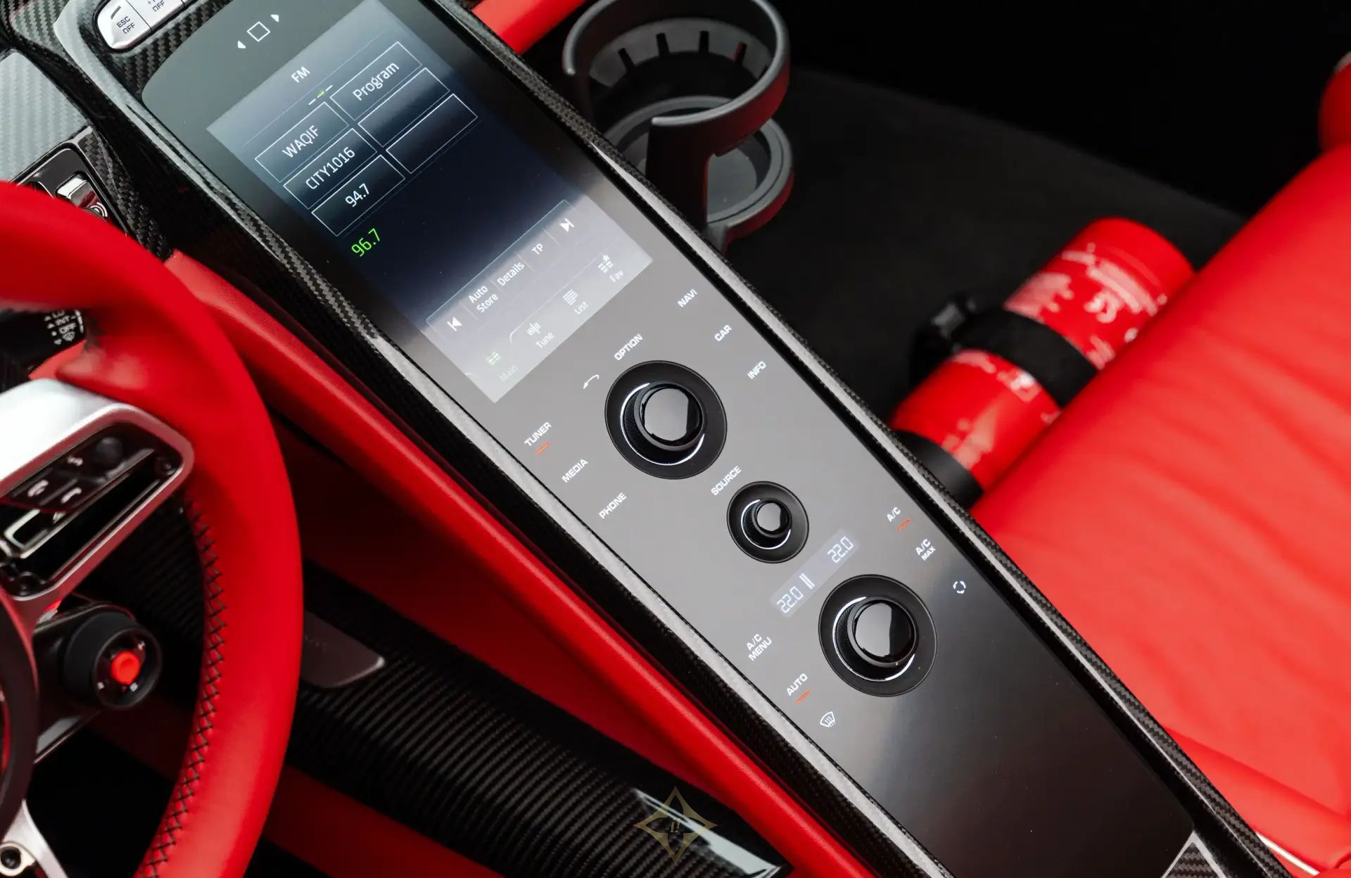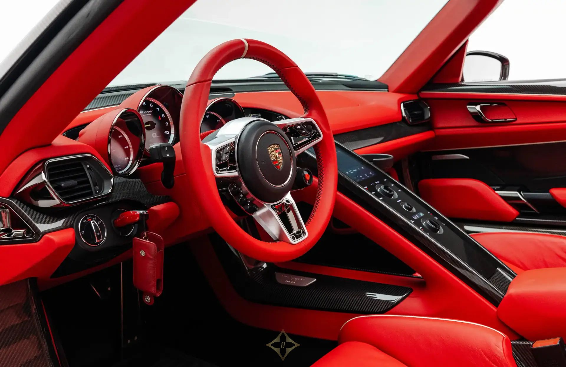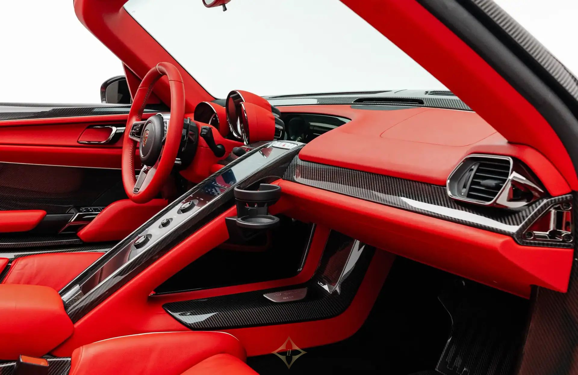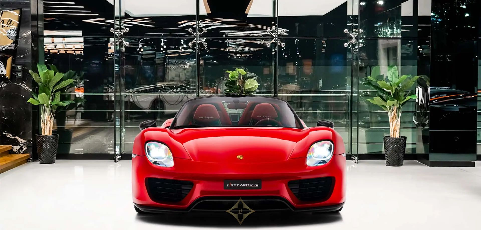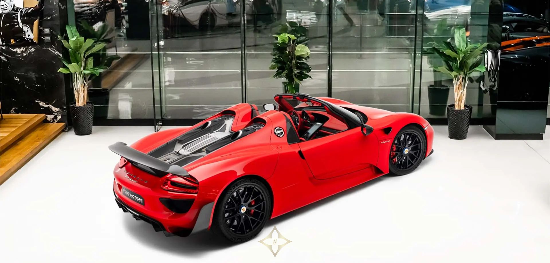 Porsche 918 Spyder Weissach for sale PRICE: AED 7,499,995 Price excludes VAT – Export only Porsche 918 Spyder Weissach VAT Type: Not applicable Year: 2015 Location: Dubai Address: Sheikh Zayed Road, Dubai Mileage: 7,510 km Body Style: Convertible Condition: Used – Excellent condition VIN: FMC-11695 Color: Red Interior Color: Red Internal Reference: FMC-11695 Price (USD): $2,042,204 General Characteristics Energy: Plug-in Hybrid (Petrol + Electric) Maximum Power: 887 hp (652 kW) Combined Fuel Consumption: 3.0–3.1 L/100 km CO₂ Emissions: 70–72 g/km Transmission: 7-speed PDK dual-clutch automatic Body Style: Convertible (Roadster) End of Production: June 2015 Engine Name: 4.6L V8 + Dual Electric Motors Architecture: Mid-engine, all-wheel drive Fuel System: Direct fuel injection Injection: Gasoline direct injection Displacement: 4,593 cc Maximum Power Output: 608 hp (V8) + 279 hp (electric motors) Maximum RPM: 8,500 rpm Maximum Torque: 1,280 Nm Number of Valves: 32 Bore x Stroke: 95.0 mm x 81.0 mm Compression Ratio: 13.5:1 Engine Position: Mid-mounted Dimensions and Weight Length: 4,643 mm Width: 1,940 mm (2,053 mm with mirrors) Height: 1,167 mm Wheelbase: 2,730 mm Fuel Tank Capacity: 70 liters Weight Curb Weight: 1,674 kg Gross Vehicle Weight: 1,900 kg Seating and Cargo Seating Capacity: 2 Trunk Volume: 110 liters ——— F1rst Motors Address: Danube Building, 409 Sheikh Zayed Rd, Al Quoz 1, Dubai, UAE Email: info@f1rstmotors.com Phone: +971-4-320-1030