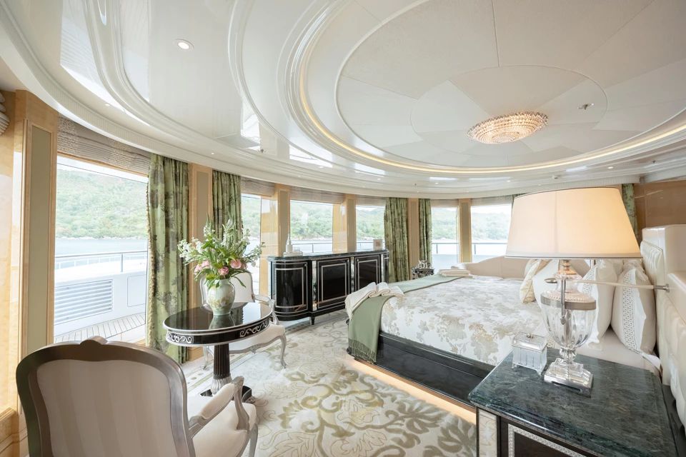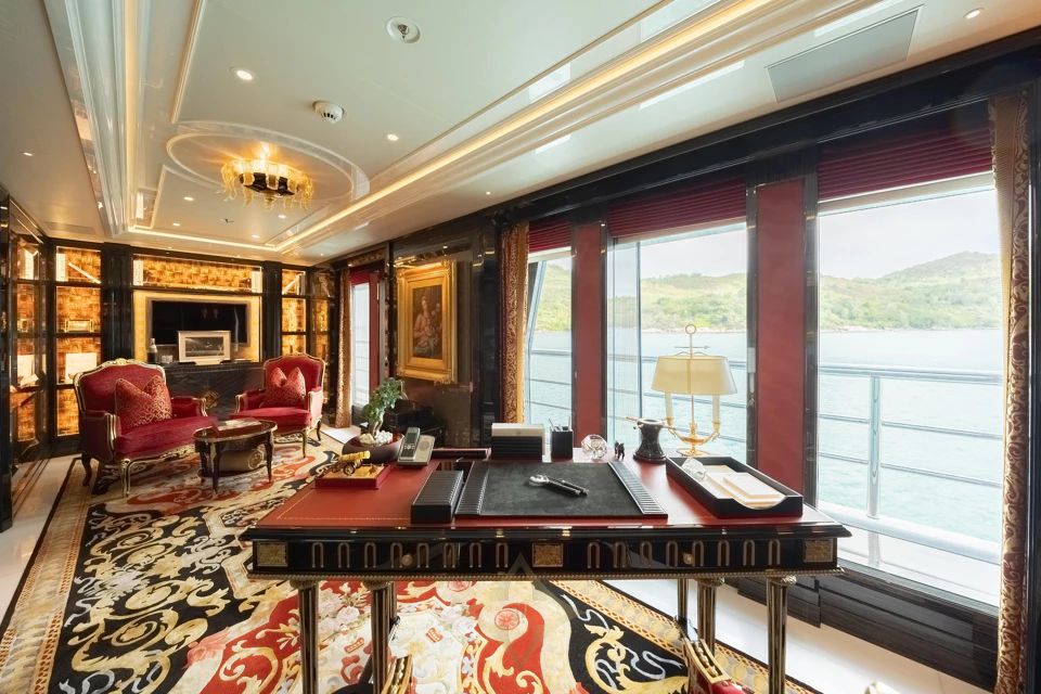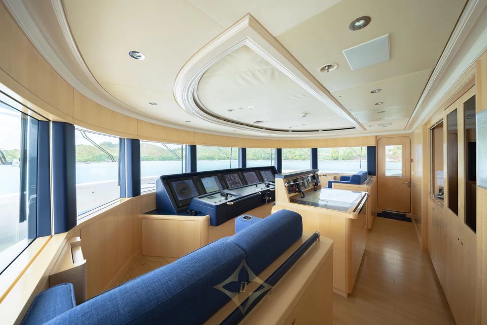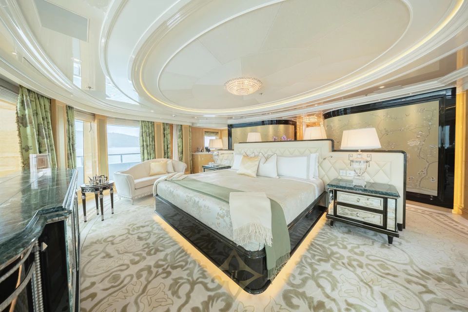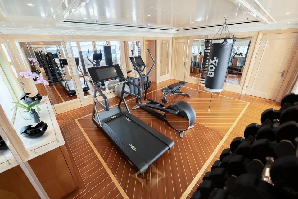 Interiors by Winch Design accommodate up to 12 guests across six staterooms. The Owner’s deck features a private Master Suite with an office, while two VIP staterooms are located on the main deck. Two further double staterooms and one twin stateroom are found on the lower deck. The layout is complemented by an elevator to connect all decks effortlessly.