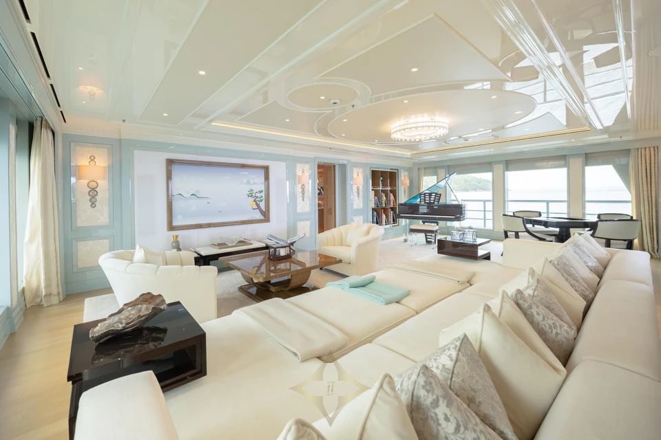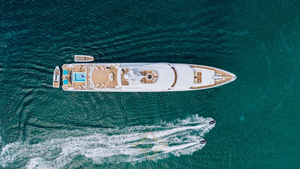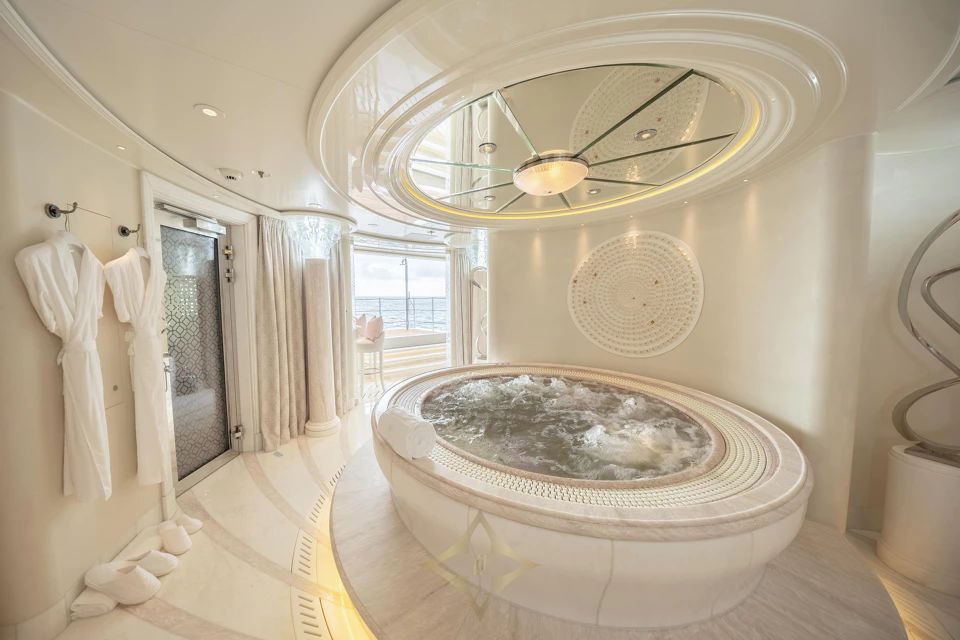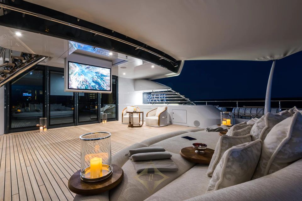 Designed by Tim Heywood, PLVS VLTRA boasts impressive amenities on every deck, including a beach club with a spa featuring a massage room and hammam. On the aft deck is a large swimming pool. The sundeck offers a Jacuzzi and lounge spaces with panoramic views, while the bridge deck features an open-air cinema for entertainment under the stars.