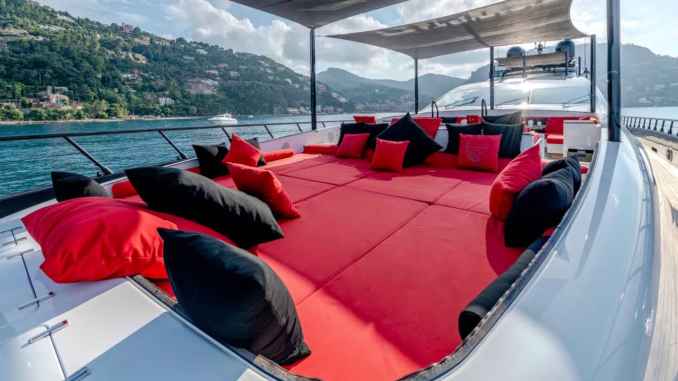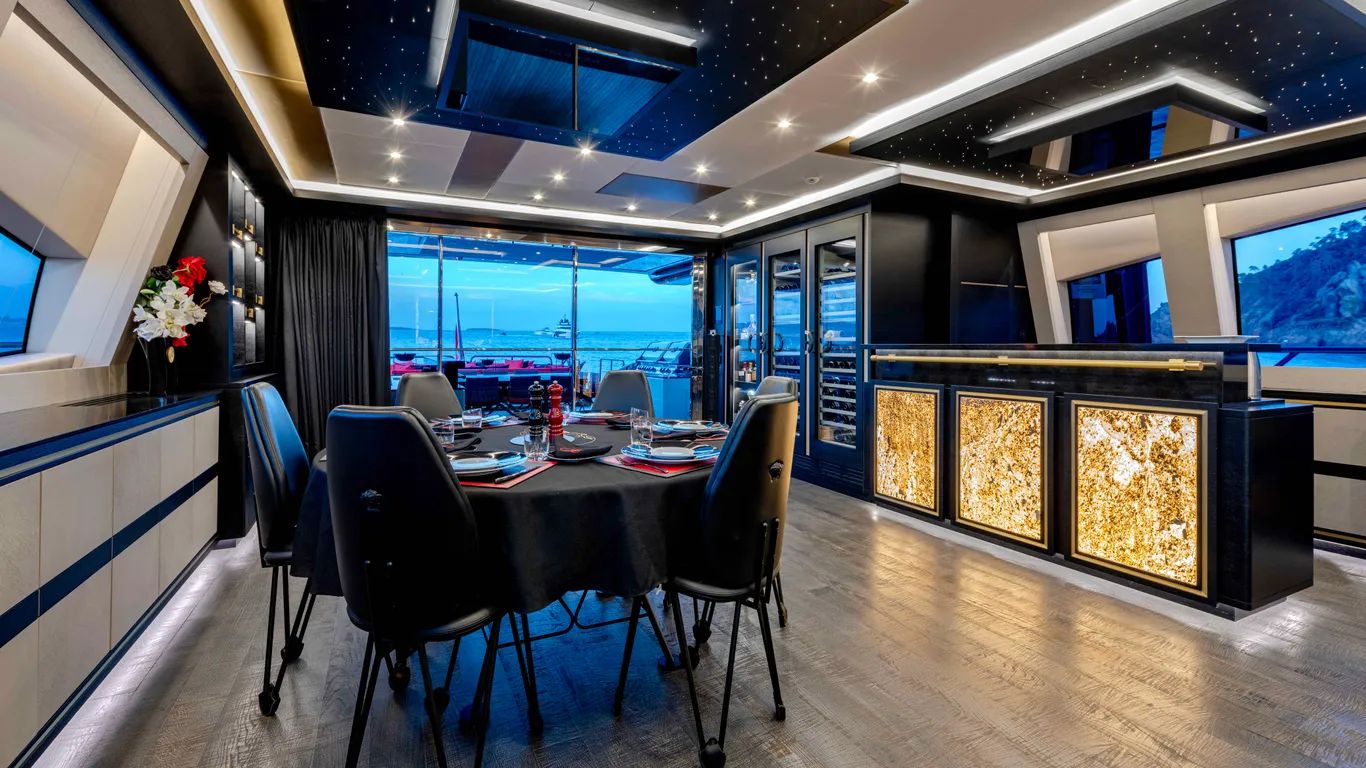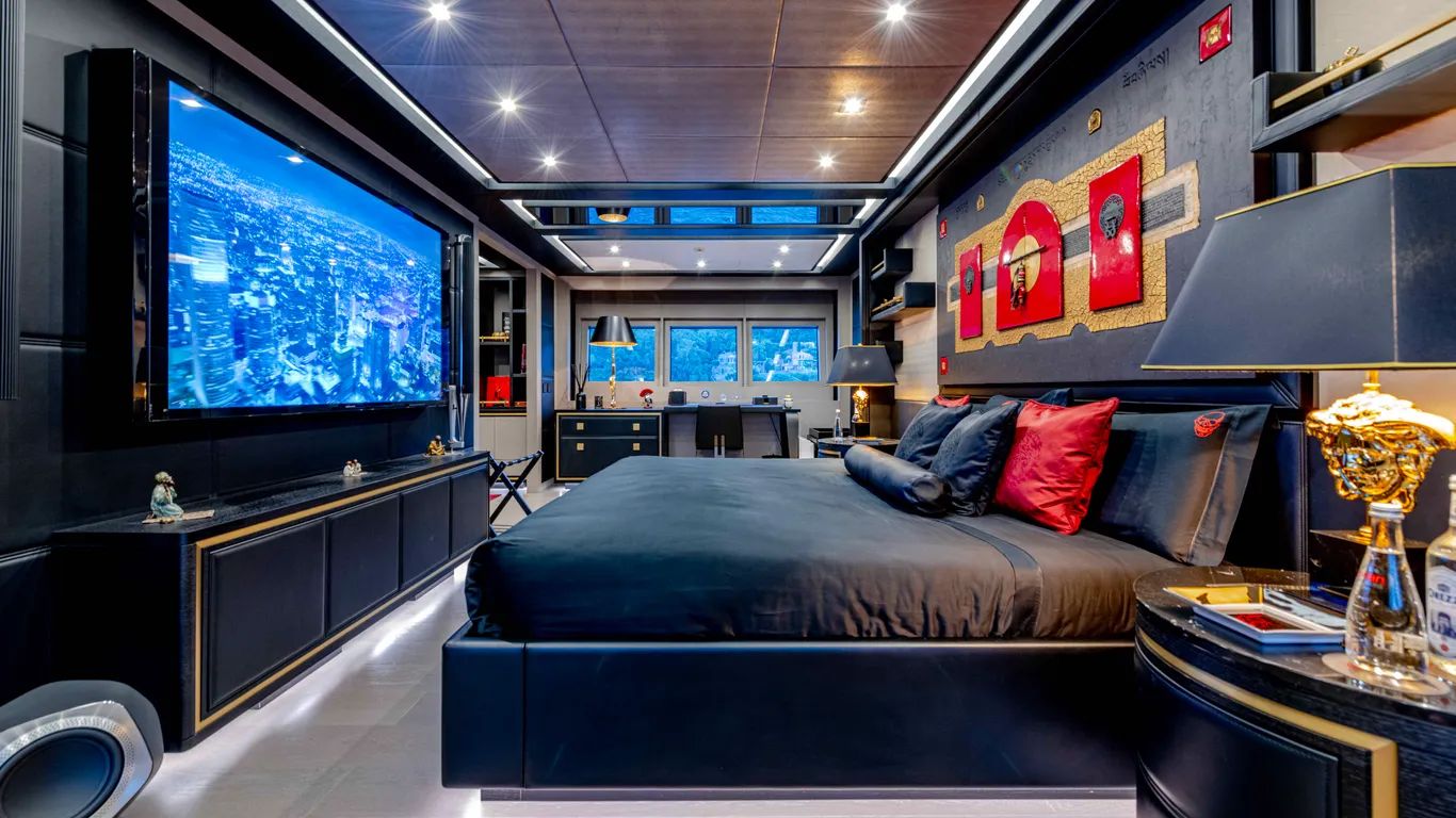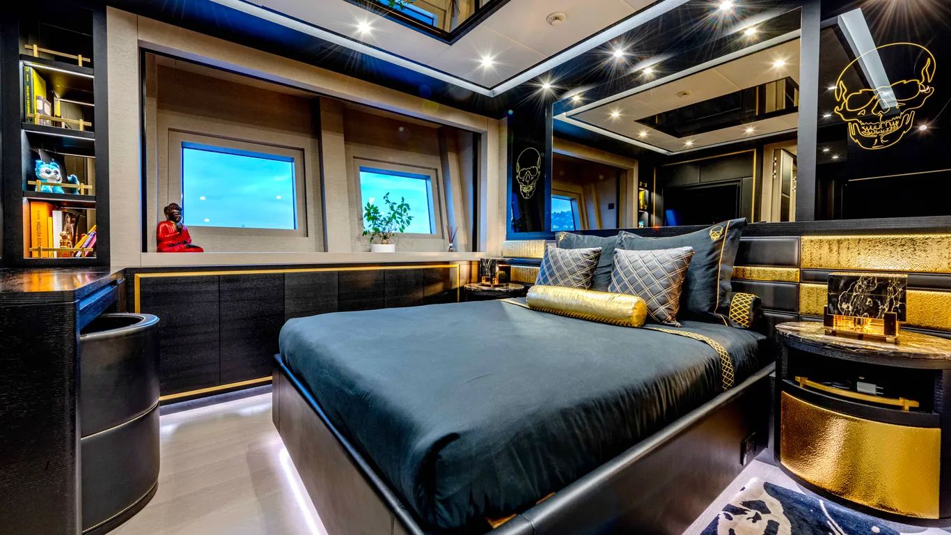 On the lower deck, a full-beam master suite with a private office and dressing room is complemented by a gym, cinema, and three further guest cabins, including a VIP. Black Legend can sleep up to ten guests.