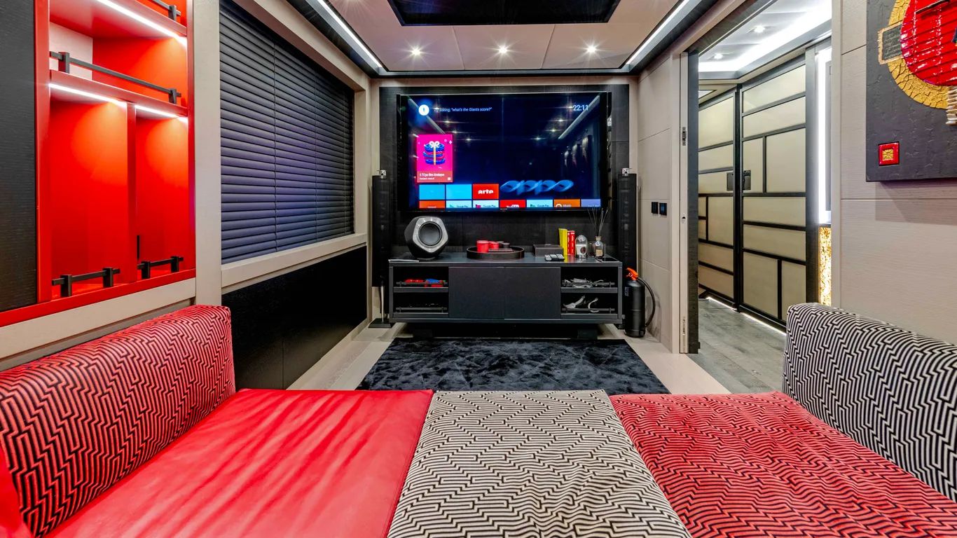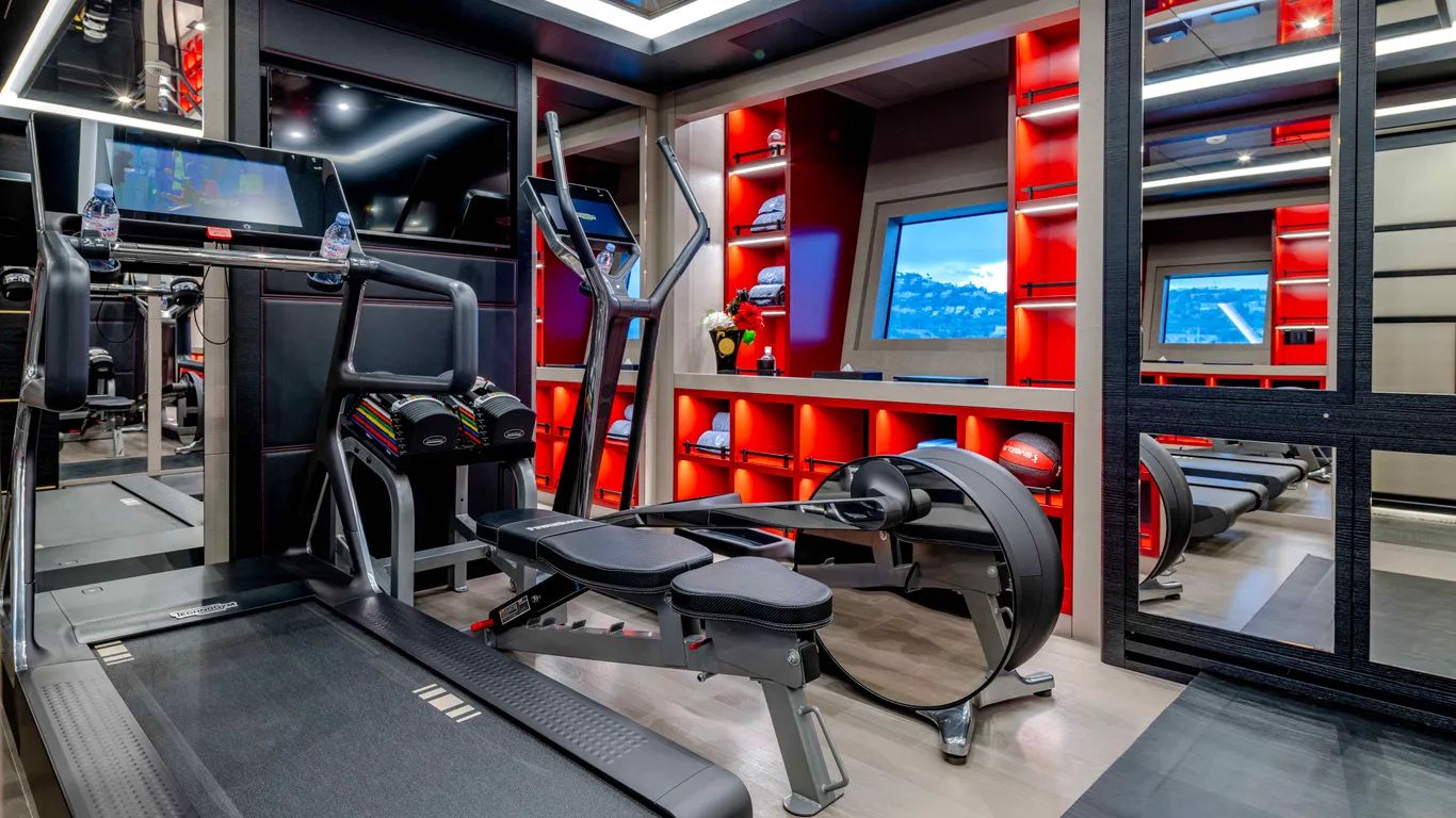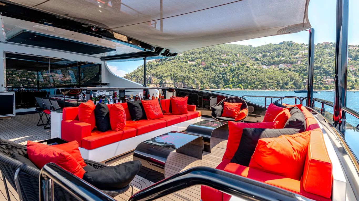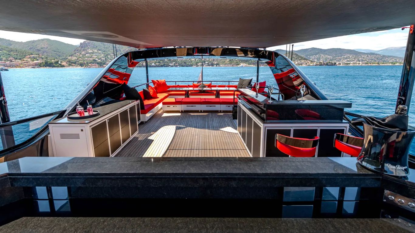 On the lower deck, a full-beam master suite with a private office and dressing room is complemented by a gym, cinema, and three further guest cabins, including a VIP. Black Legend can sleep up to ten guests.