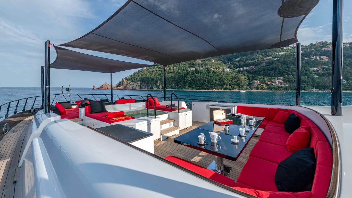 Key highlights of the sprawling exterior deck spaces include an incredible foredeck area with a Jacuzzi, forward view seating and sunbeds with awnings. The sundeck is an ideal entertainment space, with sunpads, a cocktail bar and a DJ booth. On the lower deck, the beach club and stern platform provide waterside relaxation, while explorers and thrill seekers will appreciate the garage setup for watersports, chase boats and tenders.
