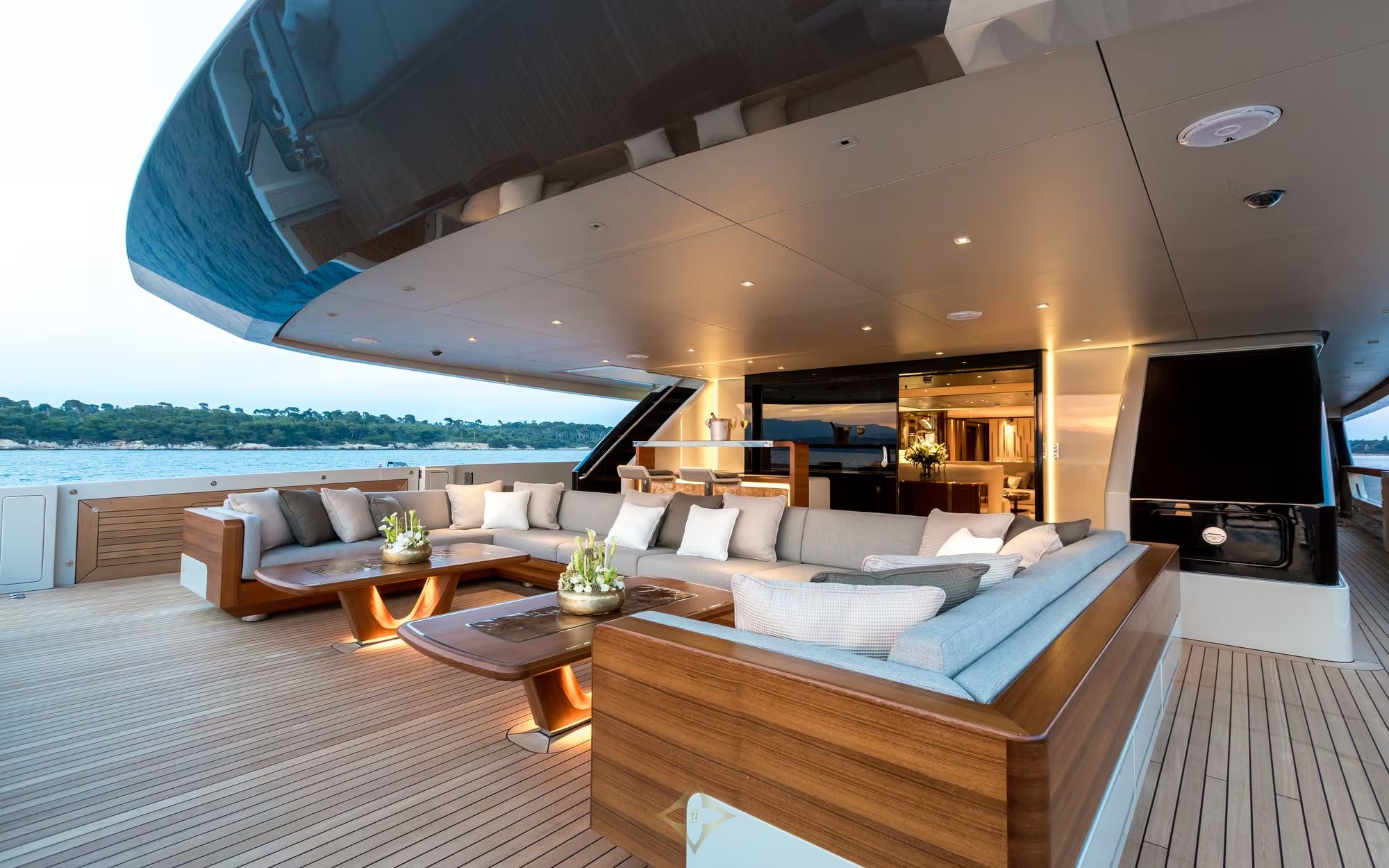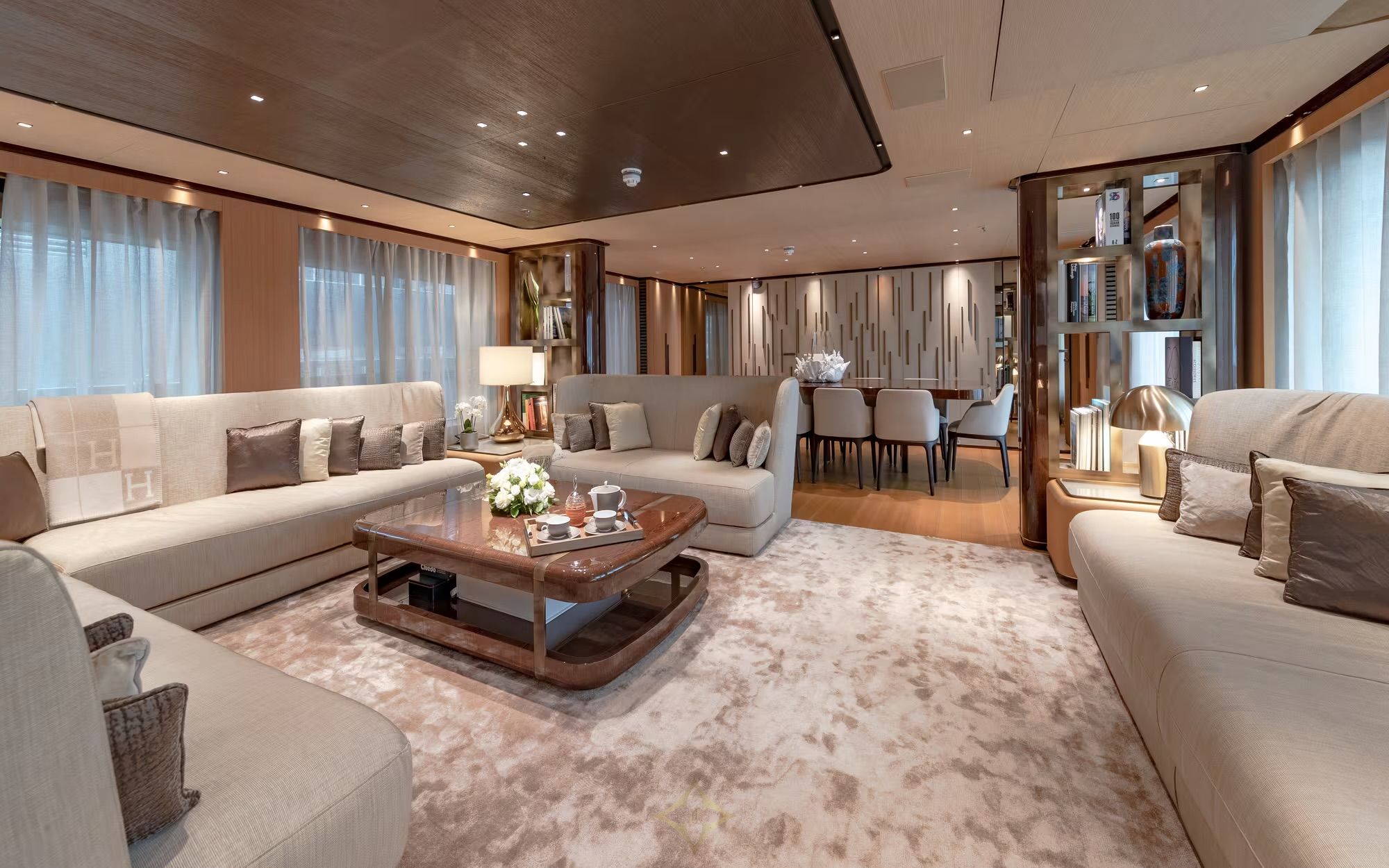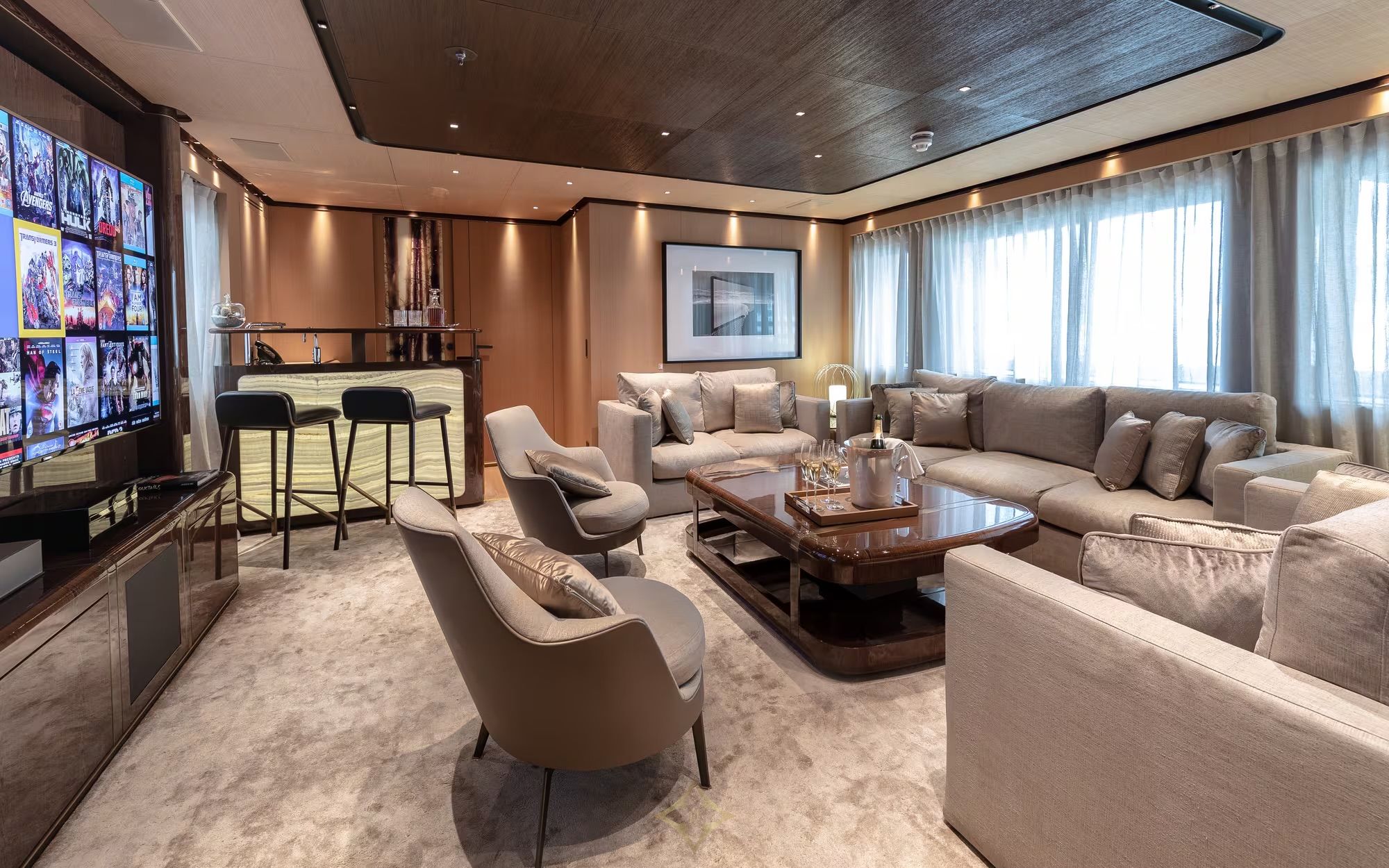 Built by Italian shipyard Tankoa Yachts, VERTIGE showcases design by Francesco Paszkowski. Her interiors blend teak and polished rosewood for a calm, sophisticated style.