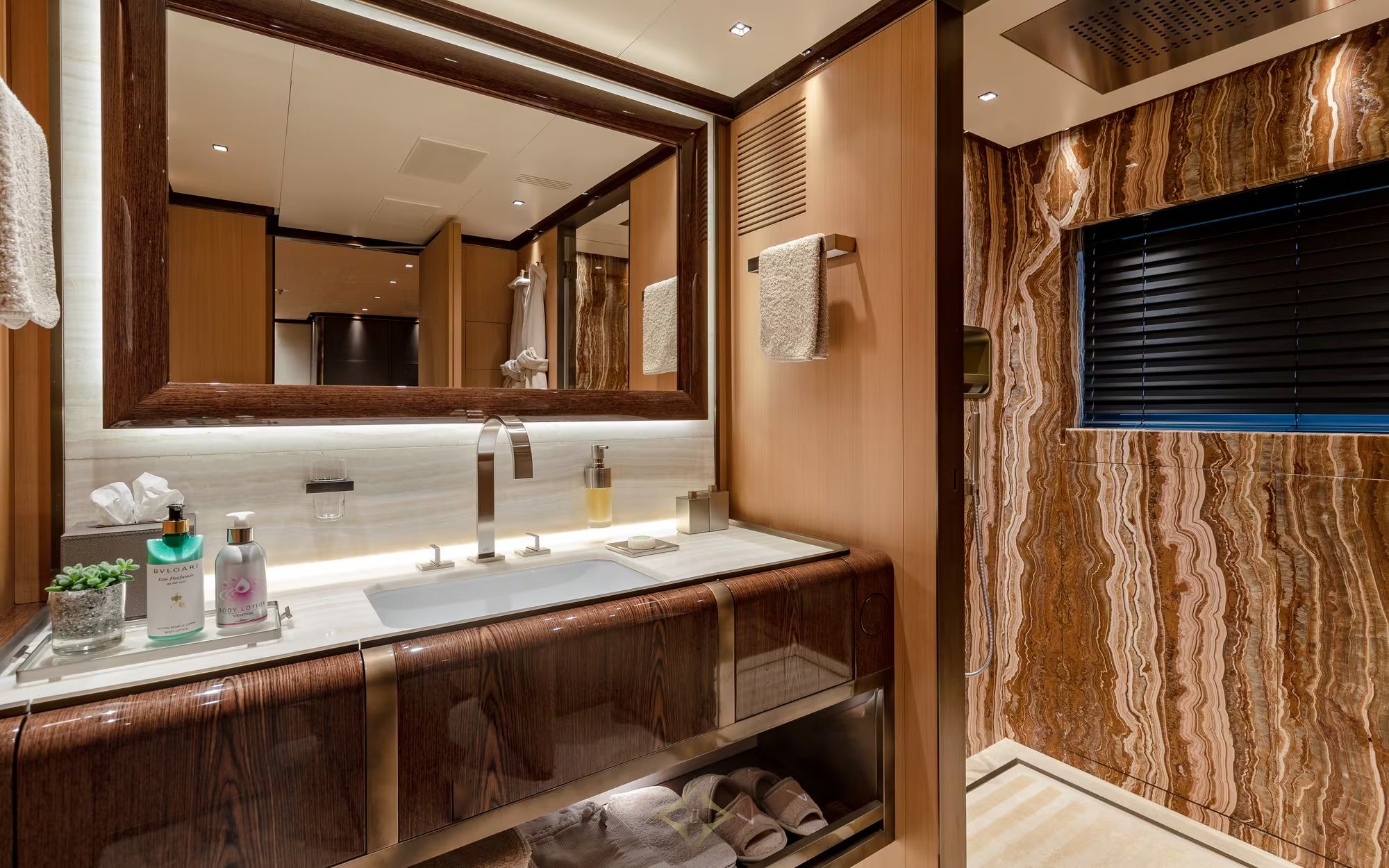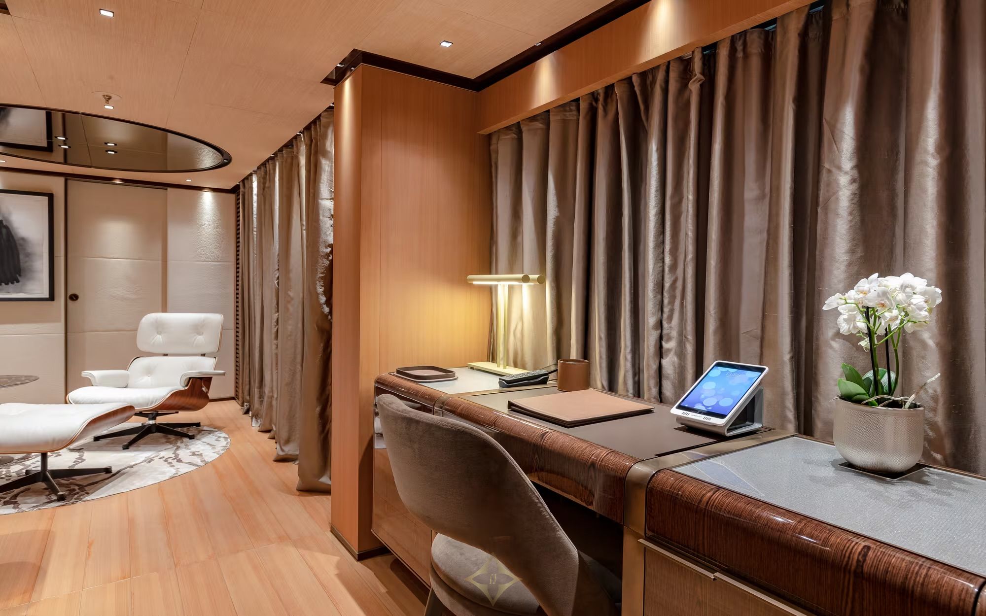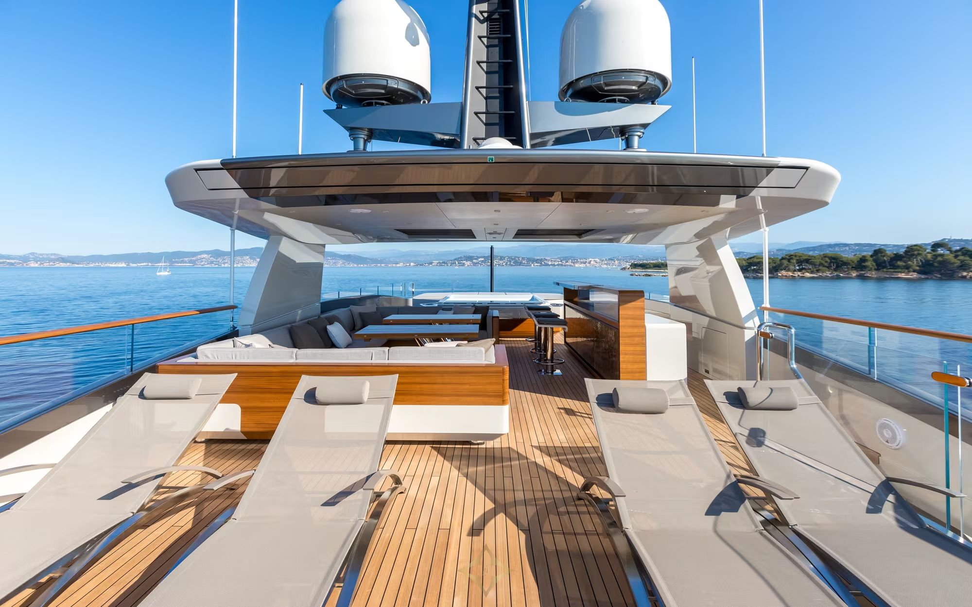 Built by Italian shipyard Tankoa Yachts, VERTIGE showcases design by Francesco Paszkowski. Her interiors blend teak and polished rosewood for a calm, sophisticated style.
